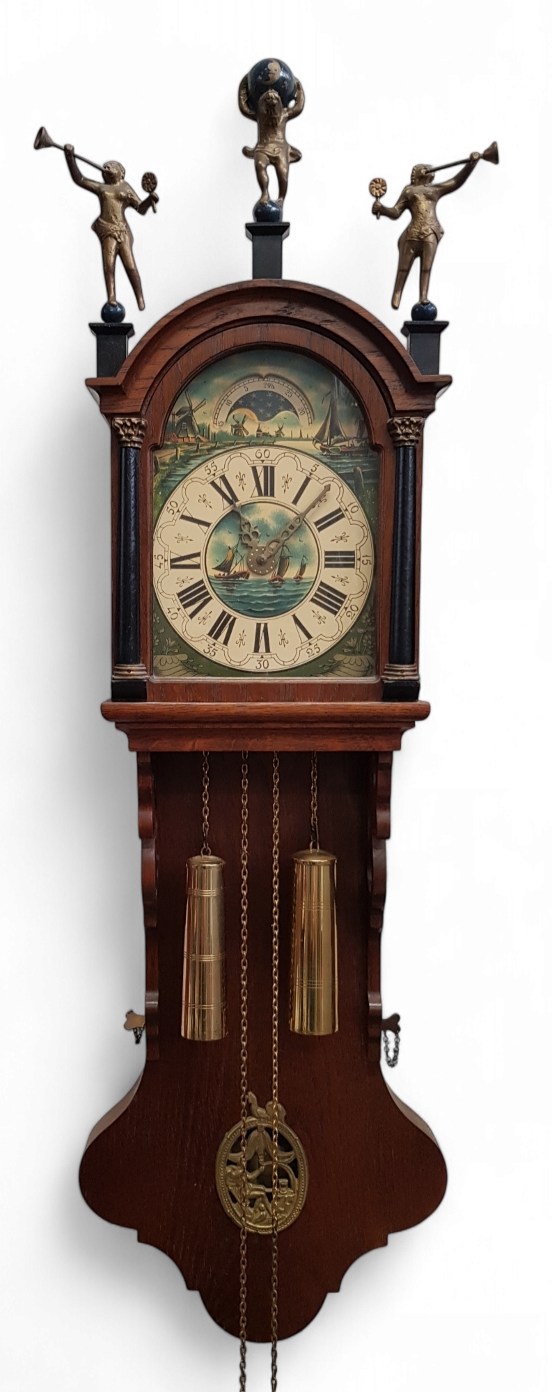 Friese staartklok met messing gewichten en figuren, tweede helft 20e eeuw. De wijzerplaat toont Romeinse cijfers en een kleurrijke voorstelling met zeilschepen en windmolens. Bovenop staan Atlas met hemelbol en twee keer de faam. Uitgevoerd met machinaal vervaardigde kast, beschilderde wijzerplaat en gewichtsaandrijving met kettingen. Klaar om te bieden? Registreer je nu en doe mee aan de veiling! |