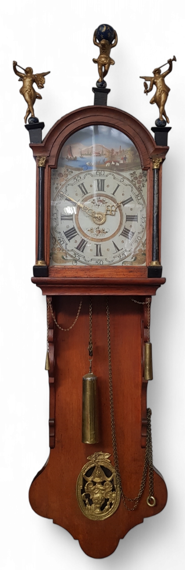 Nederlandse Friese staartklok, eind 19e eeuw. Uitgevoerd in hout en messing, met beschilderd bovenpaneel met Hollands landschap, wijzerplaat met Romeinse cijfers en florale motieven. De kap is bekroond met drie messing figuren, waaronder Atlas met hemelbol. Het slingervenster toont een messing ornament met urn en guirlande. Klaar om te bieden? Registreer je nu en doe mee aan de veiling! |