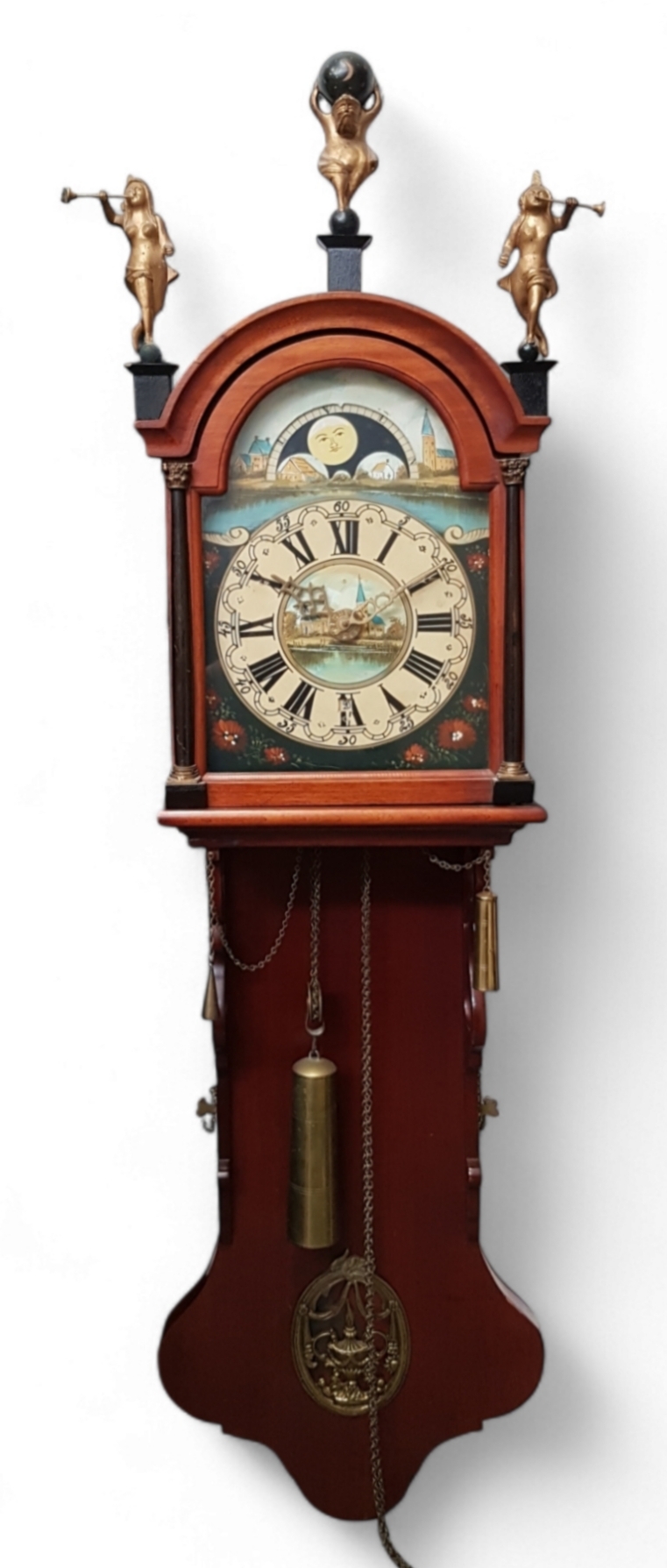 Friese staartklok, tweede helft 20e eeuw. Uitgevoerd in hout en messing met beschilderde wijzerplaat voorzien van dorpsgezicht, Romeinse cijfers en draaiende maanschijf. De kast heeft een gebogen kap met drie messing bekroningen, waaronder Atlas met hemelbol en twee trompetblazers. Het slingervenster toont een messing ornament met vaas en guirlande. Dit klok zelf beoordelen? Je bent welkom op onze kijkdagen op 29, 30 en 31 augustus! |