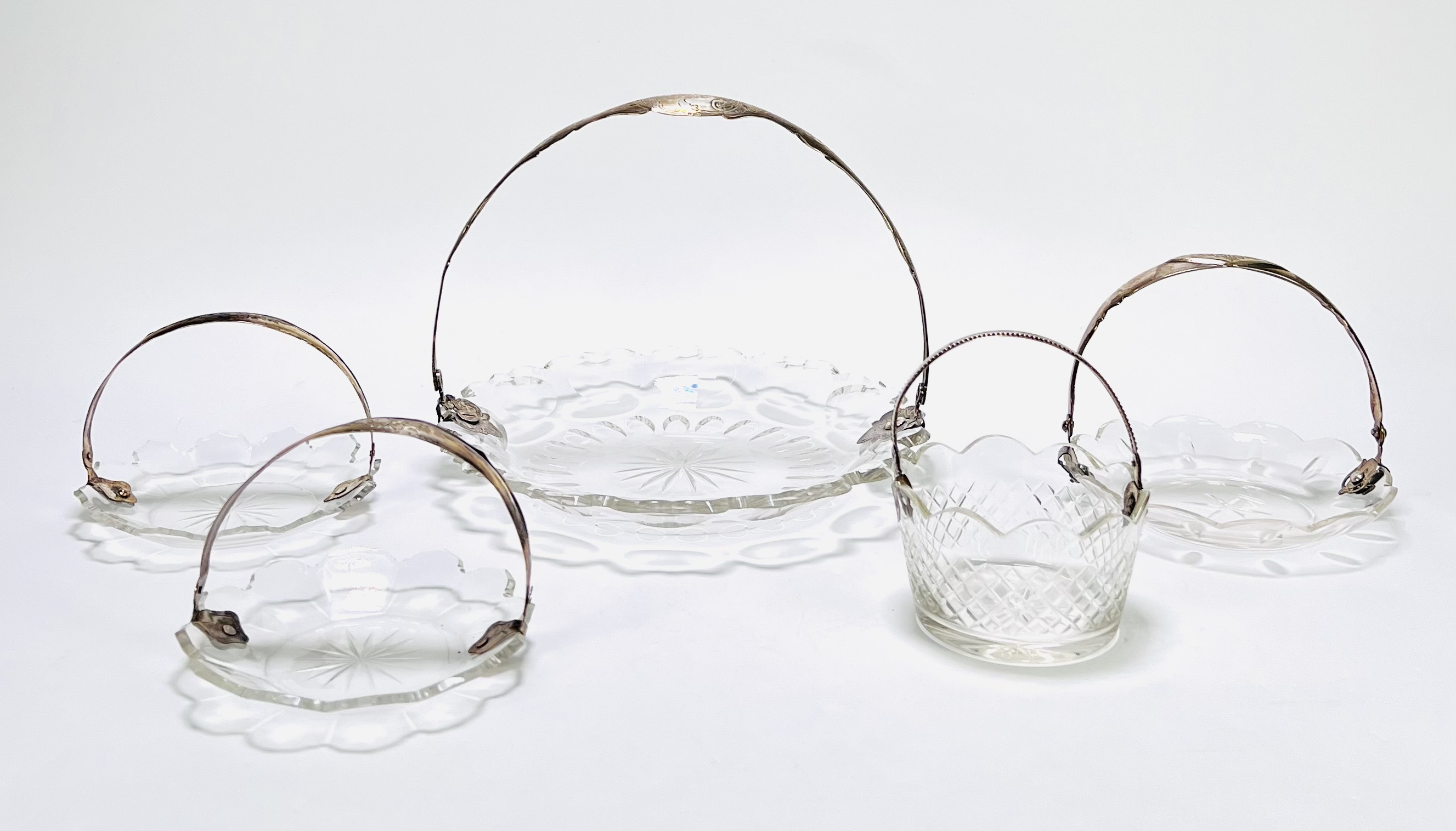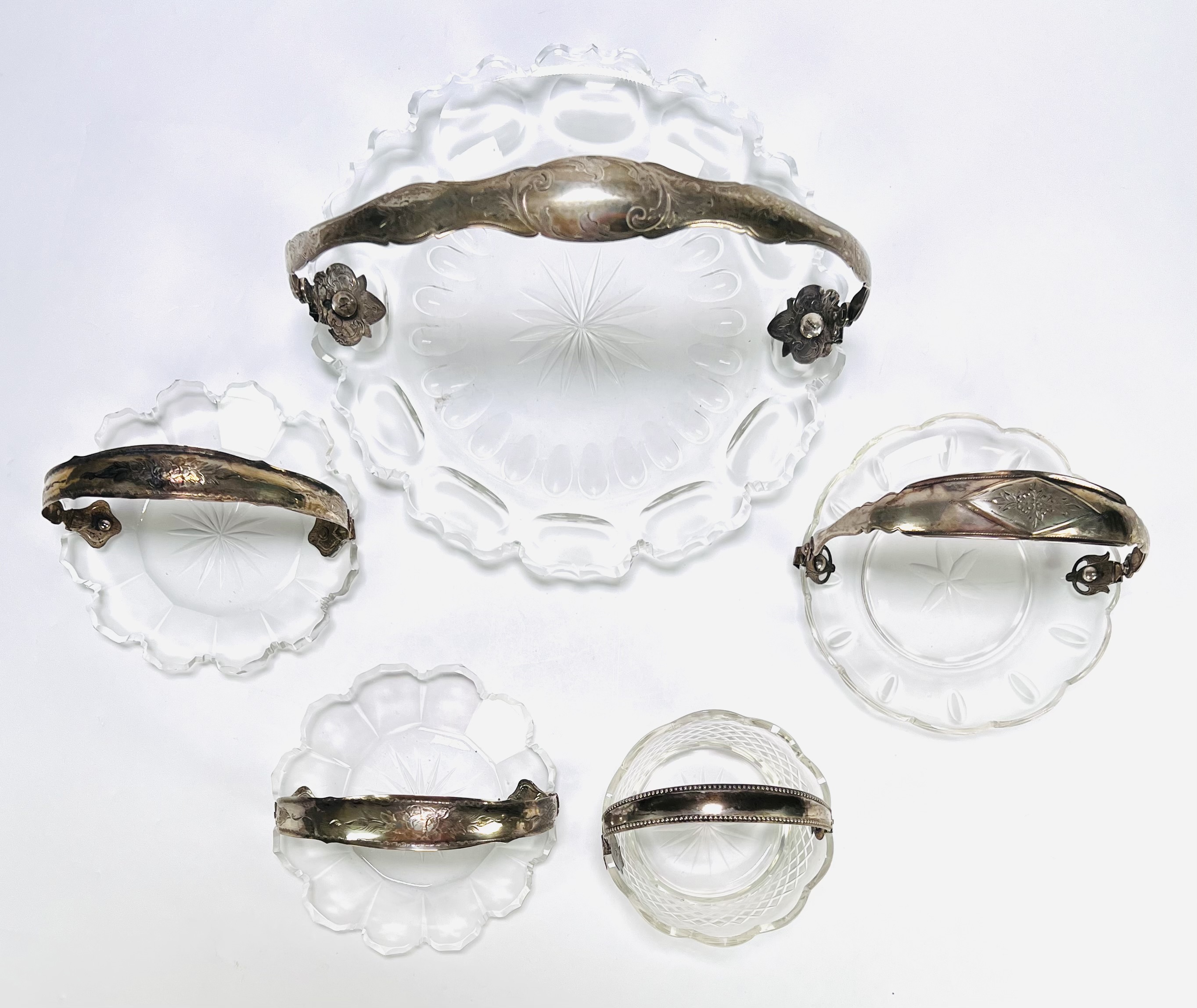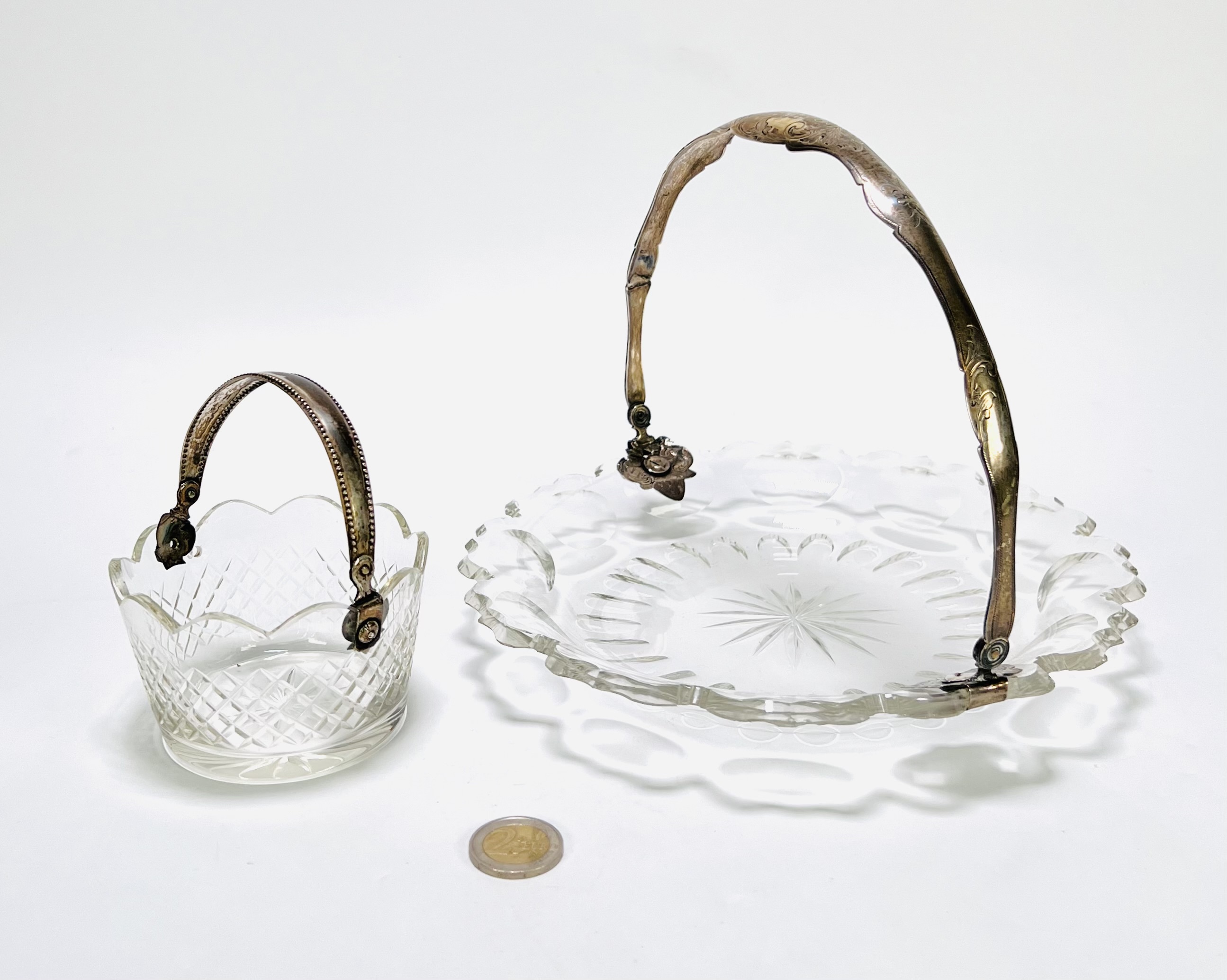 Deze set van vijf kristallen schalen met zilveren hengsels dateert van circa 1900-1920, de schalen zijn vervaardigd van kristalglas en gedecoreerd met een patroon van geslepen lijnen en stervormige slijpsels. De zilveren hengsels zijn versierd met florale gravures. Deze kristallen schalen met zilveren hengsel zelf beoordelen? Je bent welkom op onze kijkdagen op 29, 30 en 31 augustus |