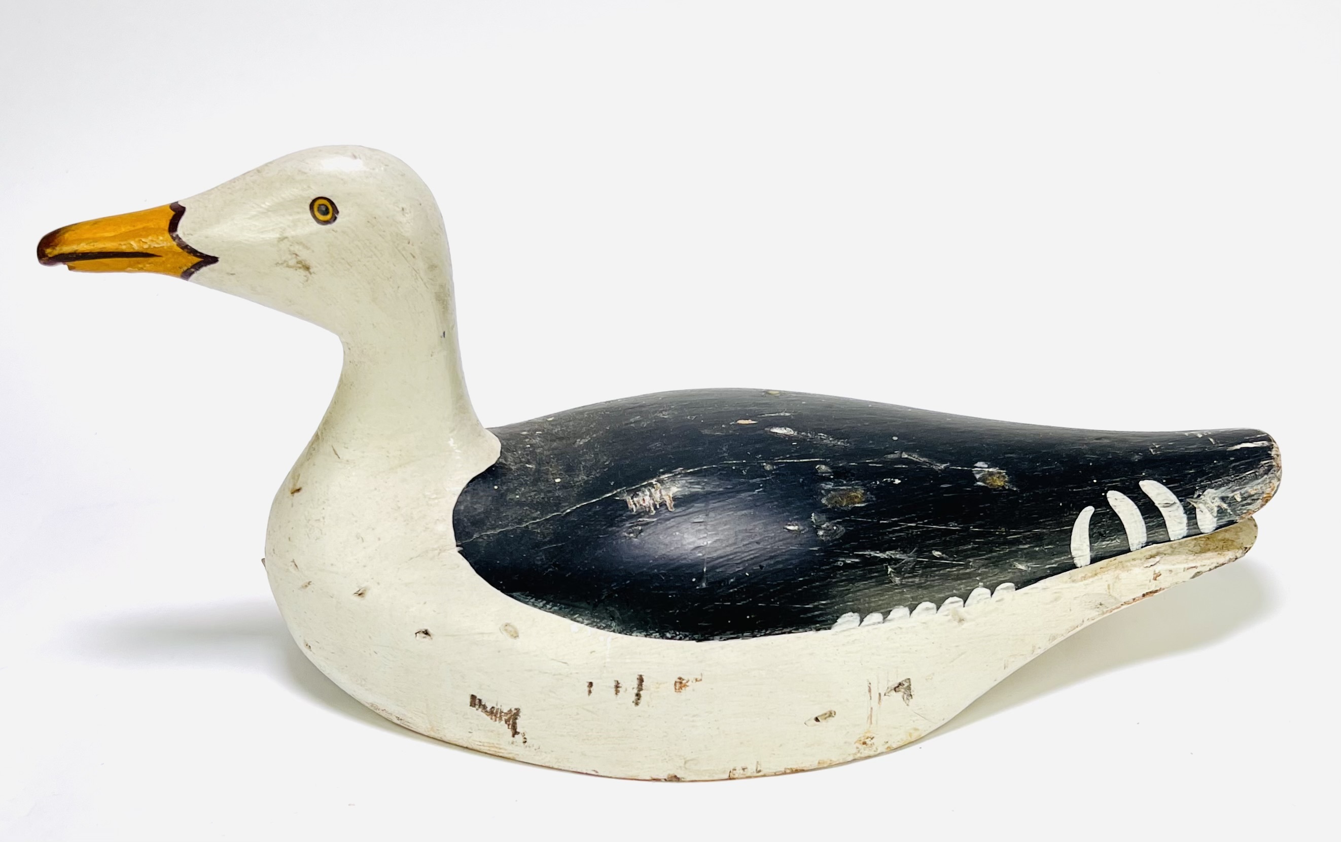 Houten lokeend in de vorm van een mantelmeeuw, toegeschreven aan Amateur Savoie (1896–1983), Neguac, New Brunswick, midden 20e eeuw. De lokeend is met de hand gesneden en beschilderd in zwart, wit en oranje. Kenmerkend zijn de gestileerde vleugelmarkeringen en sporen van gebruik op de onderzijde. Geïnteresseerd? Bezoek onze kijkdagen op 29, 30 of 31 augustus van 11:00 tot 17:00 uur. |