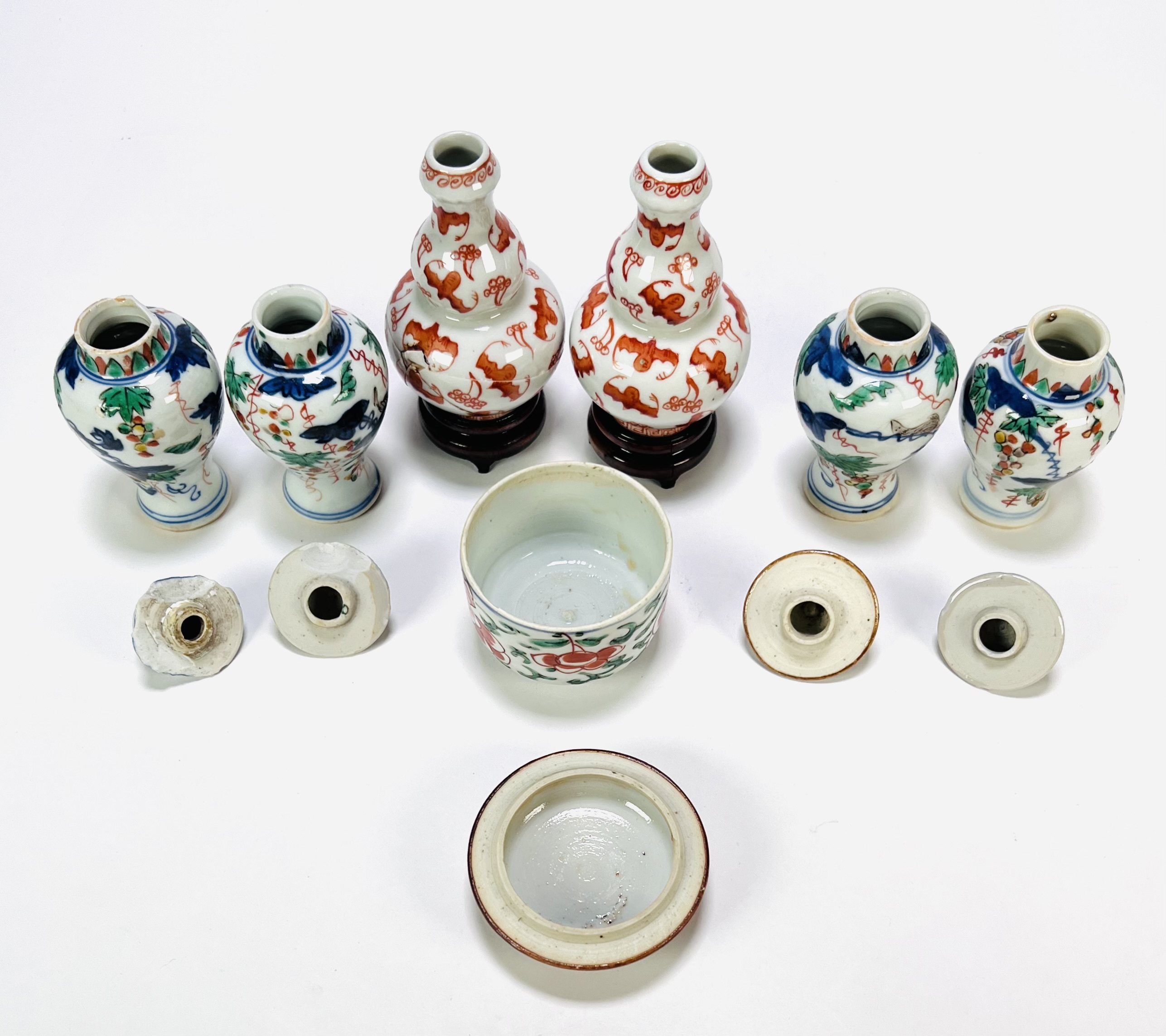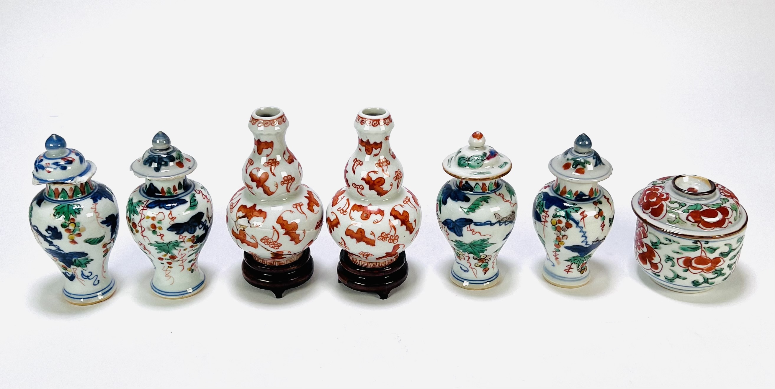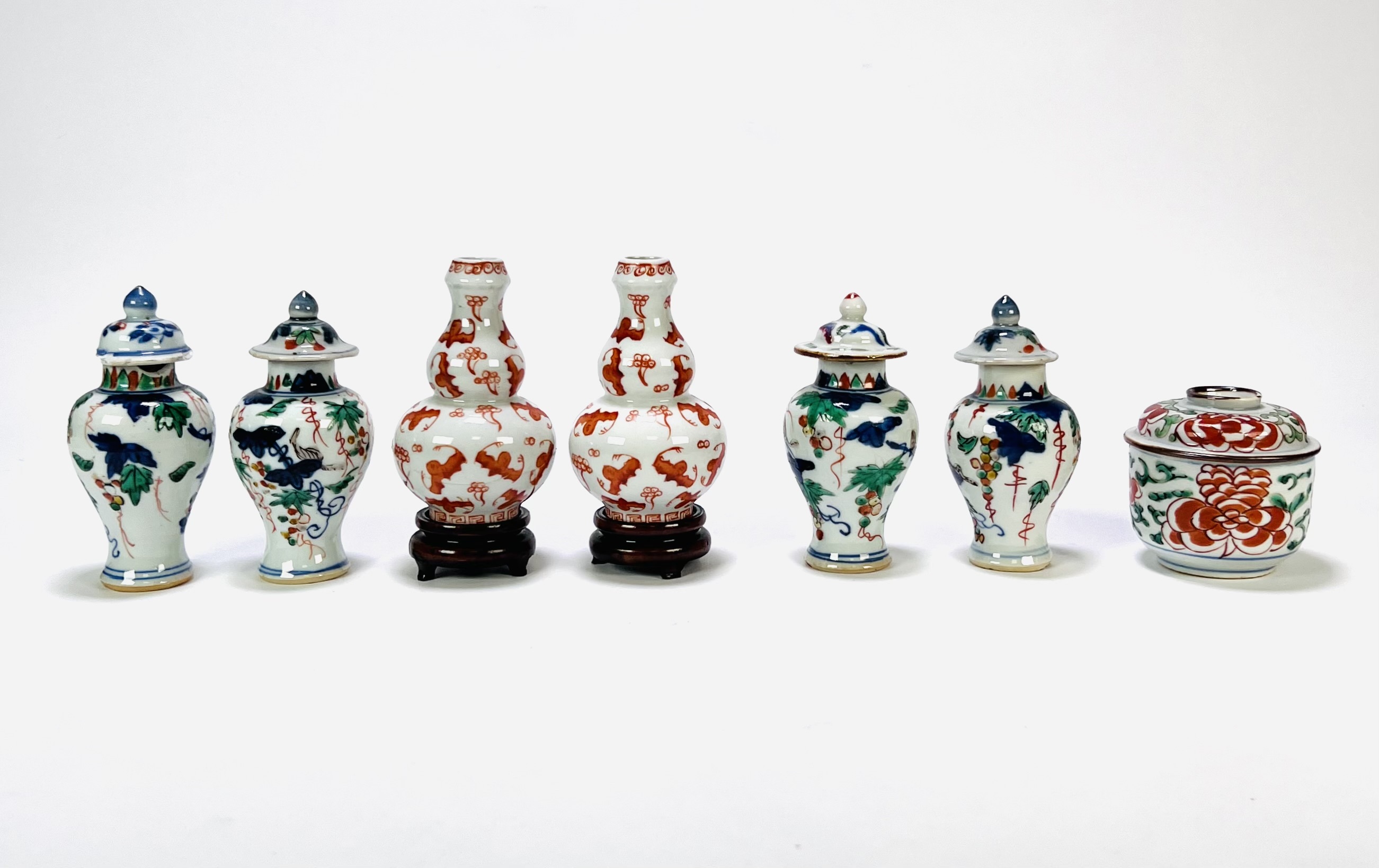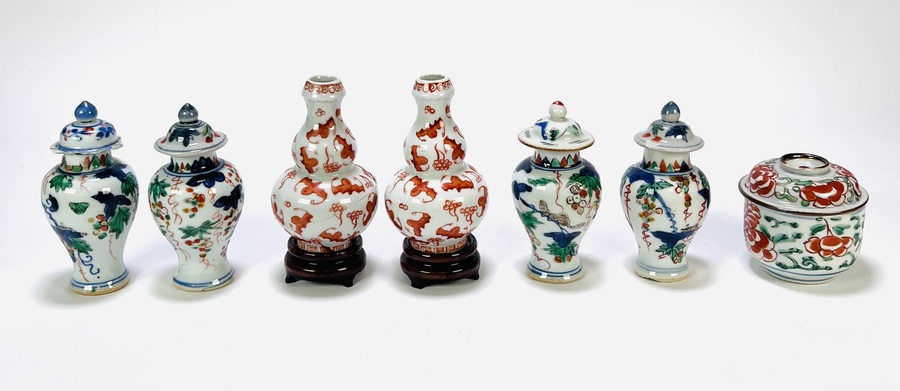 Porseleinen miniatuurvaasjes en potje, wucai stijl, 19e eeuw, China