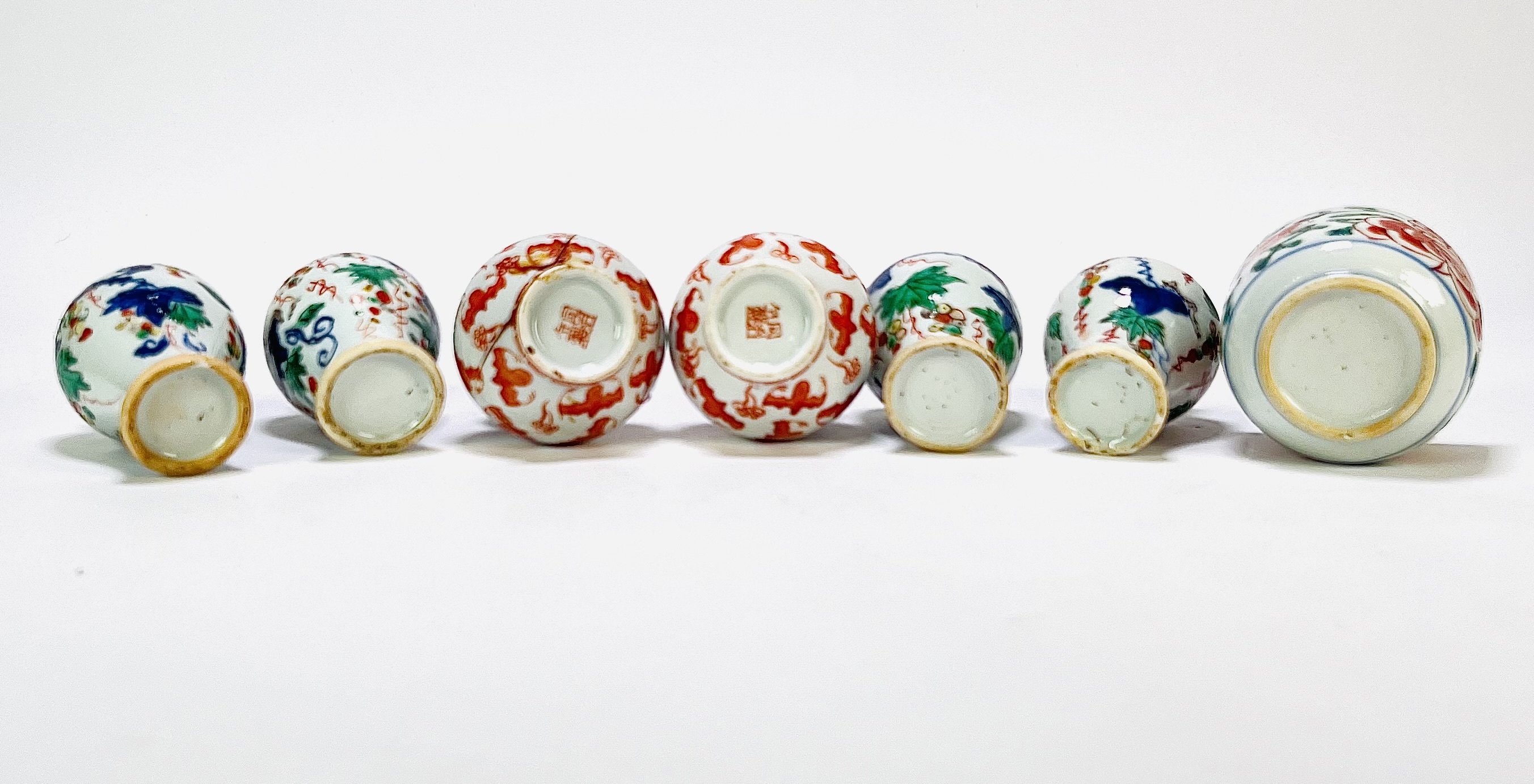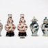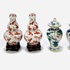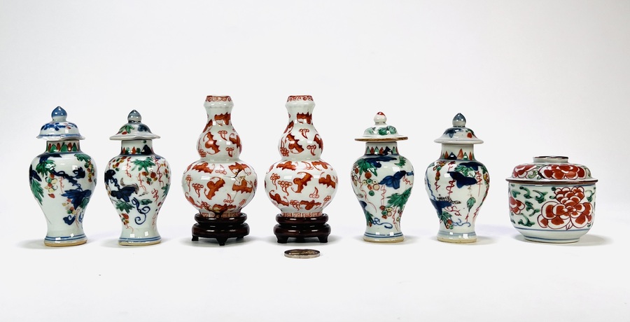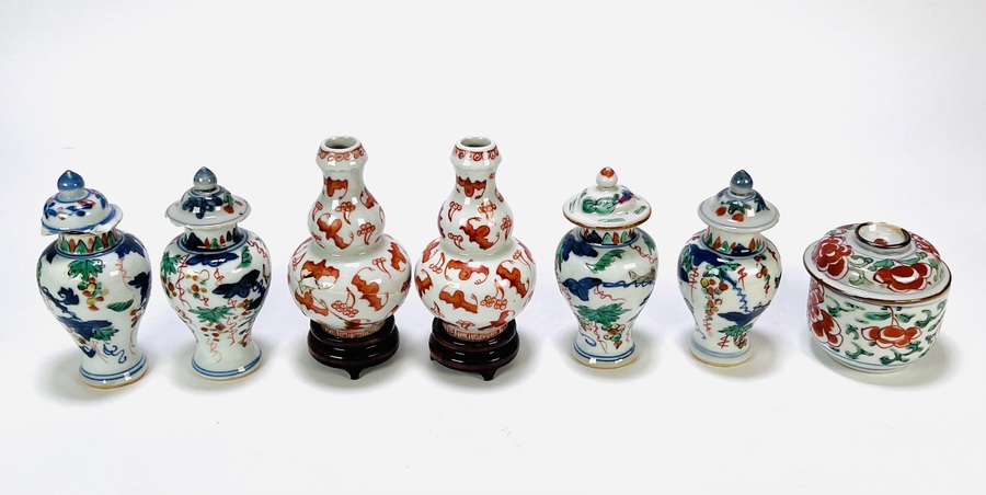 Zeven Chinese miniatuurporseleinen objecten in wucai stijl, 19e eeuw, bestaande uit vier dekselvaasjes, twee dubbelkalebasvormige vaasjes en een cilindrisch potje met deksel. Vervaardigd in porselein en handbeschilderd met onderglazuur blauw en bovenglazuur kleuren waaronder rood, groen en geel. Kenmerkend zijn druiventrossen, vogels, vleermuizen en bloemmotieven. Eerst het porselein zien voordat je biedt? Bezoek onze kijkdagen op 29, 30 en 31 augustus van 11:00 tot 17:00 uur! |