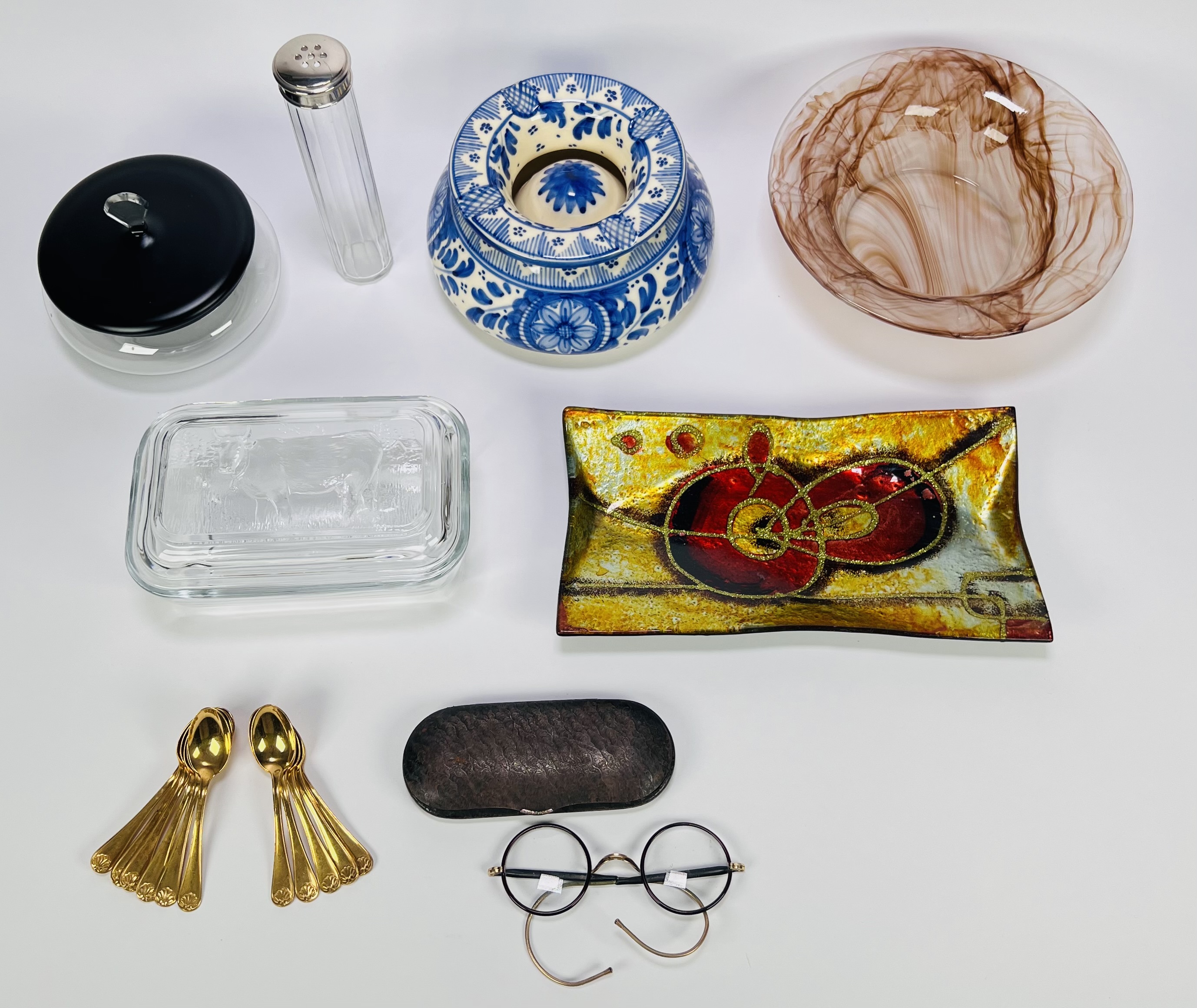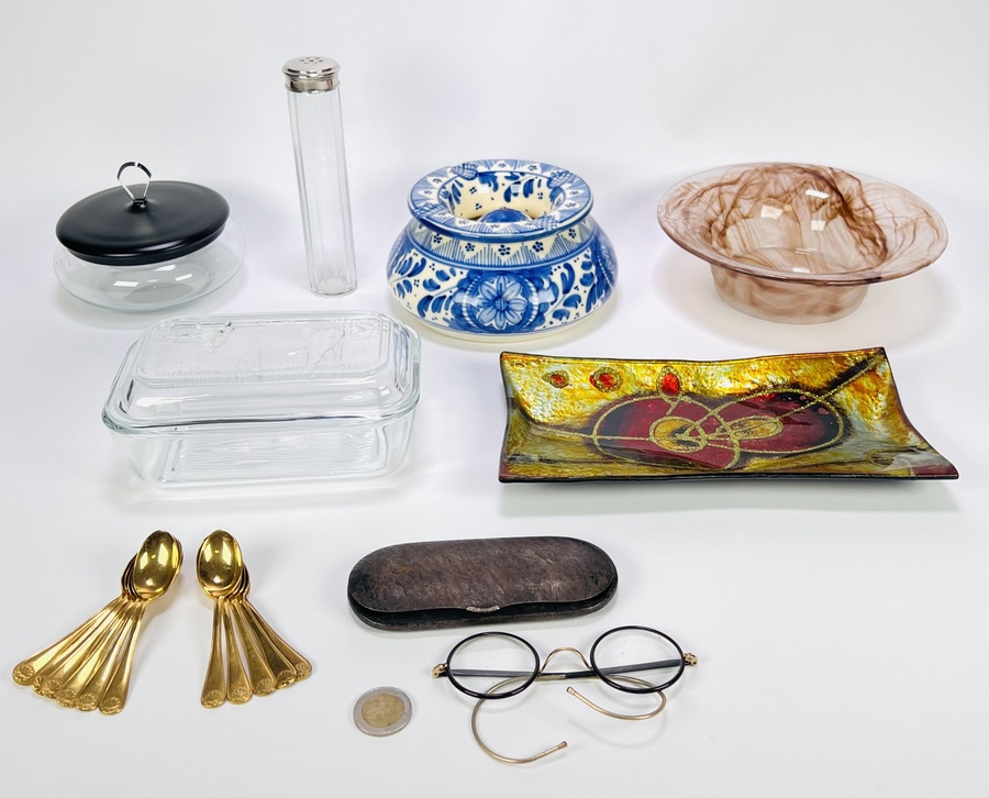 Dit kavel curiosa omvat diverse objecten van verschillende materialen, waaronder een keramieken asbak met Delfts blauw motief, diverse schalen van glas en een rechthoekig schaaltje met abstracte decorcor, een brillenkoker met bril en goudkleurige lepeltjes. Gedateerd late 19e eeuw tot de midden 20e eeuw. Zeker zijn van deelname? Plaats een schriftelijk bod online! |