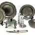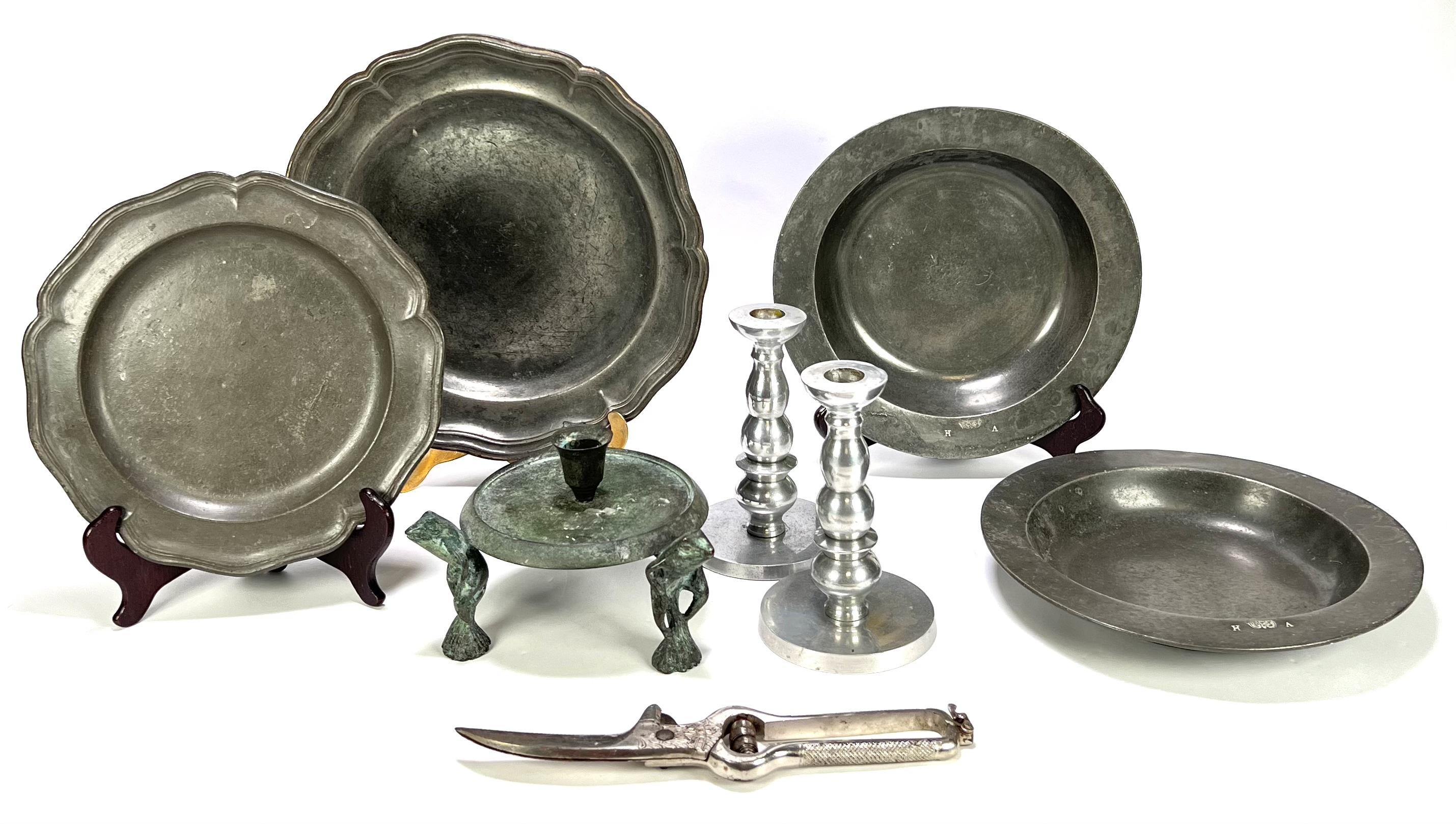 Verzameling curiosa bestaande uit diverse metalen objecten, omstreeks midden tot tweede helft 20e eeuw. Bestaande uit twee tinnen borden met geprofileerde rand, twee tinnen schalen, twee zilverkleurige kandelaars, een kandelaar op drie kikkerpoten en een metalen keukenschaar. Zeker zijn van deelname? Plaats een schriftelijk bod online! |