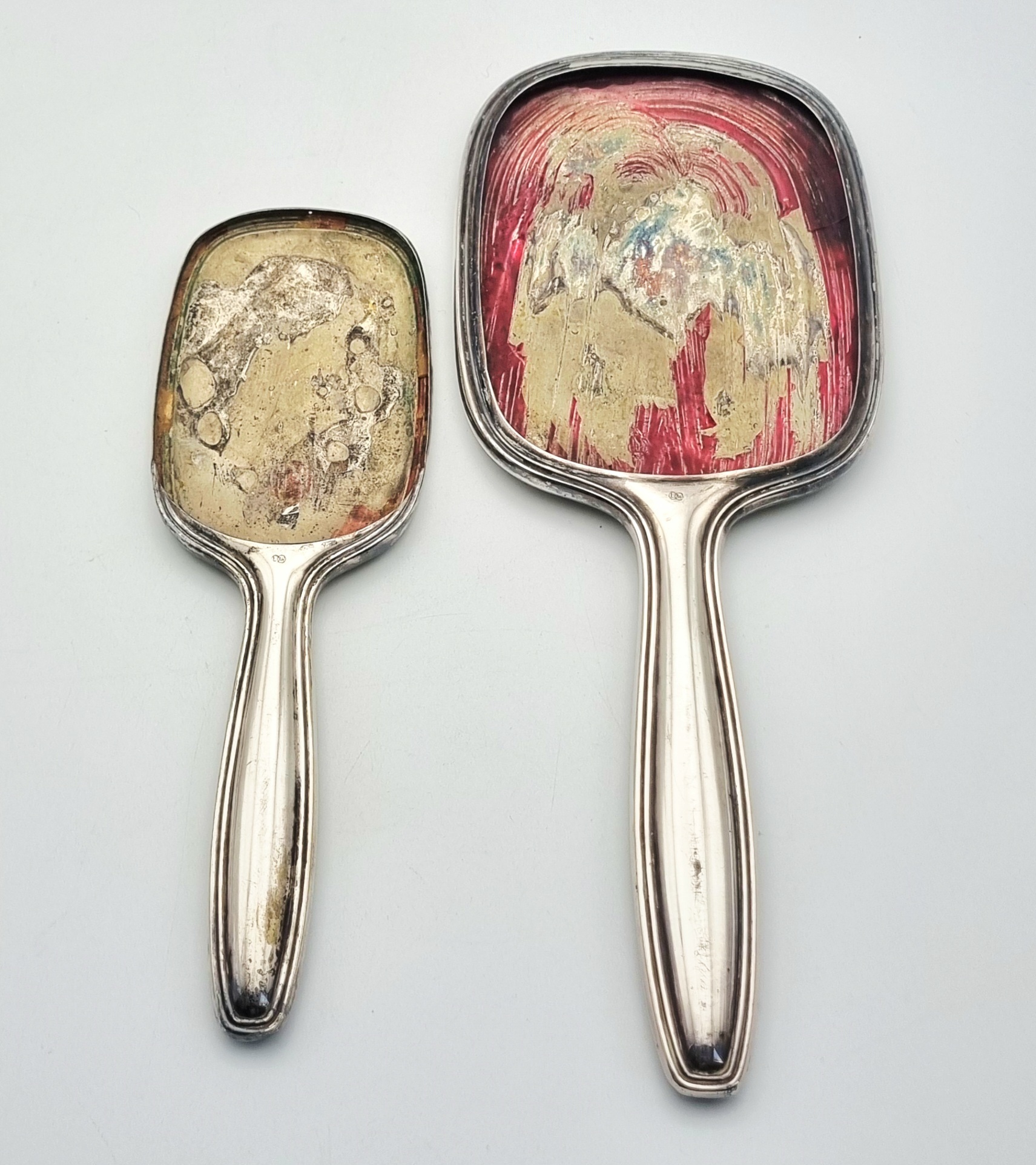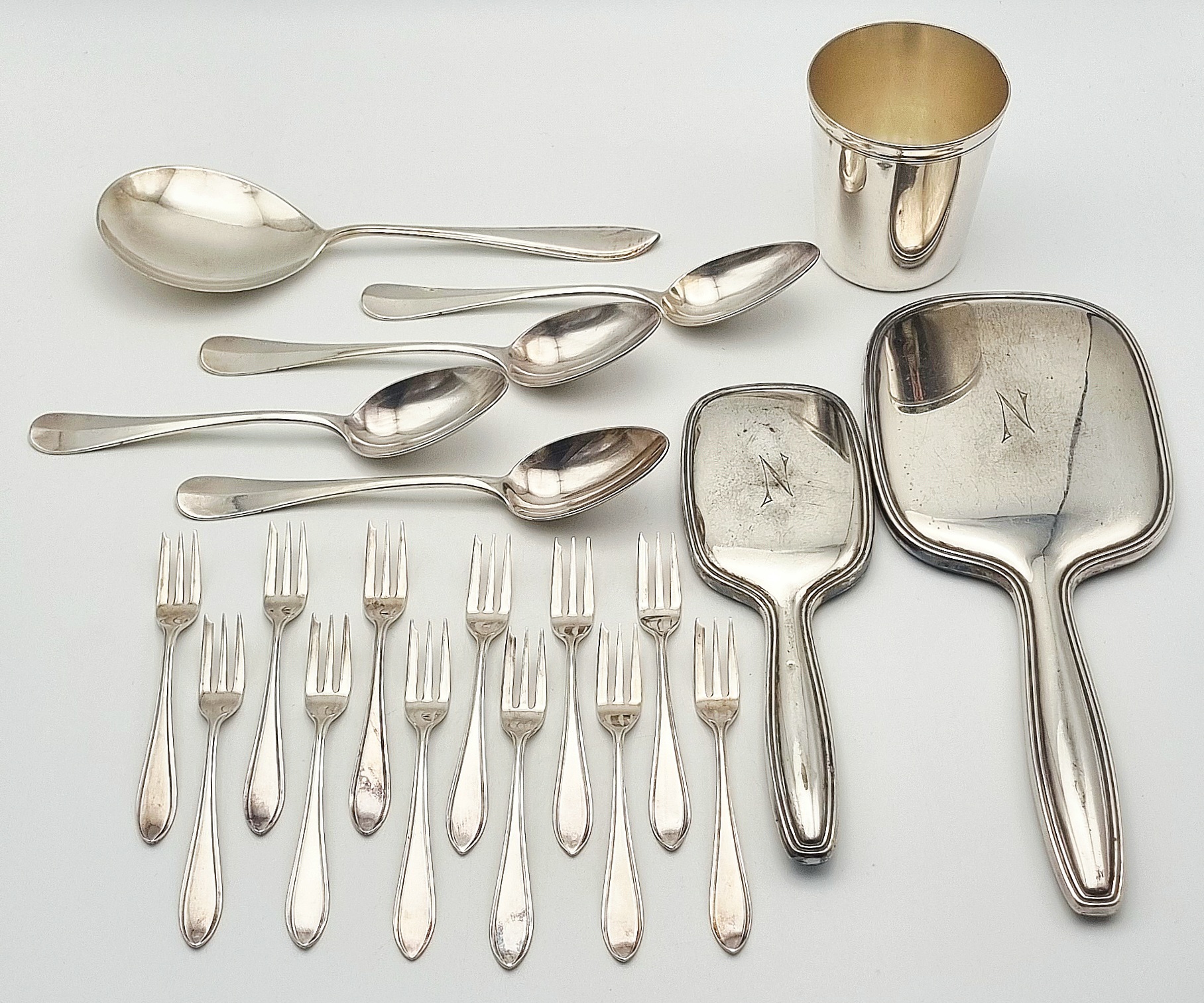 Verzameling bestek, spiegels zonder glas en beker uit de 20e eeuw, uitgevoerd in pleet. De set omvat zes lepels in diverse formaten, twaalf vorkjes, een opscheplepel, een gladwandige beker en twee handspiegels waarvan de achterzijde voorzien is van een gegraveerde letter “N”. Eerst deze verzameling zien voordat je biedt? Bezoek onze kijkdagen op 29, 30 en 31 augustus van 11:00 tot 17:00 uur! |
