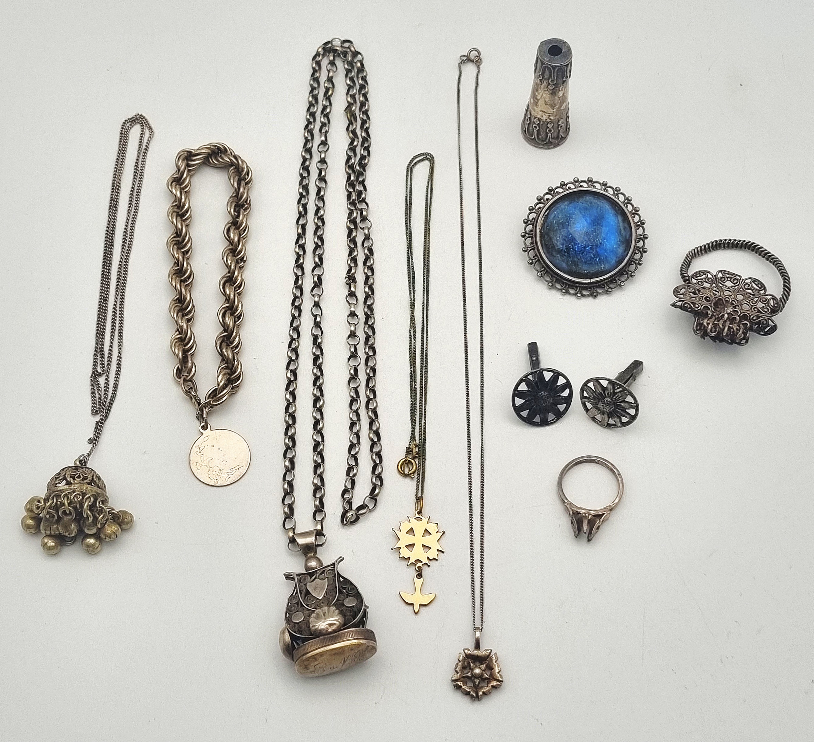 Diverse collectie van elf sieraden van edel en onedel metaal, daterend uit het einde van de 19e eeuw en het begin van de 20e eeuw. De sieraden zijn uitgevoerd in diverse stijlen waaronder neoclassicisme en romantiek. De set bestaat uit kettingen, een armband, een ring en een broche. Registreer nu en bied eenvoudig online mee op deze sieraden! |