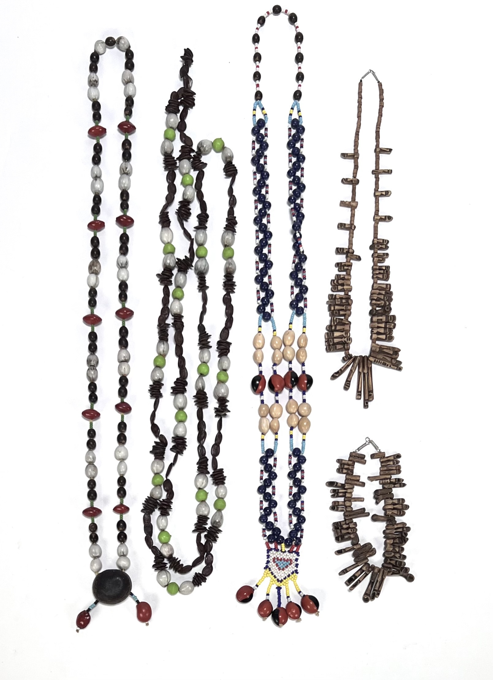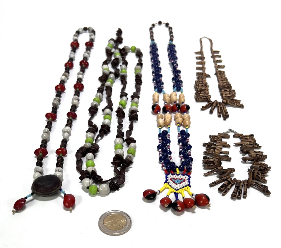 Convoluut sieraden in een etnische stijl, daterend uit circa het midden van de 20e eeuw. De handgemaakte sieraden zijn gemaakt van diverse organische en natuurlijke materialen en aangevuld met kralen van glas en keramiek. De set bestaat uit vier kettingen met meerkleurige kralen en figuratieve motieven en een bijpassende armband. Ontdek deze sieraden en voeg het toe aan jouw collectie! Registreer nu voor de veiling. |