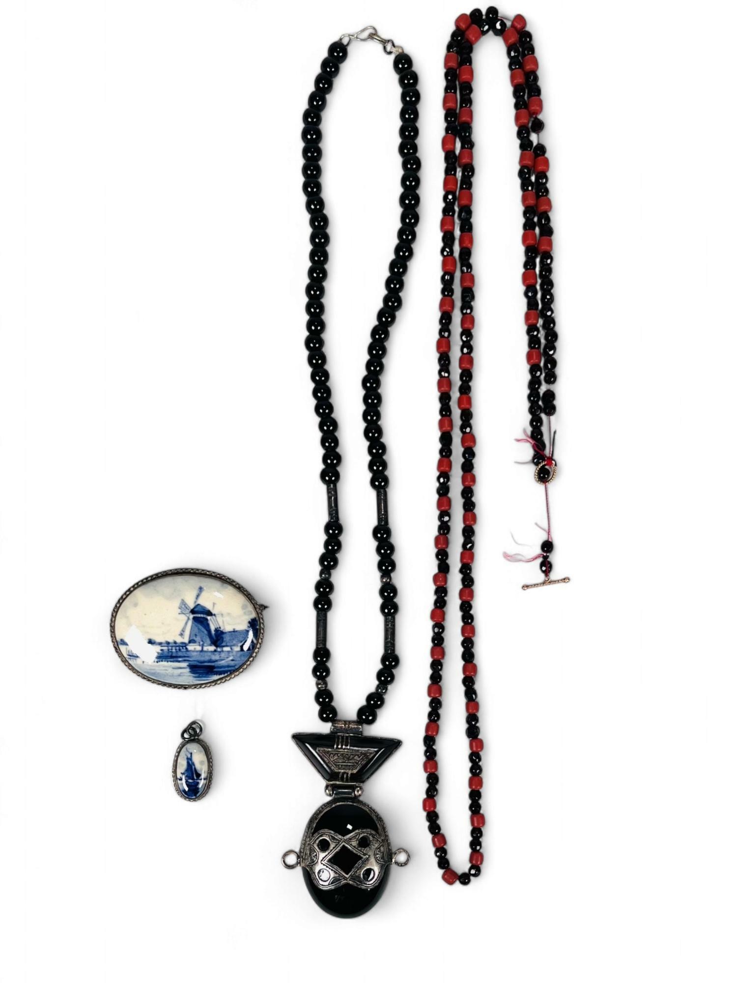 Een diverse collectie sieraden in een eclectische stijl, daterend uit het midden van de 20e eeuw. De set bestaat uit een ketting met Peruaanse hangers, een broche en een hanger van Delfts blauw keramiek, en een ketting met rode en zwarte kralen. Klaar om te bieden? Registreer je nu en doe mee aan de veiling! |