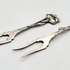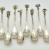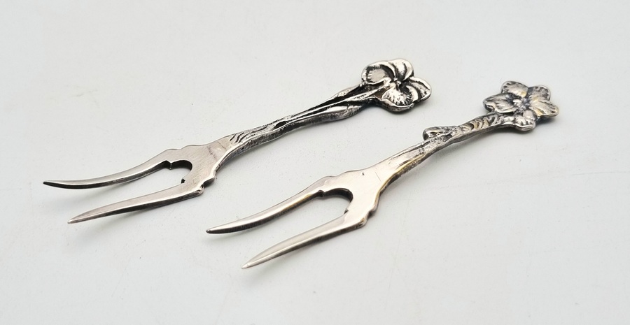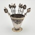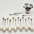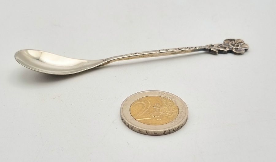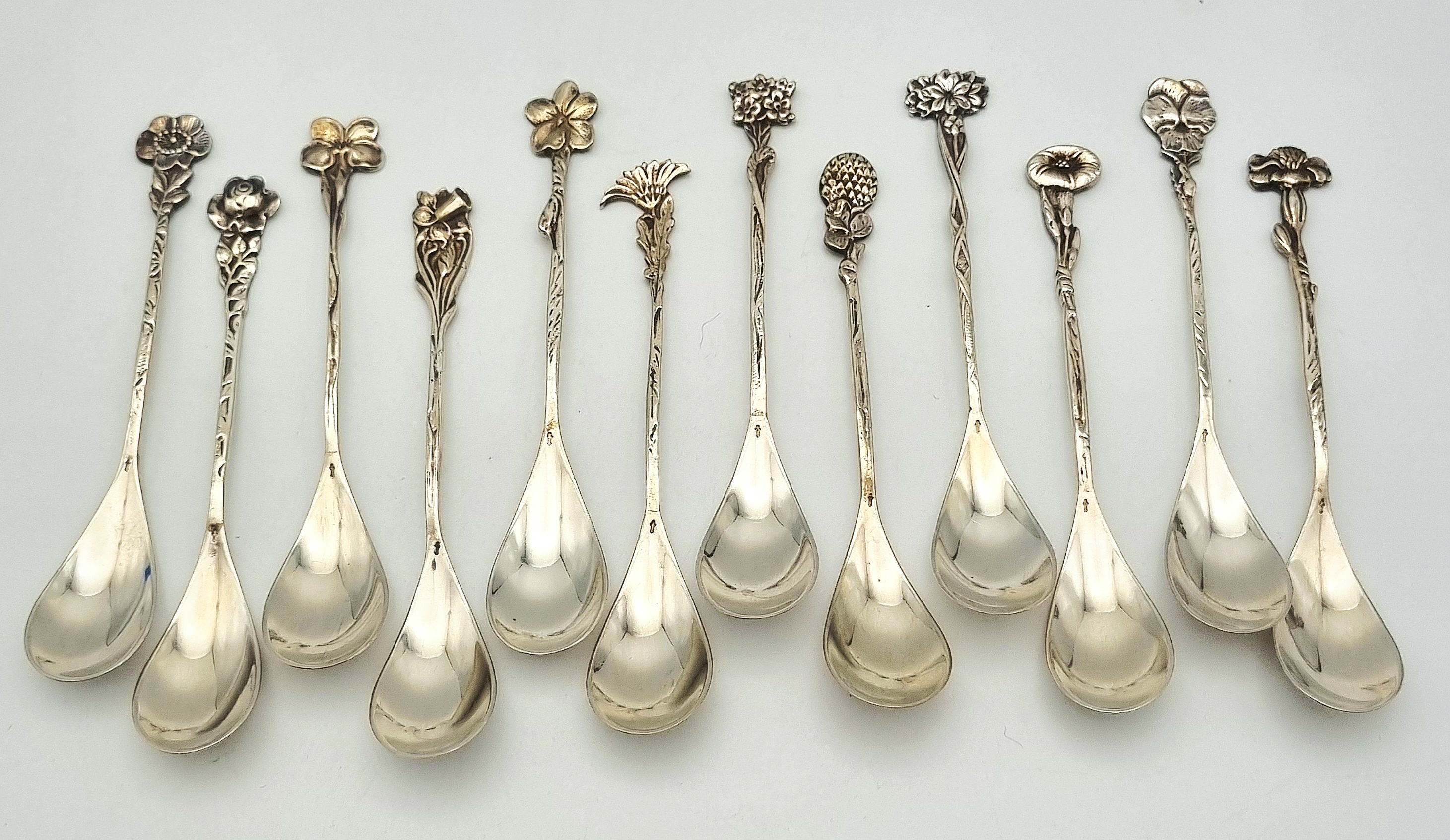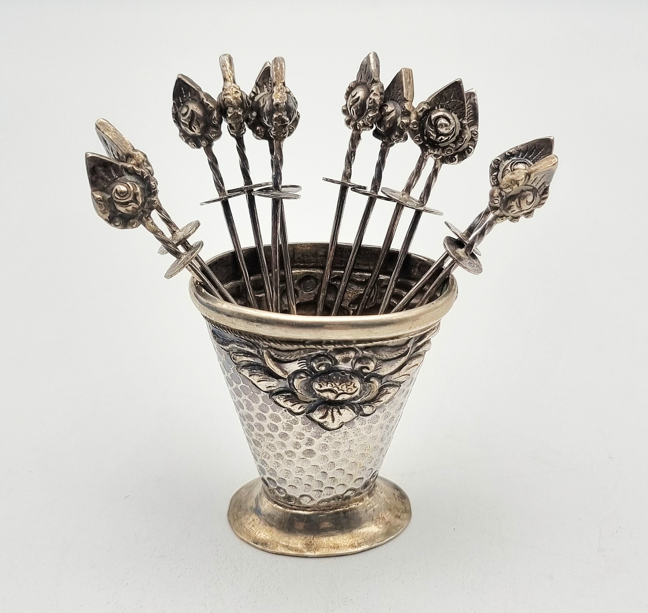 Convoluut zilver bestaande uit twaalf lepeltjes met bloemvormige uiteinden, waaronder roos, narcis en klaver. Hierbij een gehamerde houder met florale decoratie en diverse bijpassende prikkers en kleine vorkjes, uitgevoerd in een florale stijl, gedateerd eerste helft 20e eeuw. Zilver gemerkt met diverse keuren. |