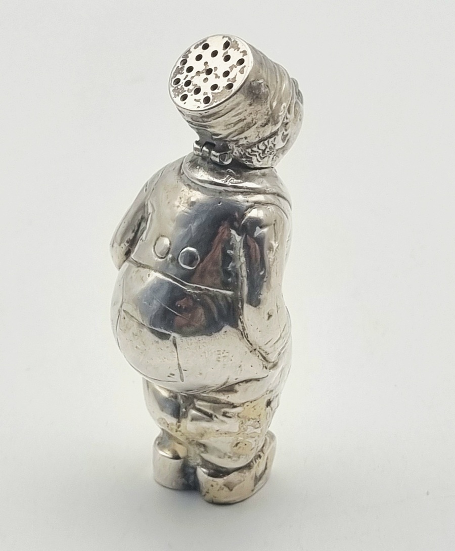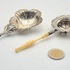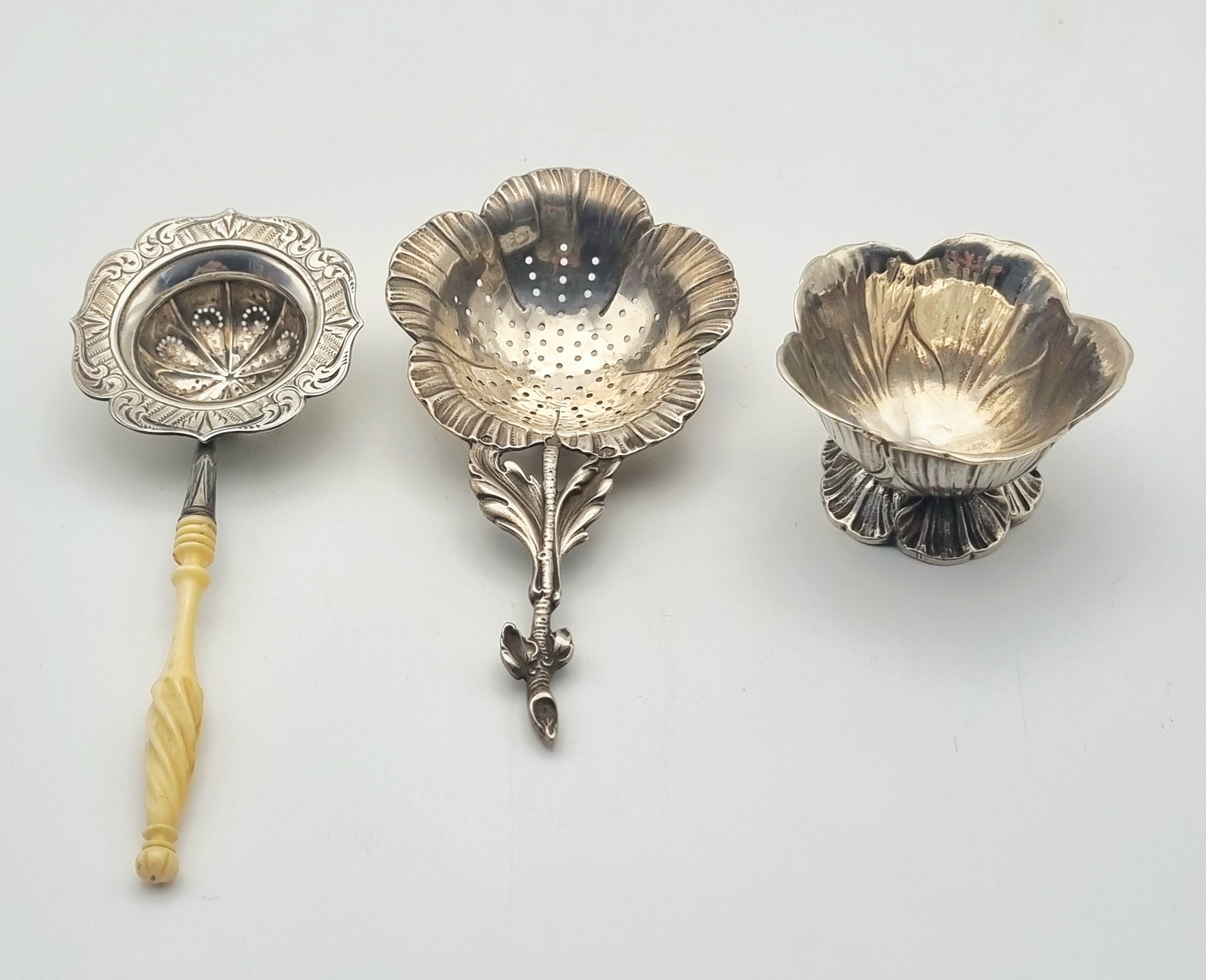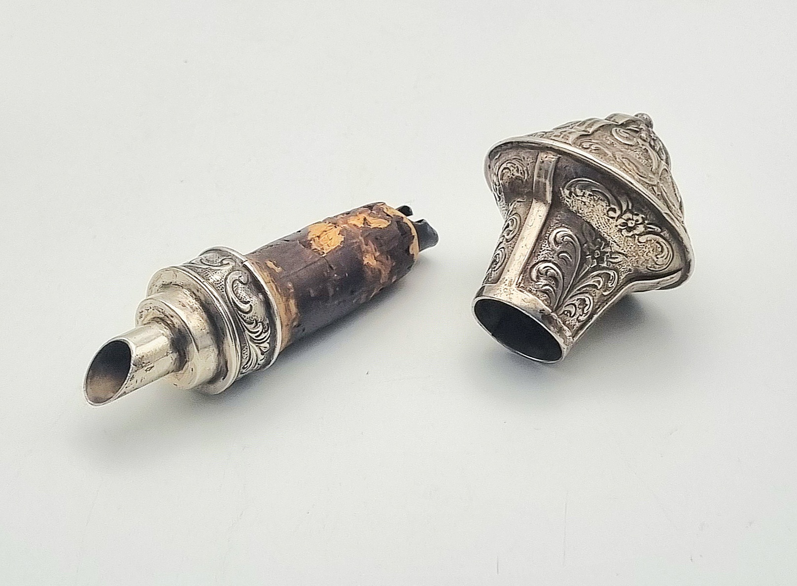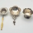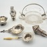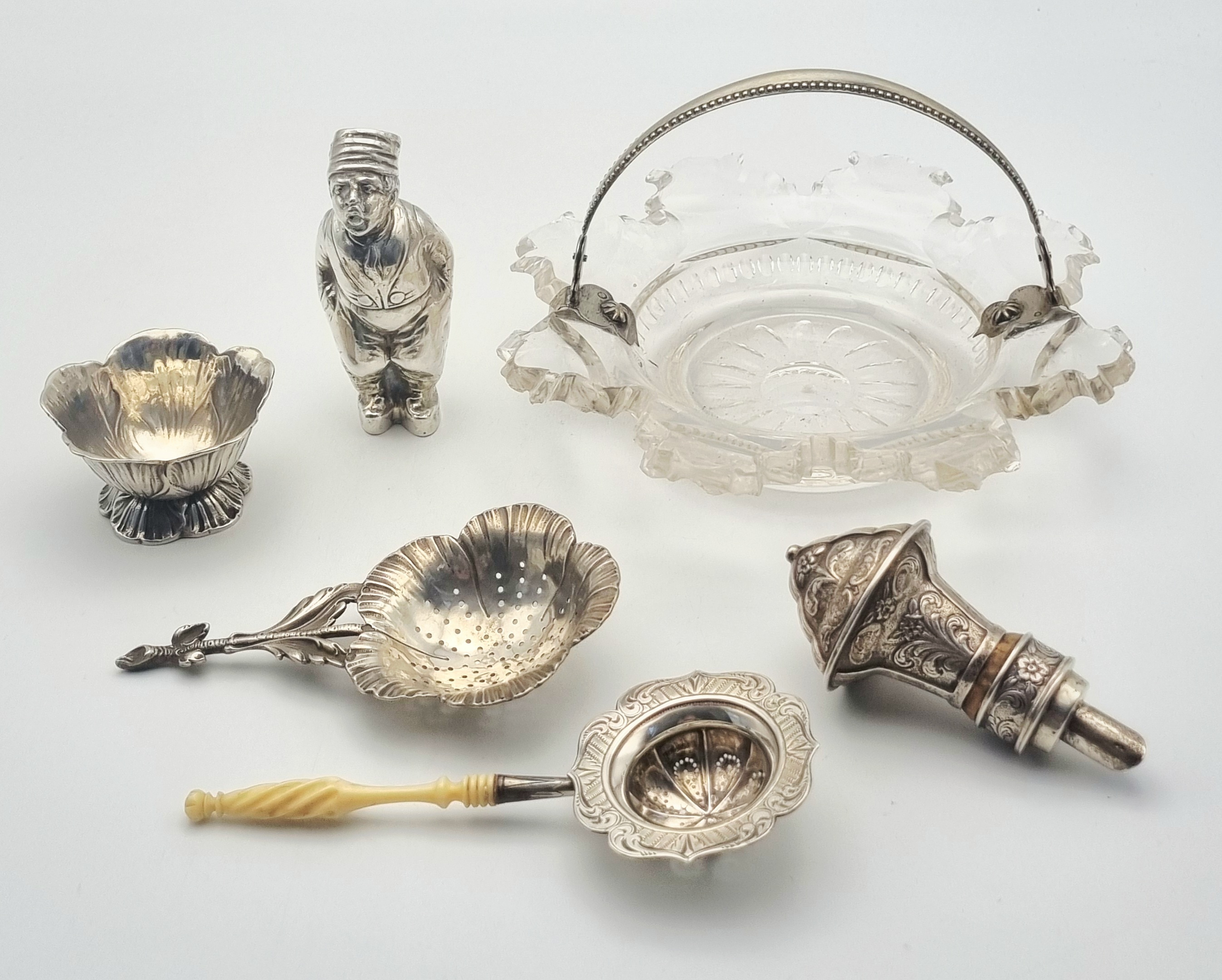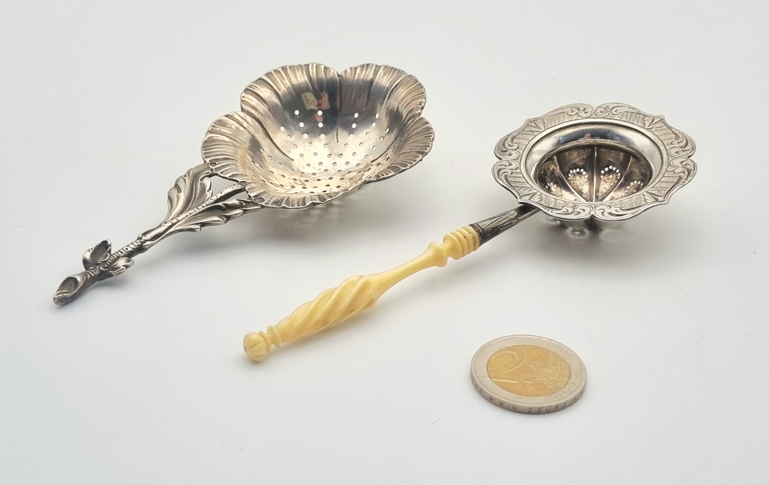 Convoluut zilver bestaande uit een zilveren strooier in de vorm van een mannetje, twee bloemvormige zilveren theezeefjes waarvan één met benen handvat, een bloemvormig schaaltje, een gegraveerde zilveren fleskurk en een glazen bonbonschaal met zilveren hengsel, eind 19e eeuw tot begin 20e eeuw. Wil je dit zilver in het echt bekijken? Kom naar de kijkdagen op 29, 30 en 31 augustus! |