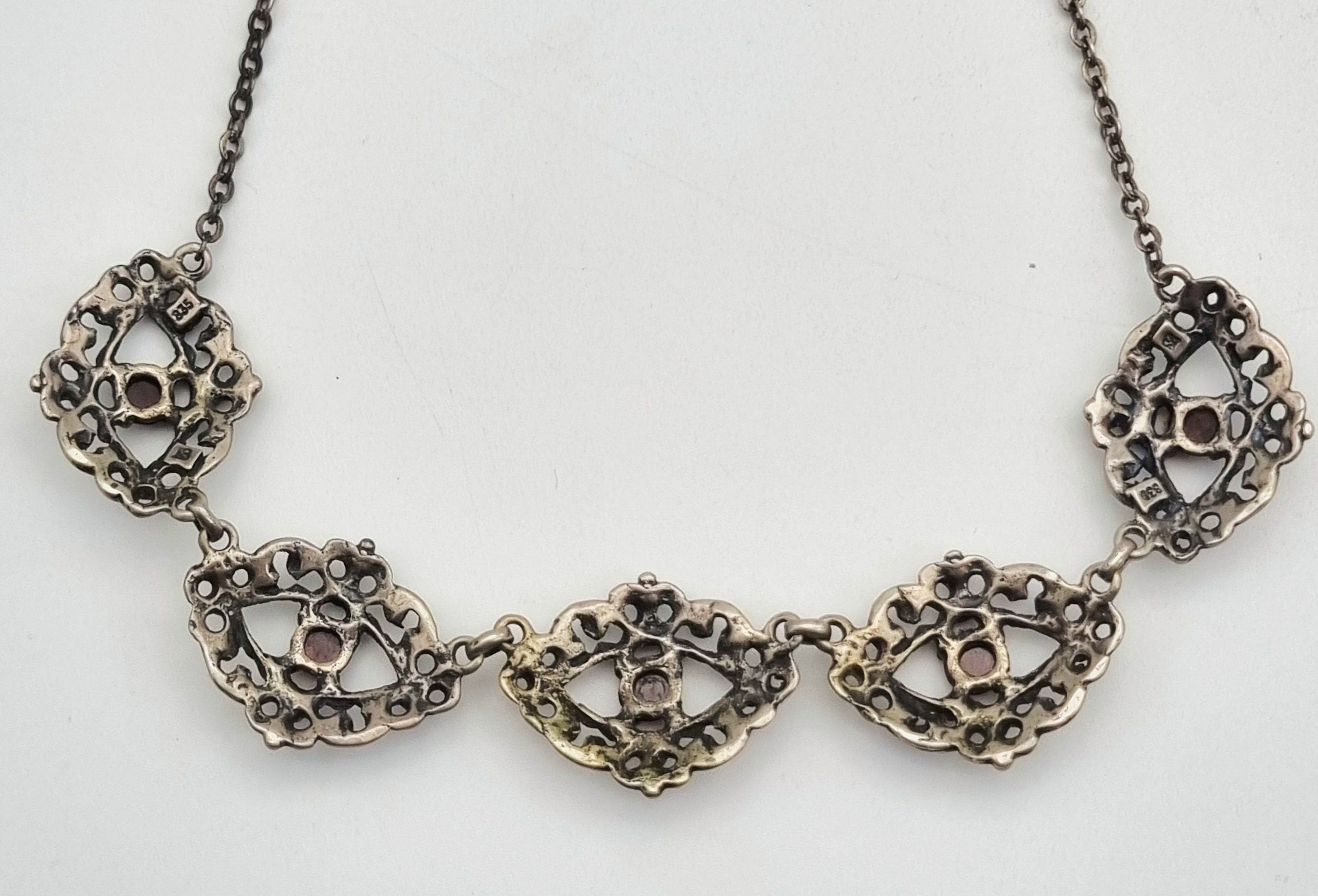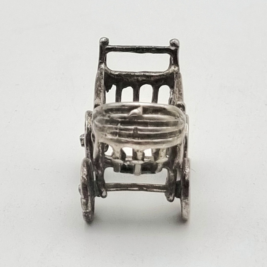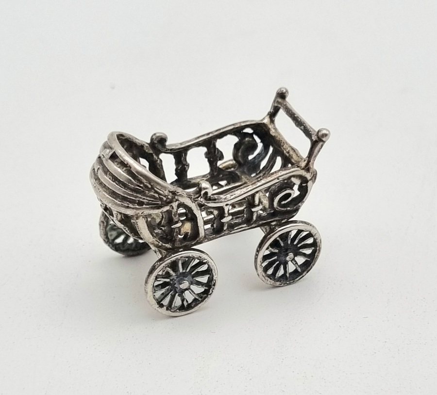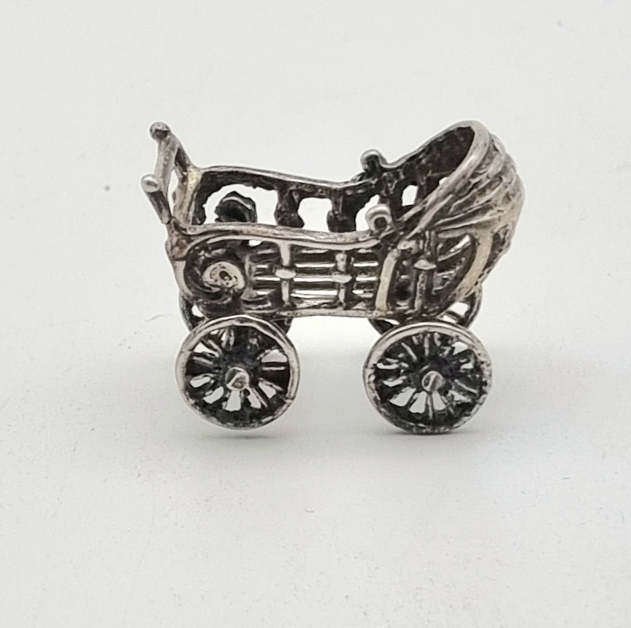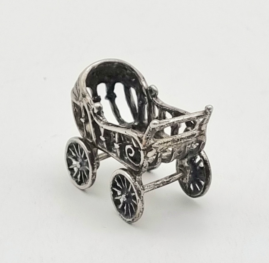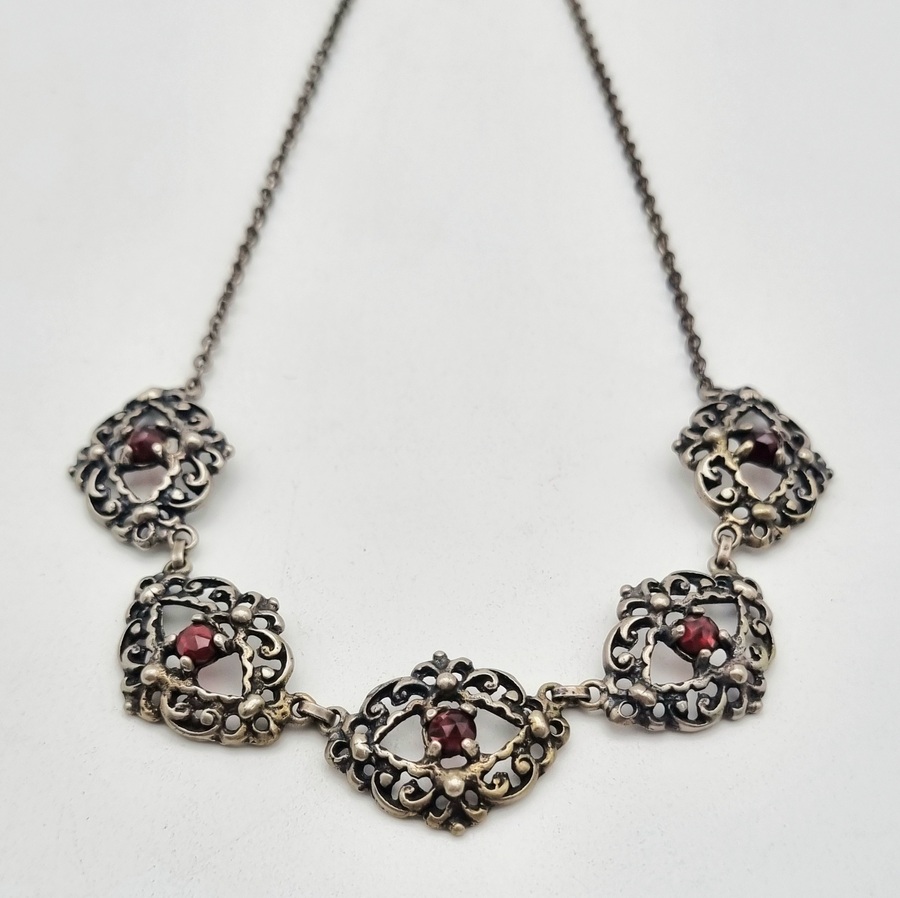 Drie zilveren sieraden uit de begin 20e eeuw, bestaande uit een chatelaine, een miniatuur kinderwagen en een halsketting met vijf opengewerkte schakels, elk bezet met een rode cabochon geslepen steen. Klaar om te bieden? Registreer je nu en doe mee aan de veiling! |