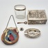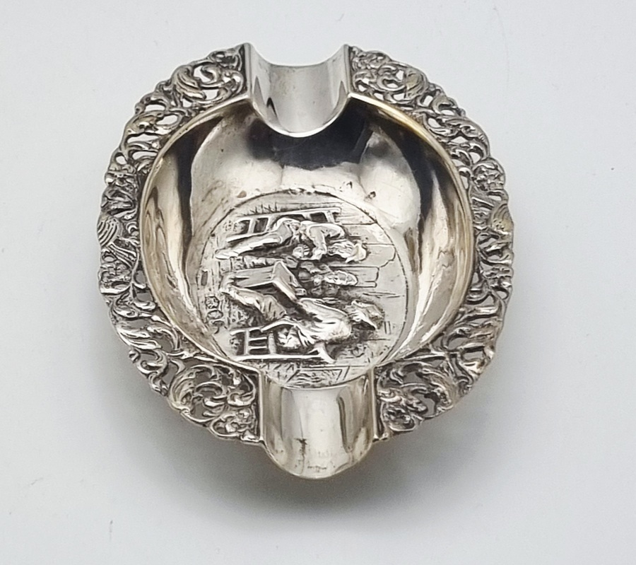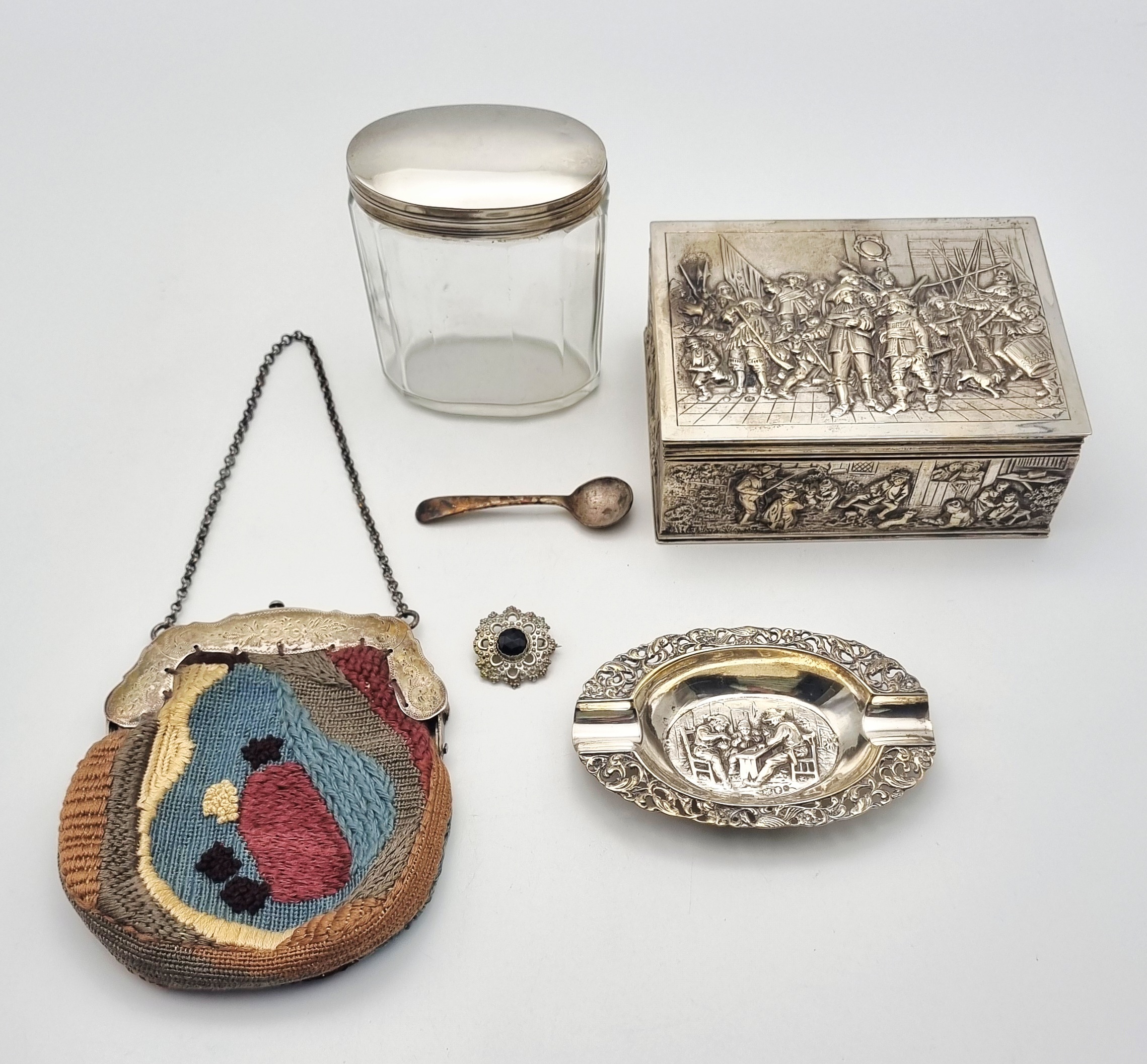 Convoluut zilver uit midden 20e eeuw, bestaand uit een zilveren kistje en asbak, uitgevoerd in neorenaissancestijl, met gedreven figuratieve reliëfs. Alsook een geborduurd tasje met zilveren sluiting, een zilveren broche, een glazen pot met zilveren deksel en een zilveren lepel. Kom langs tijdens de kijkdagen (29 t/m 31 augustus) en ontdek dit zilver zelf! |