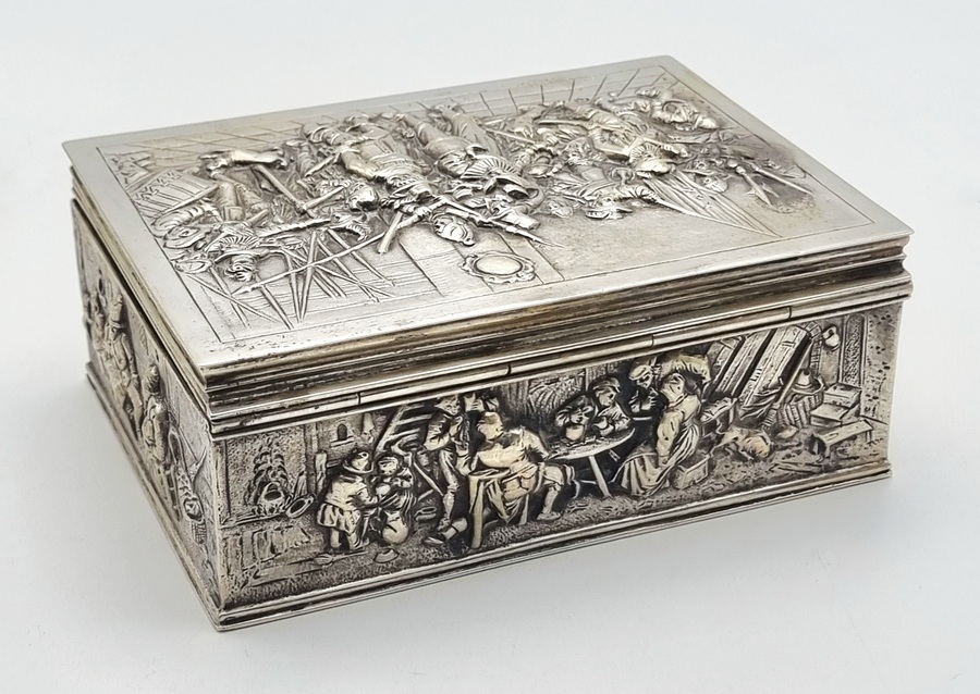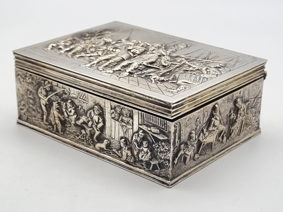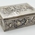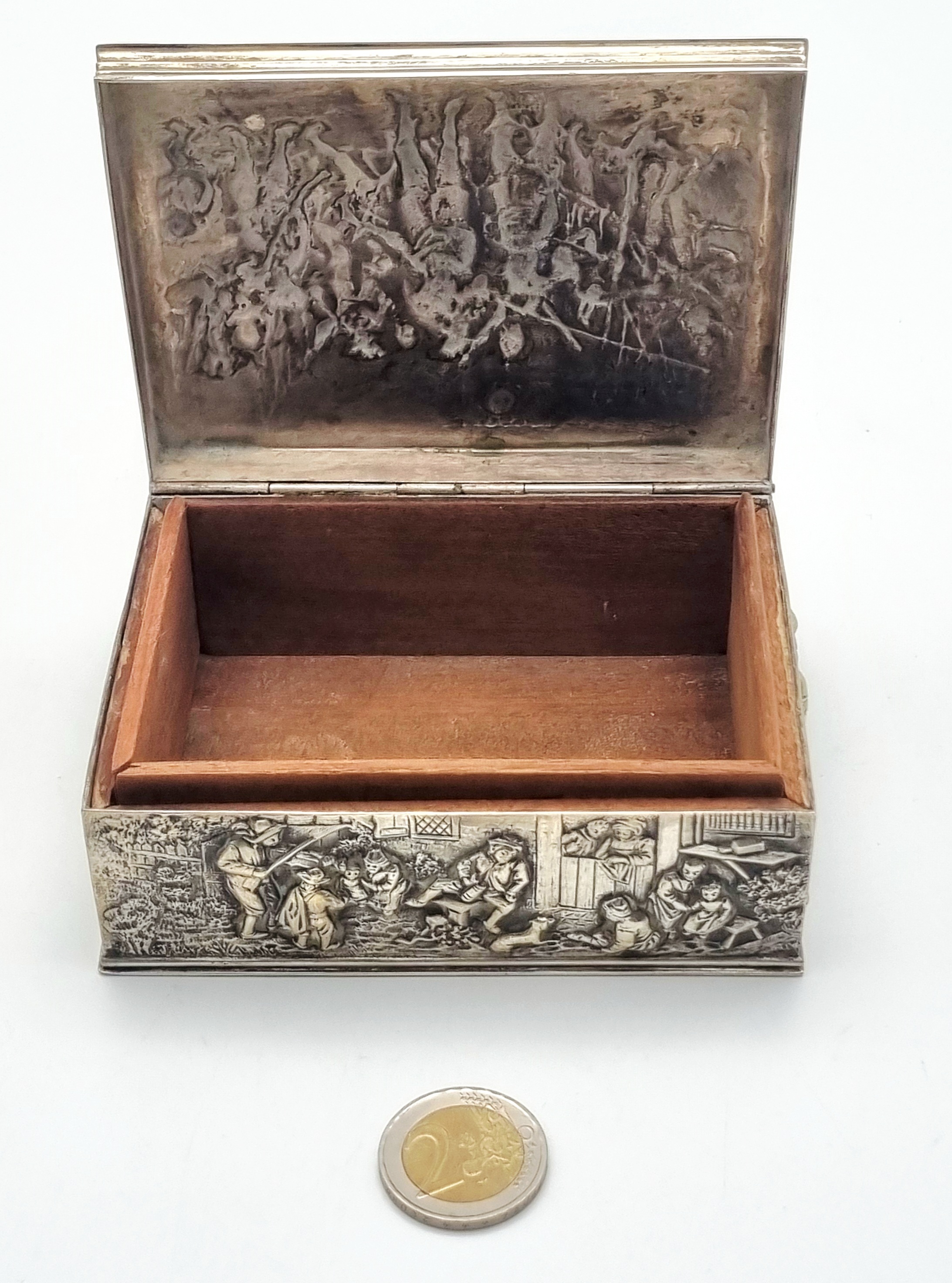 | Afmetingen | Zilveren kistje hoogte 4,8 cm en breedte 11,6 cm. Gewicht zilver 268 gram. | |