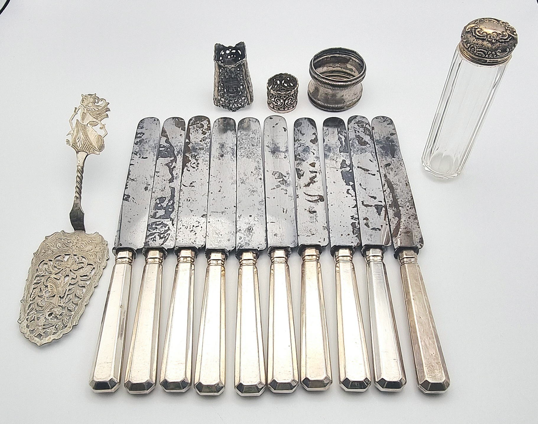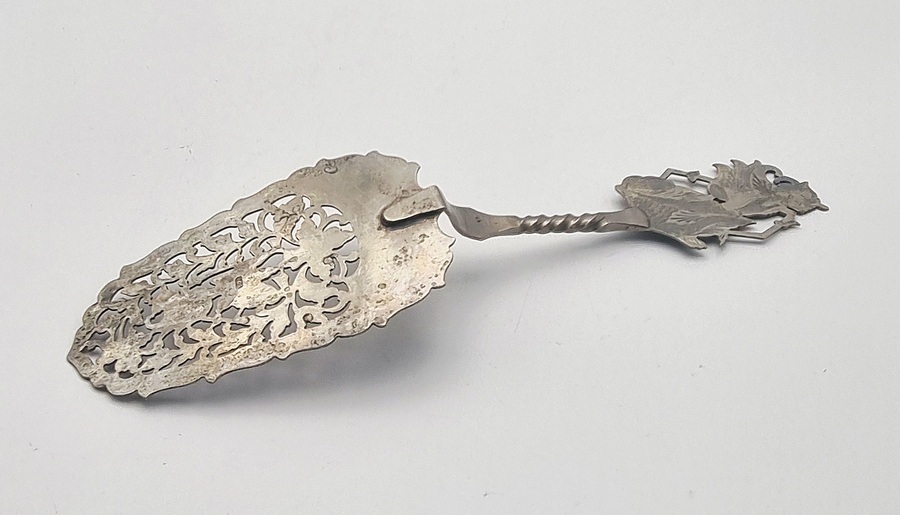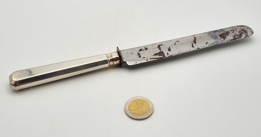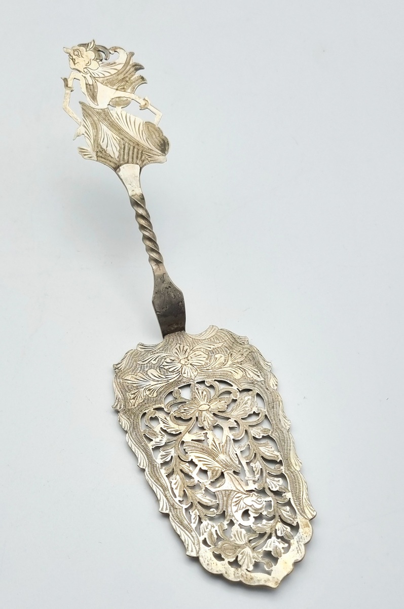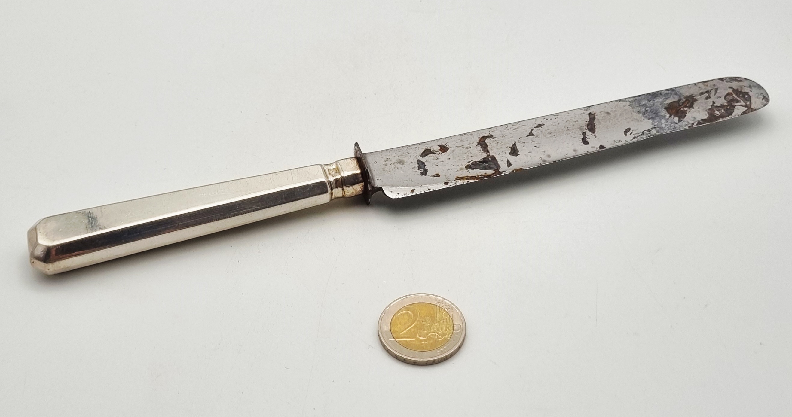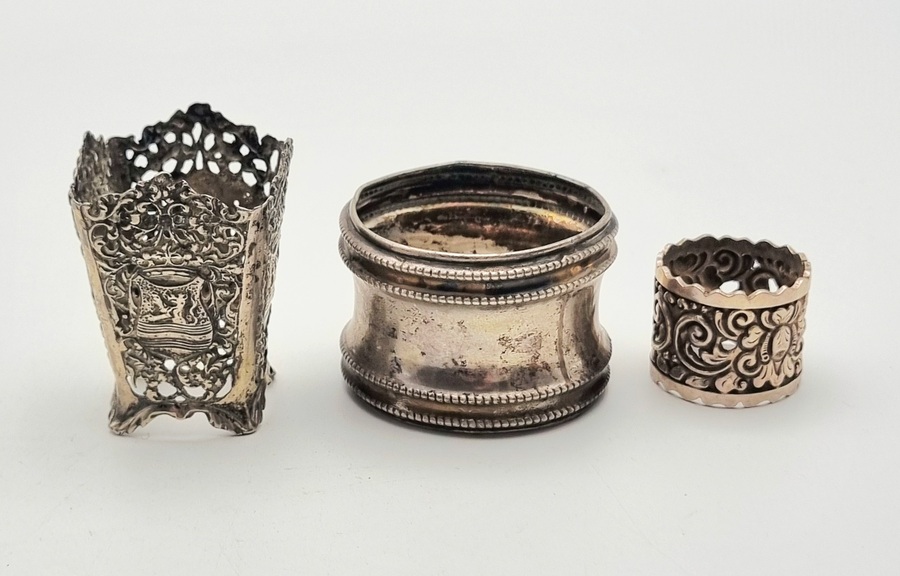 Collectie zilver tafelgerei uit de eind 19e tot begin 20e eeuw, bestaande uit tien messen met zilveren heften en stalen lemmeten, twee zilveren servetringen in variërende ajour- en gravuurdecoratie, een kleine zilveren opengewerkte maggihouder met wapenschild, een glazen voorraadpotje met zilveren deksel en een zilveren taartschep met gezaagd en gegraveerd oosters motief. Kom langs tijdens de kijkdagen (29 t/m 31 augustus) en ontdek deze zilver zelf! |