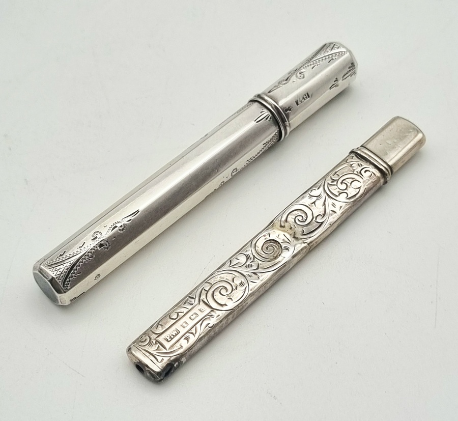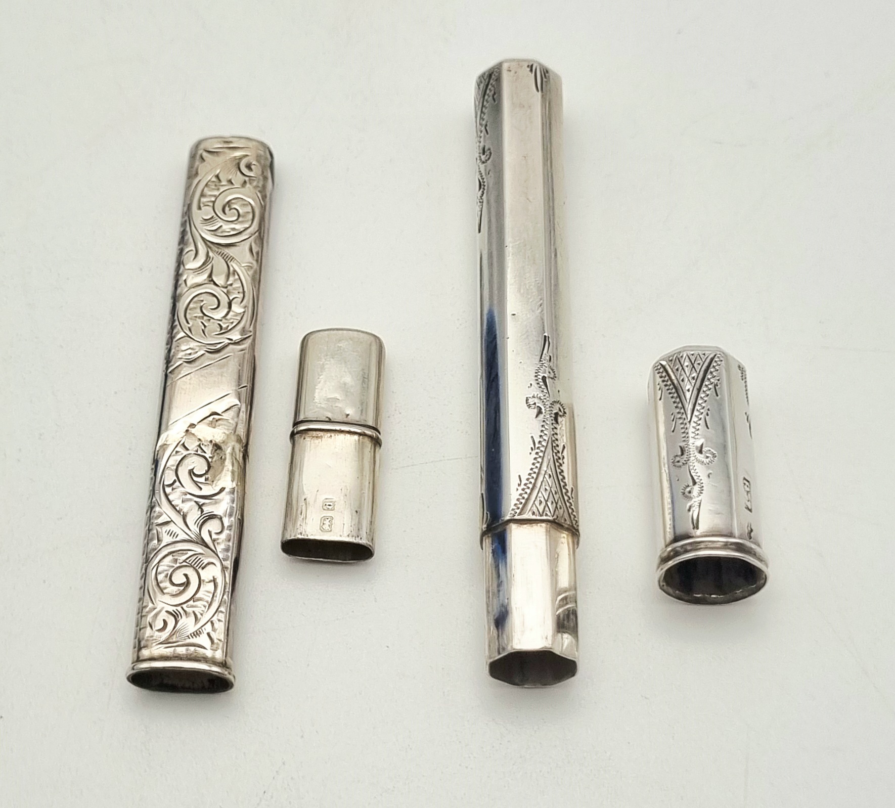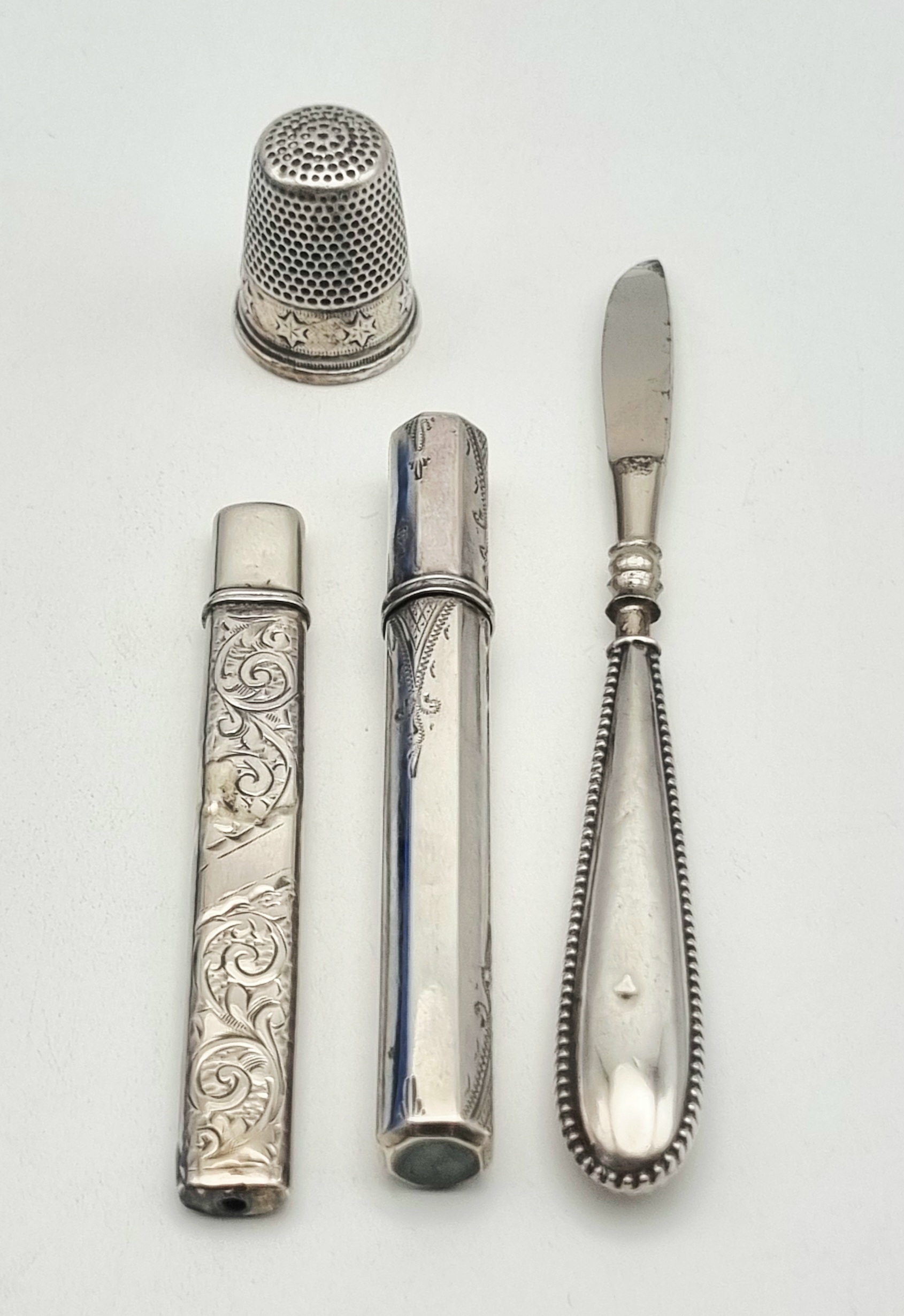 Dit zilveren naaigerei bestaat uit twee naaldkokers, een vingerhoedje en een mesje. De zilveren voorwerpen zijn in de stijl van het rococom ornament uit de late Victoriaanse periode. De langwerpige naaldkokers zijn met de hand gegraveerd met gestileerde bladeren. Verschillende zilvermerken, datering omstreeks 1900. Ontdek dit zilveren naaigerei en voeg het toe aan jouw collectie! Registreer nu voor de veiling. |