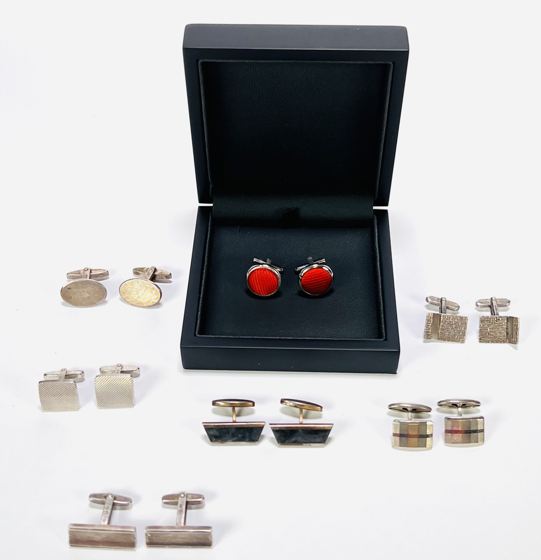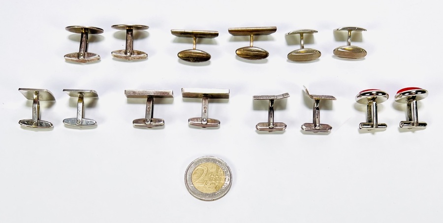 Convoluut manchetknopen van diverse materialen waaronder edelmetaal, onedel metaal en emaille. De zeven paar manchetknopen variëren in vorm met onder meer vierkante, rechthoekige en ovale exemplaren. Te zien zijn verschillende patronen, zoals een Burberry-check, een ruitpatroon en een rode streepafwerking. De manchetknopen hebben een t-bar-sluiting. Jouw collectie verdient deze manchetknopen. Schrijf je in! |