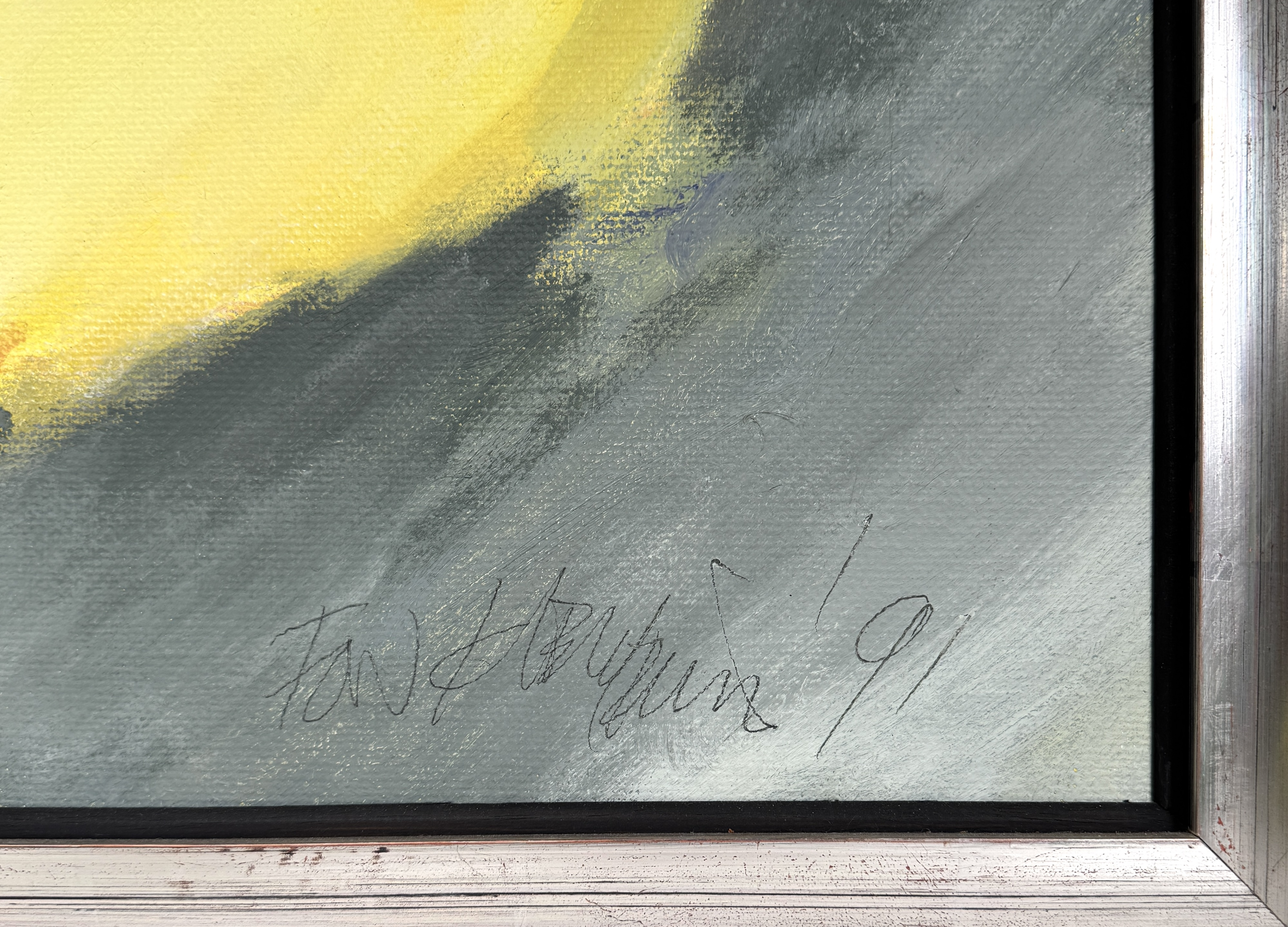 Schilderij van Alfons Klement (1930–2000), getiteld "Air de fête", 1991. Uitgevoerd in olieverf op doek, gemonteerd op spieraam en voorzien van een aluminiumkleurige lijst. Het werk toont expressieve bloemvormen in felle gele tinten tegen een grijze achtergrond. Rechtsonder gesigneerd en gedateerd, met titel, signatuur en jaartal op de achterzijde van het doek. Jouw kans op dit schilderij begint met registreren – bied live of online mee! |