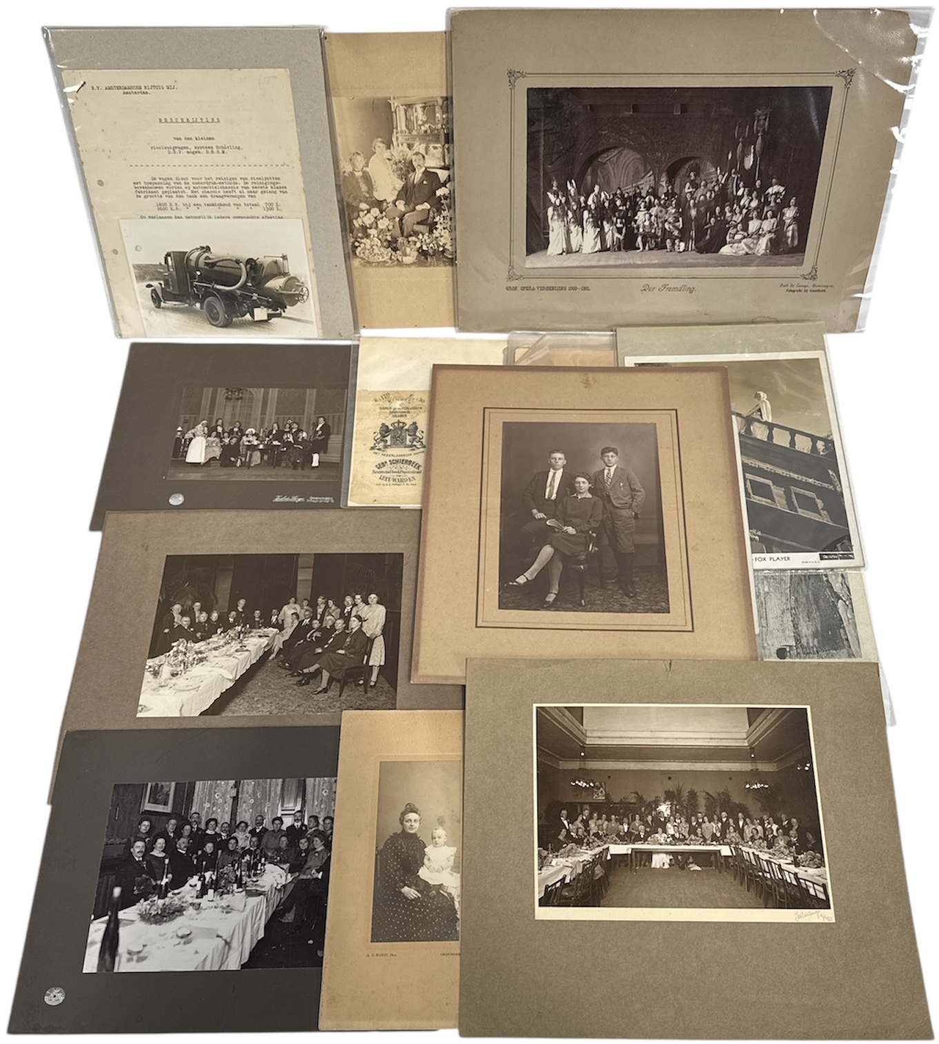 Verzameling foto’s uit eind 19e en begin 20e eeuw, deels vervaardigd door Joël de Lange (Groningen 1871 – Auschwitz 1942). Te zien zijn groepsportretten, industriële interieurs, portretfoto’s en tentoonstellingsbeelden, uitgevoerd in zilvergelatine techniek op fotopapier en gemonteerd op kartonnen dragers. Diverse exemplaren zijn onderzijde gesigneerd of gemerkt, met onder meer de stempel van Joël de Lange, Groningen. Zeker zijn van deelname? Plaats vanaf 22 augustus een schriftelijk bod online! |