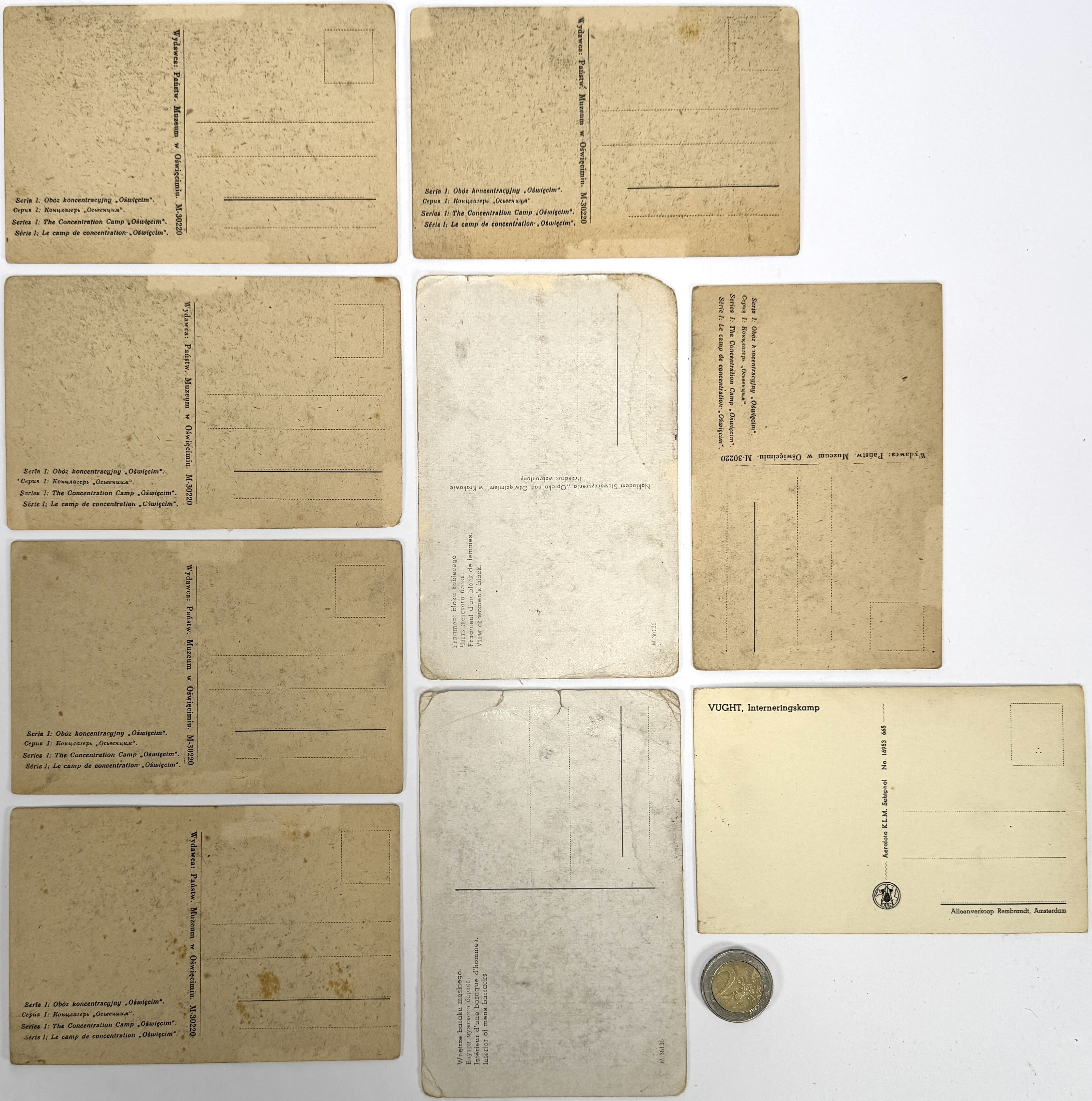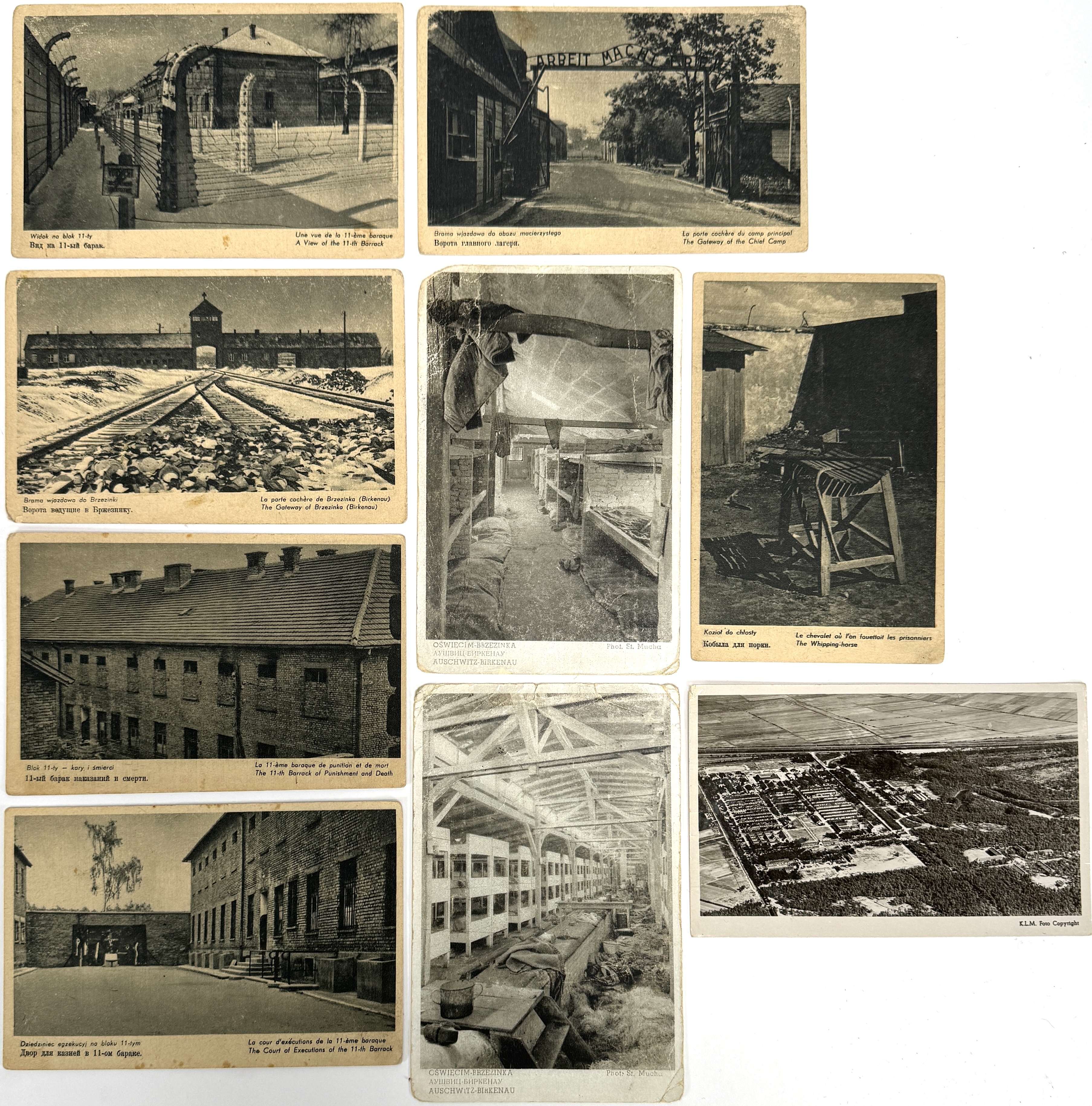 Zwart-wit fotokaarten van concentratiekampen Auschwitz en Birkenau, omstreeks jaren 1940–1950, gedrukt op karton in fotomechanische techniek. Te zien zijn onder meer de toegangspoort met het opschrift “Arbeit macht frei”, het spoortracé naar Birkenau en interieurs van barakken. Op de achterzijde meertalige aanduidingen van de series, één kaart gemerkt “VUGHT, interneringskamp”. Ontdek deze zwart-wit fotokaarten en voeg het toe aan jouw collectie! Registreer nu voor de veiling. |