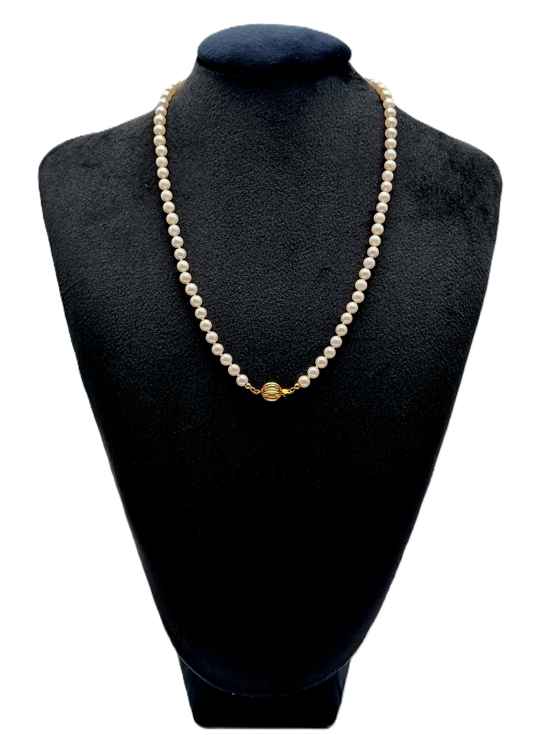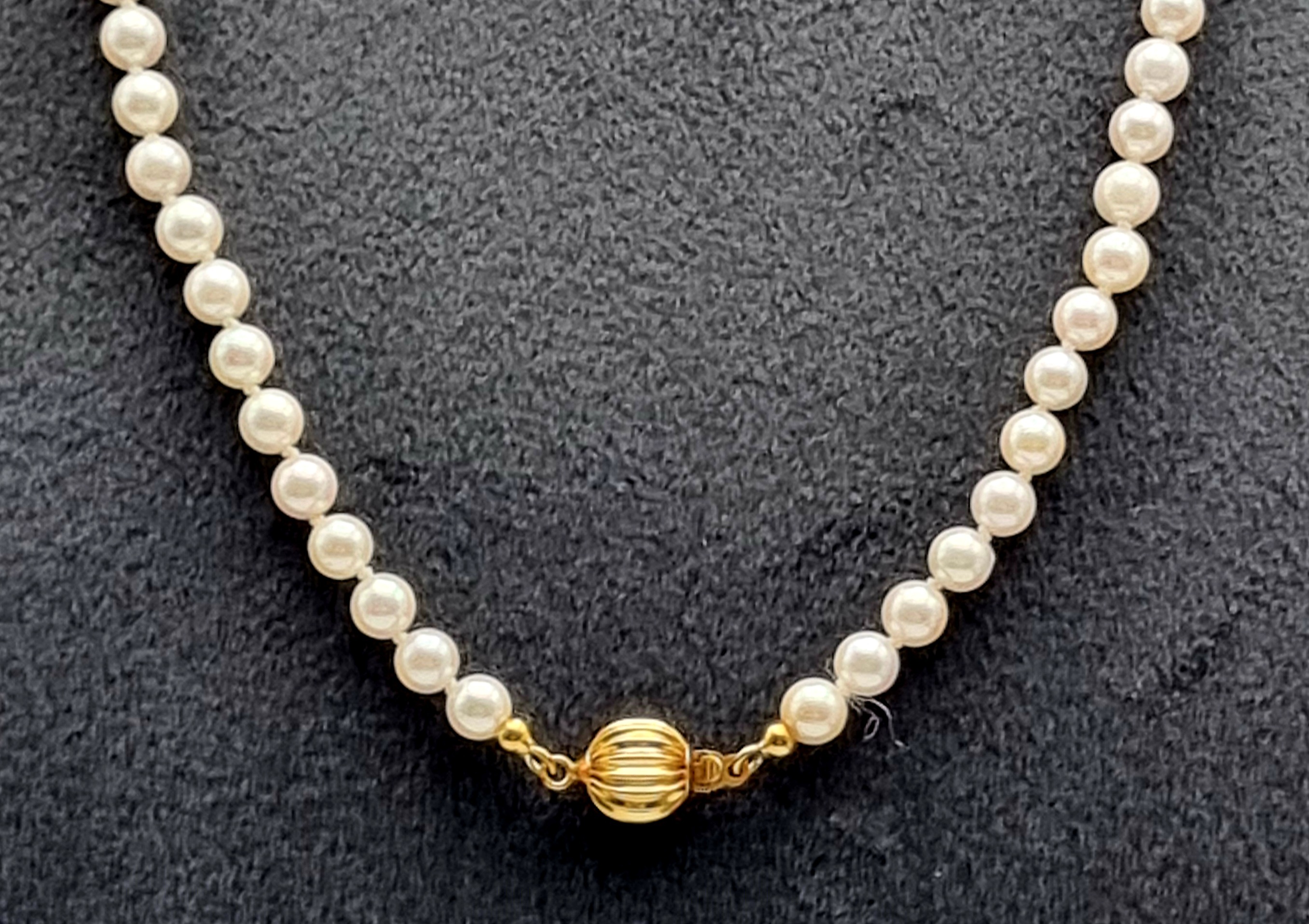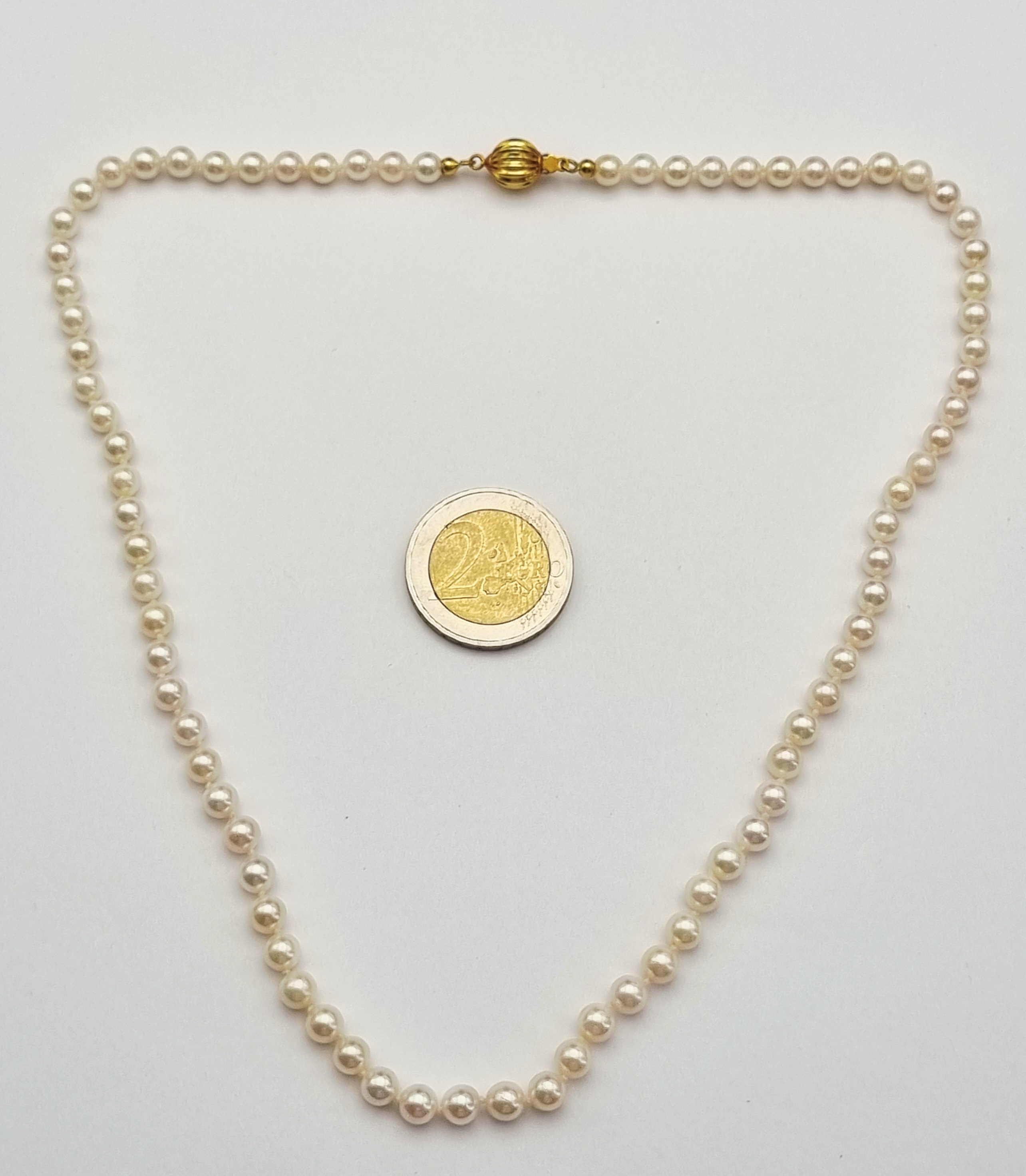 Parelcollier uit de 20e eeuw, samengesteld uit wit-crèmekleurige cultivéparels. De streng is handgeknoopt en voorzien van een ronde, geprofileerde sluiting in 14 karaat goud. Kenmerkend zijn de gelijkmatig ronde parels en de goudkleurige sluiting met ribbelstructuur. Dit parel collier met gouden slot zelf beoordelen? Je bent welkom op onze kijkdagen op 29, 30 en 31 augustus! |