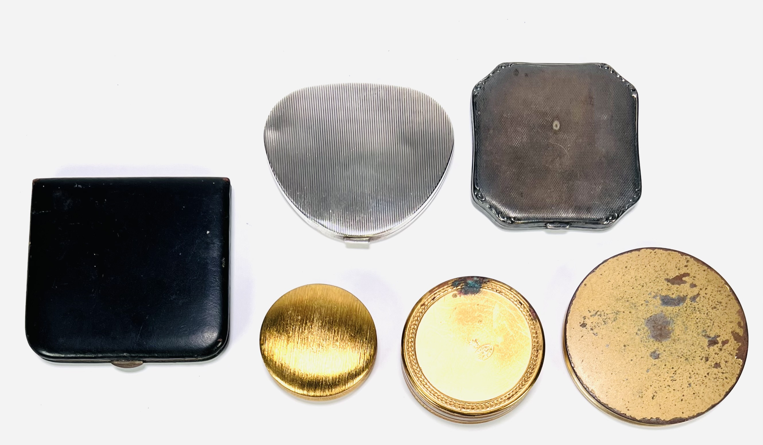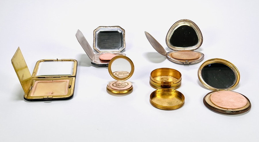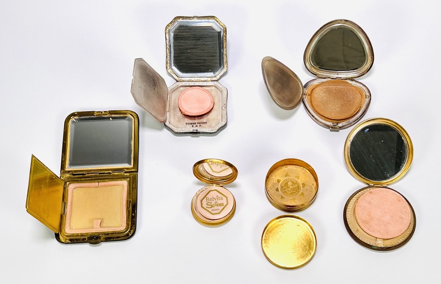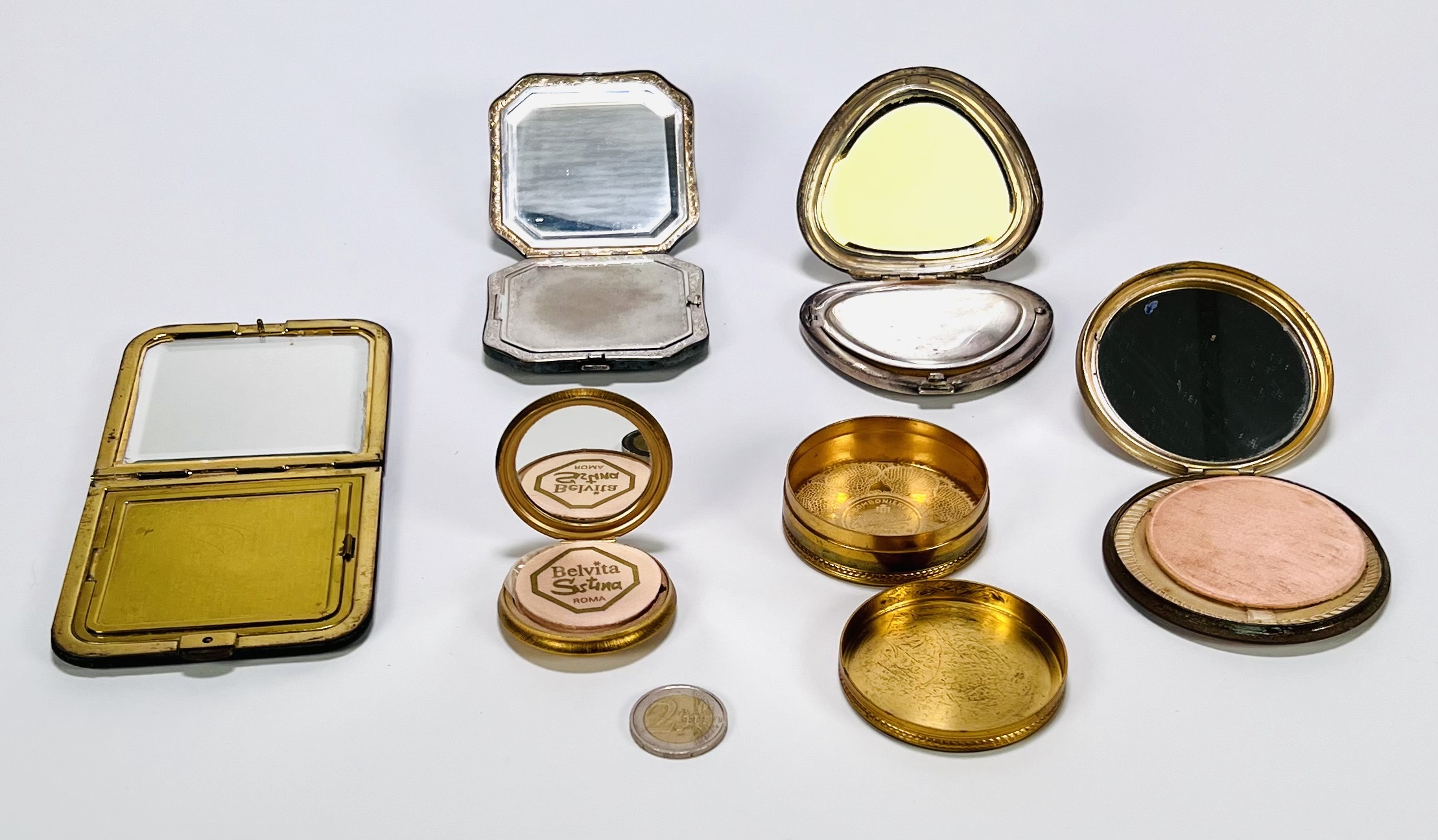 Zes poederdozen in Art Deco en modernistische stijl, midden 20e eeuw, uitgevoerd in metaal waaronder één in sterling 925 gemerkt aan de onderzijde. Varianten in ronde, driehoekige, rechthoekige en achthoekige vorm, gravure en gladde afwerking. Enkele exemplaren met merkaanduiding, waaronder Belvita Súna, Roma, allen met spiegel en poedercompartiment. Geïnteresseerd? Bezoek onze kijkdagen op 29, 30 of 31 augustus van 11:00 tot 17:00 uur! |