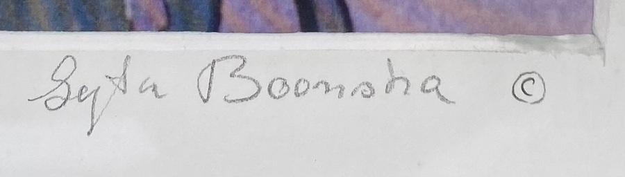 Litho op papier in abstract-expressionistische stijl uit de tweede helft 20e eeuw. Het werk is getiteld “Inwijding”, linksonder genummerd 3/200 en rechtsonder met potlood gesigneerd “Syta Boonstra ©”. De voorstelling toont vloeiende druipvormen in paars, blauw en geel en is gevat in een crèmekleurige lijst. Klaar om te bieden? Registreer je nu en doe mee aan de veiling! |