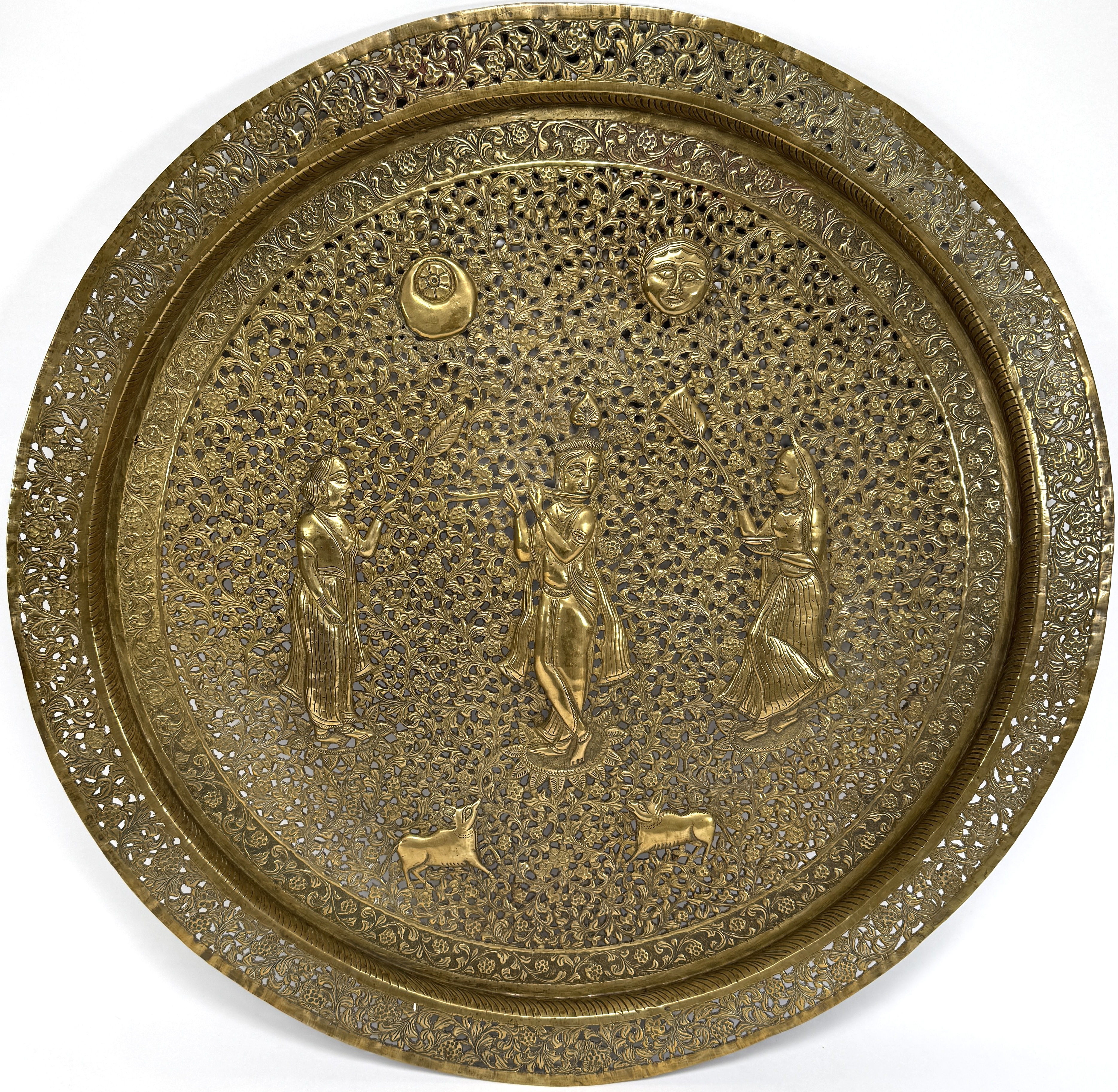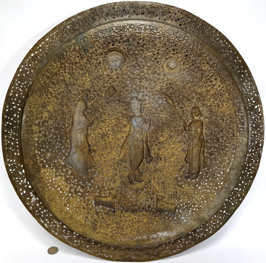 Messing schaal met ajourdecoratie, midden 20e eeuw, Indo-Perzische traditie. De voorstelling toont centraal een dansende figuur geflankeerd door twee vrouwen met waaiers, bovenaan de zon en de maan, onderaan twee herten. De achtergrond is gevuld met florale patronen, omlijst door een brede geperforeerde rand. Uitgevoerd in gehamerde en gegraveerde techniek. Wil je deze schaal in het echt bekijken? Kom naar de kijkdagen op 29, 30 en 31 augustus! |