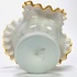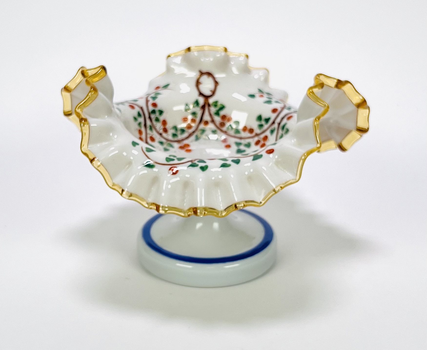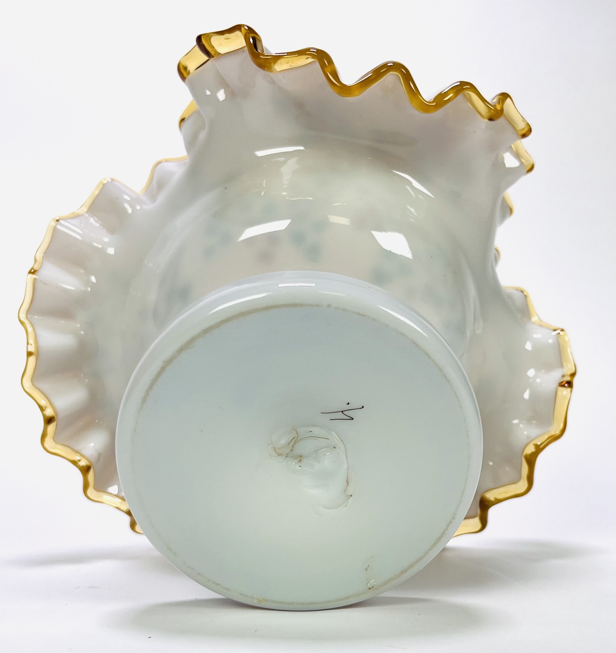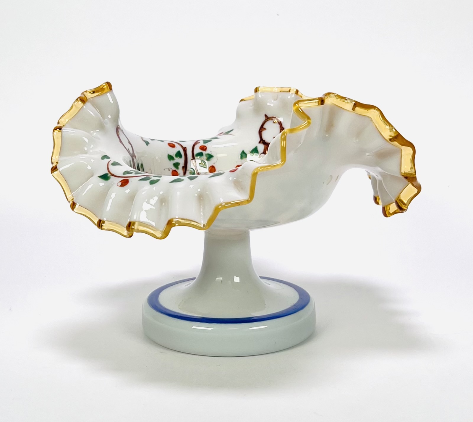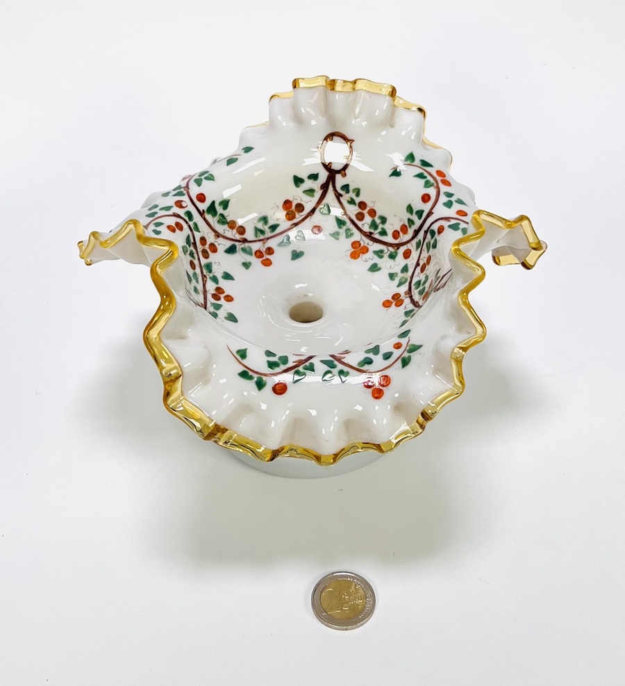 Opaline schaal, eind 19e eeuw, uitgevoerd in handbeschilderd glas met geplooide rand, voorzien van goudkleurige afwerking. De kom toont festoenen met rode bessen en groene bladeren, aangevuld met bruine lijnen. De ronde voet is versierd met een blauwe bies. Registreer nu en bied eenvoudig online mee op deze schaal! |