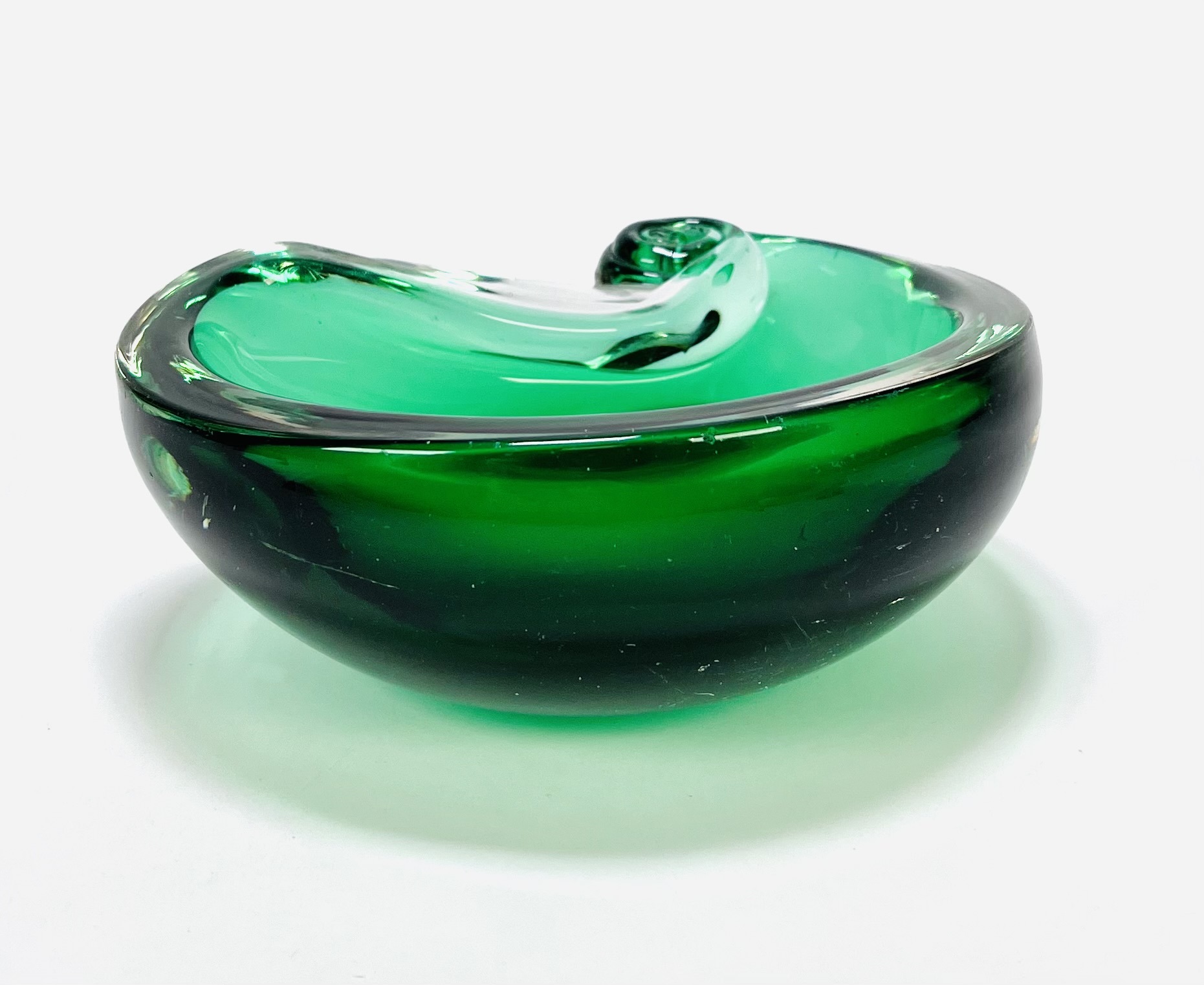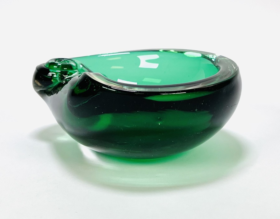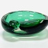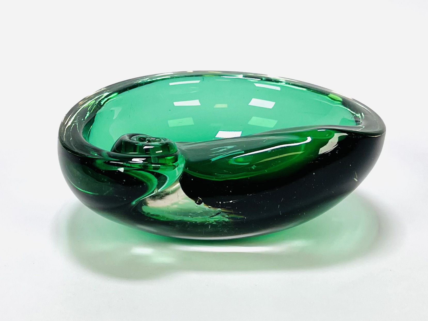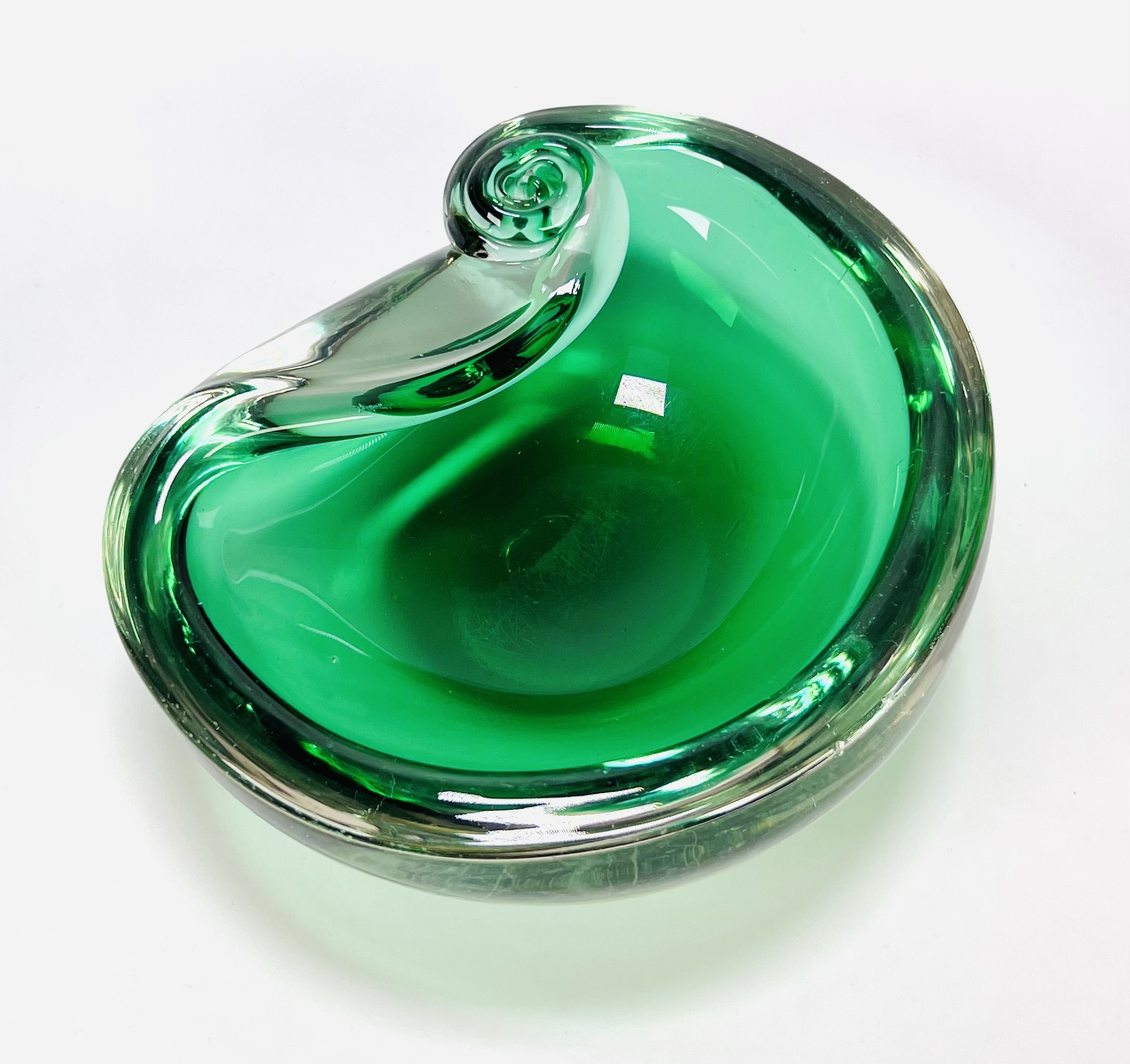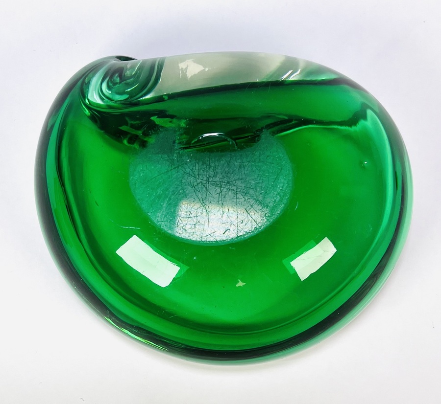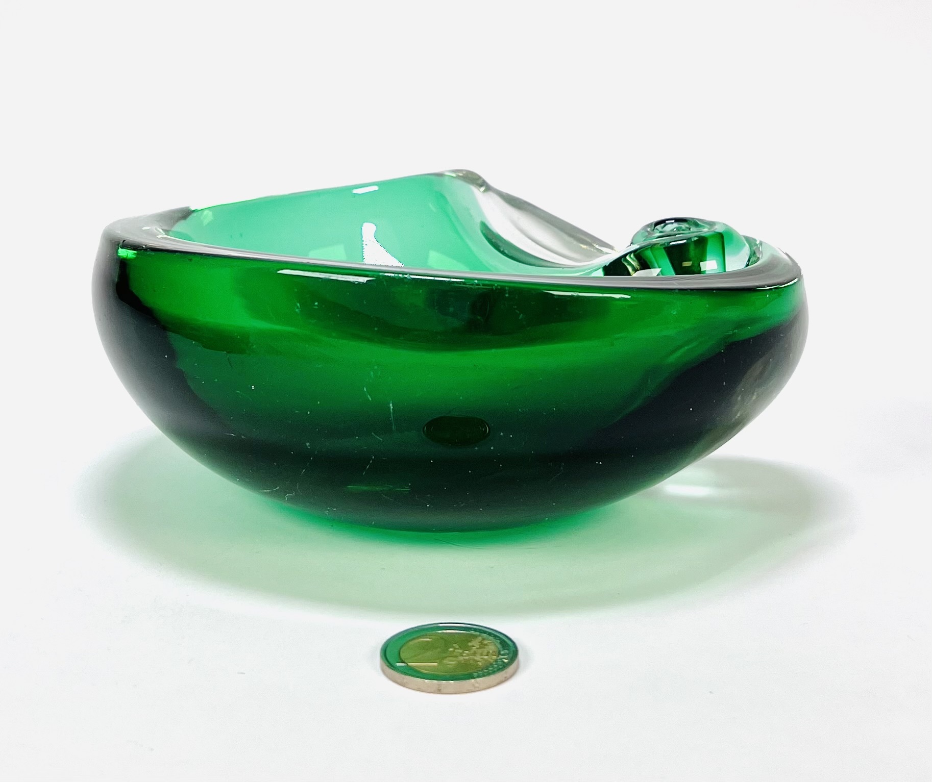 Glazen schaal in modernistische stijl, midden 20e eeuw, uitgevoerd in handgeblazen groen transparant glas met kleurverloop naar helder glas aan de rand. Een asymmetrische ontwerp met spiraalvormige rand en een diepe centrale komvorm. Deze schaal wacht op een nieuwe eigenaar. Doe mee met de veiling! |