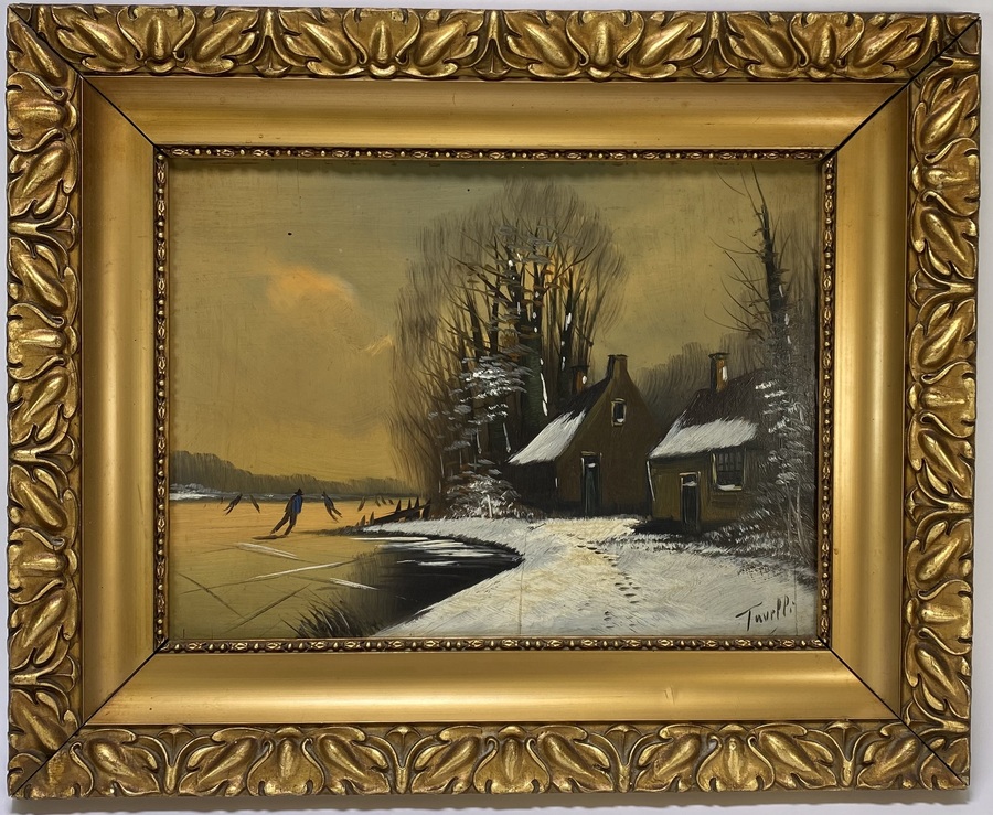 Olieverfschilderij Tavelli, winterlandschap met schaatsers, 20e eeuw, Nederland
