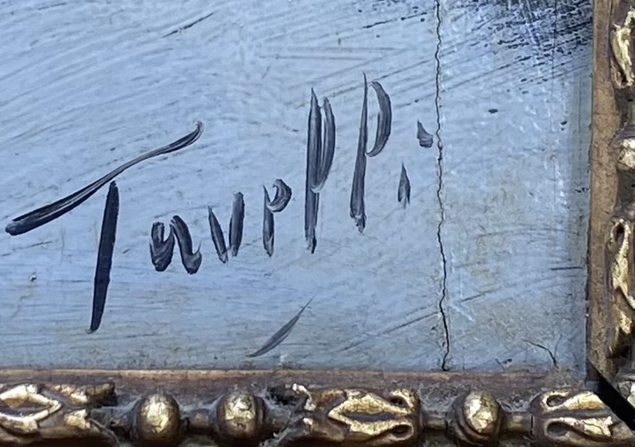 Schilderij in Hollandse landschapsstijl met wintervoorstelling, midden tot tweede helft 20e eeuw. Voorstelling van een besneeuwd pad langs twee huizen, kale bomen en een bevroren waterpartij met schaatsers. Uitgevoerd in olieverf op paneel, met warm geel getinte lucht en contrasterende sneeuwpartijen. Rechtsonder gesigneerd Tavelli. Het werk is gevat in een goudkleurige lijst met rijk bladornament. Geïnteresseerd? Bezoek onze kijkdagen op 29, 30 of 31 augustus van 11:00 tot 17:00 uur! |