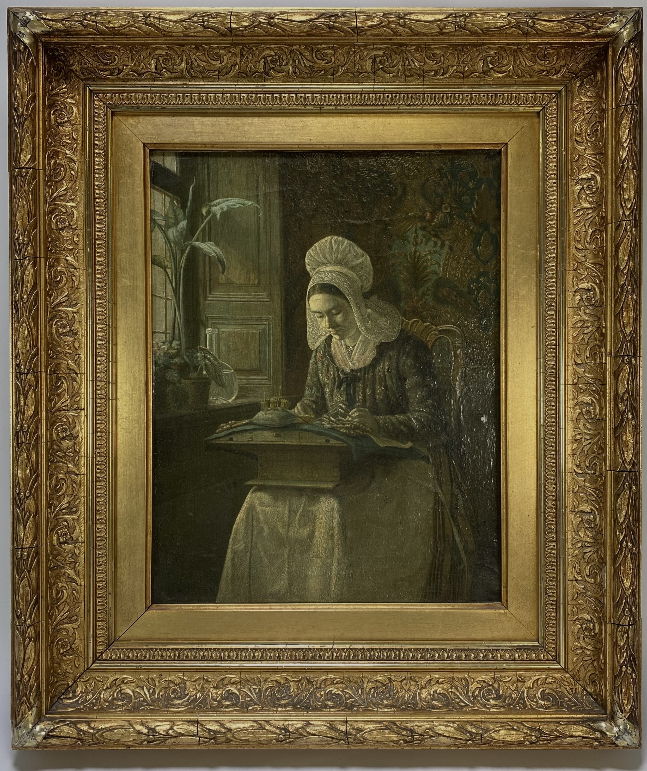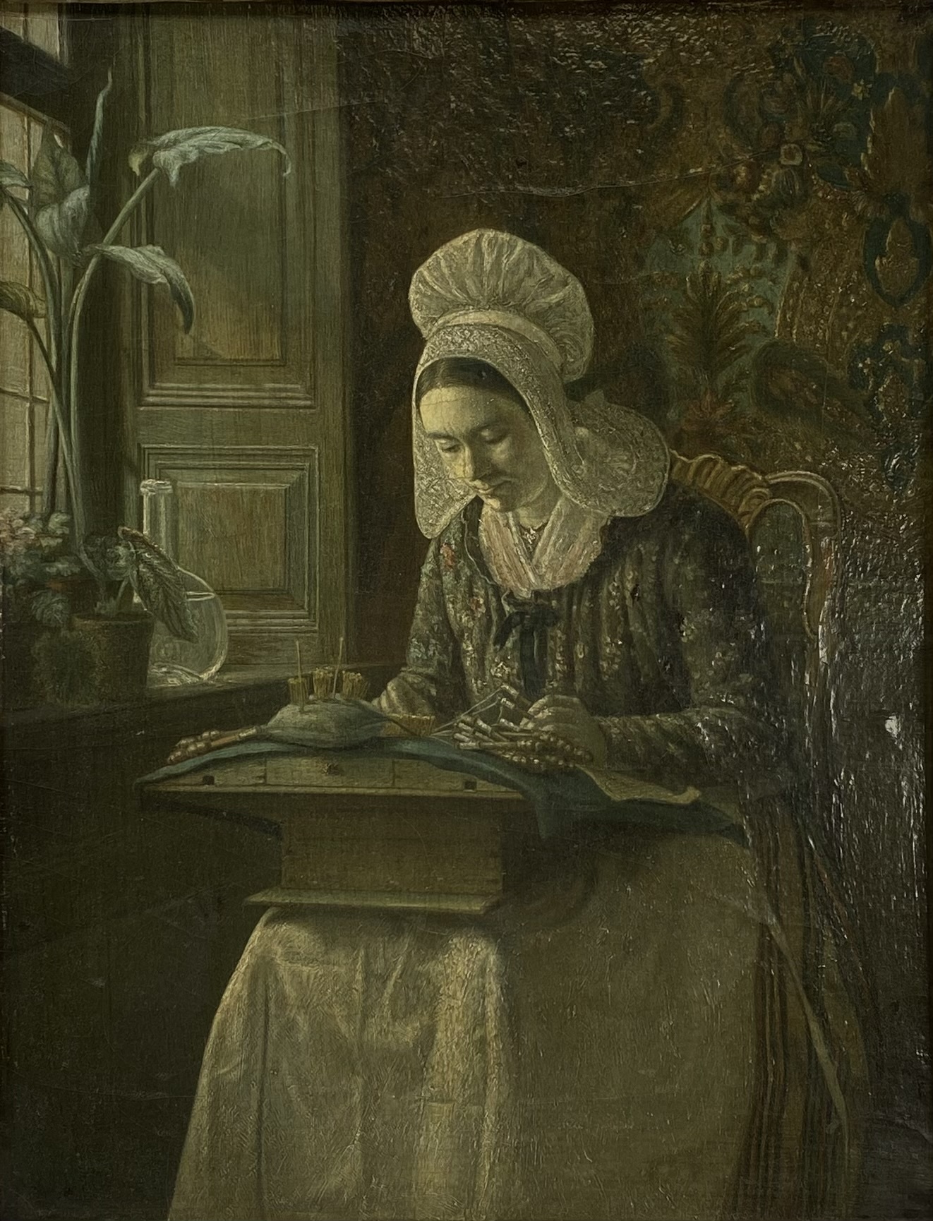 Olieverfschilderij, vrouw kantklossend in interieur, tweede helft 19e eeuw