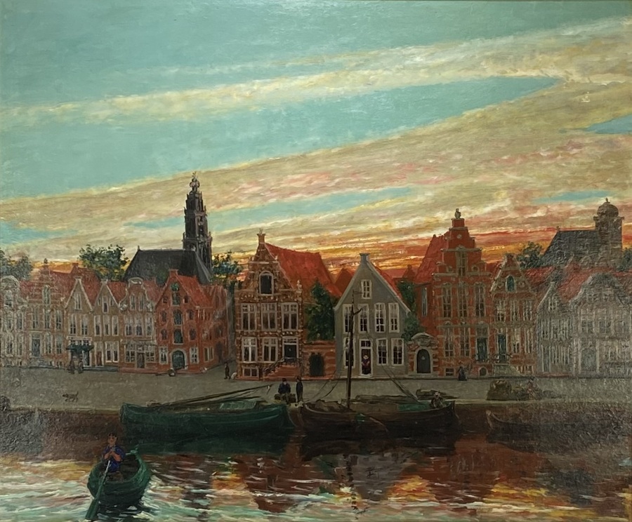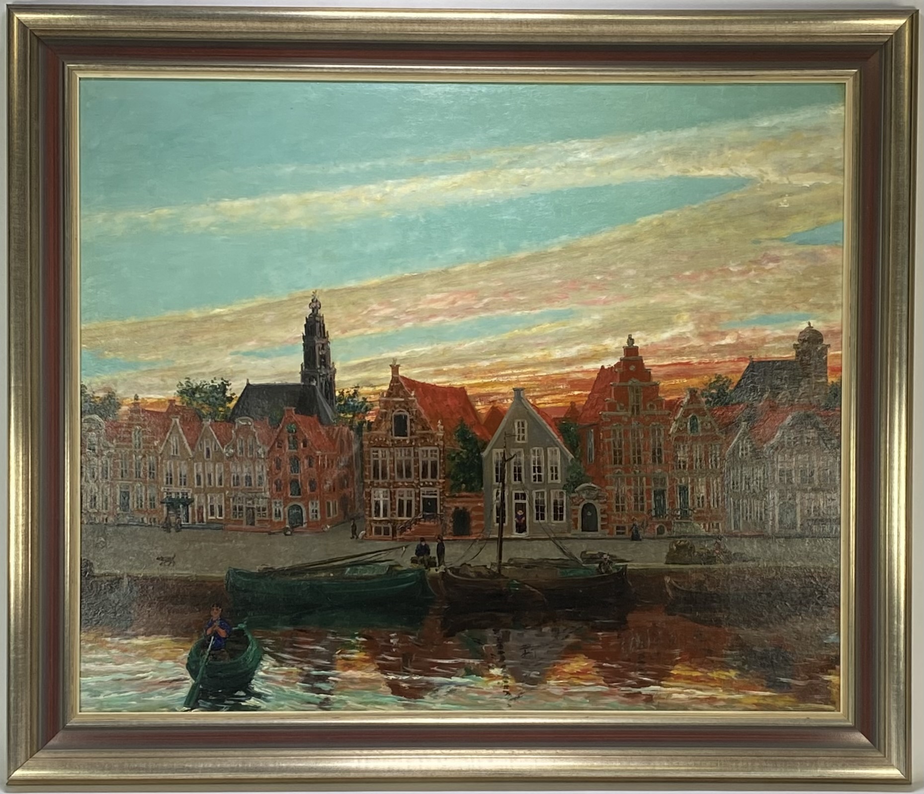 Schilderij op doek, circa 1950, in een impressionistische stijl. De voorstelling toont een stadsgezicht aan het water met huizen en boten, bij zonsondergang. Ingelijst in een houten lijst met een goudkleurige binnenrand. Geïnteresseerd? Bezoek onze kijkdagen op 29, 30 of 31 augustus van 11:00 tot 17:00 uur! |