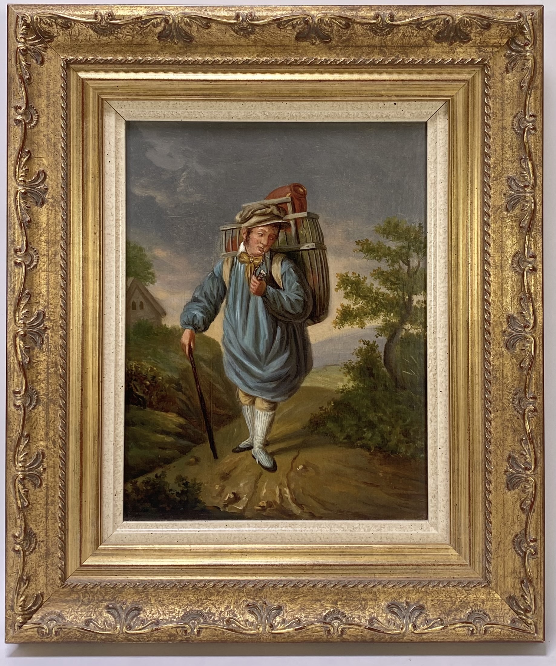 Olieverfschilderij, reiziger met pijp en vat, eerste helft 19e eeuw