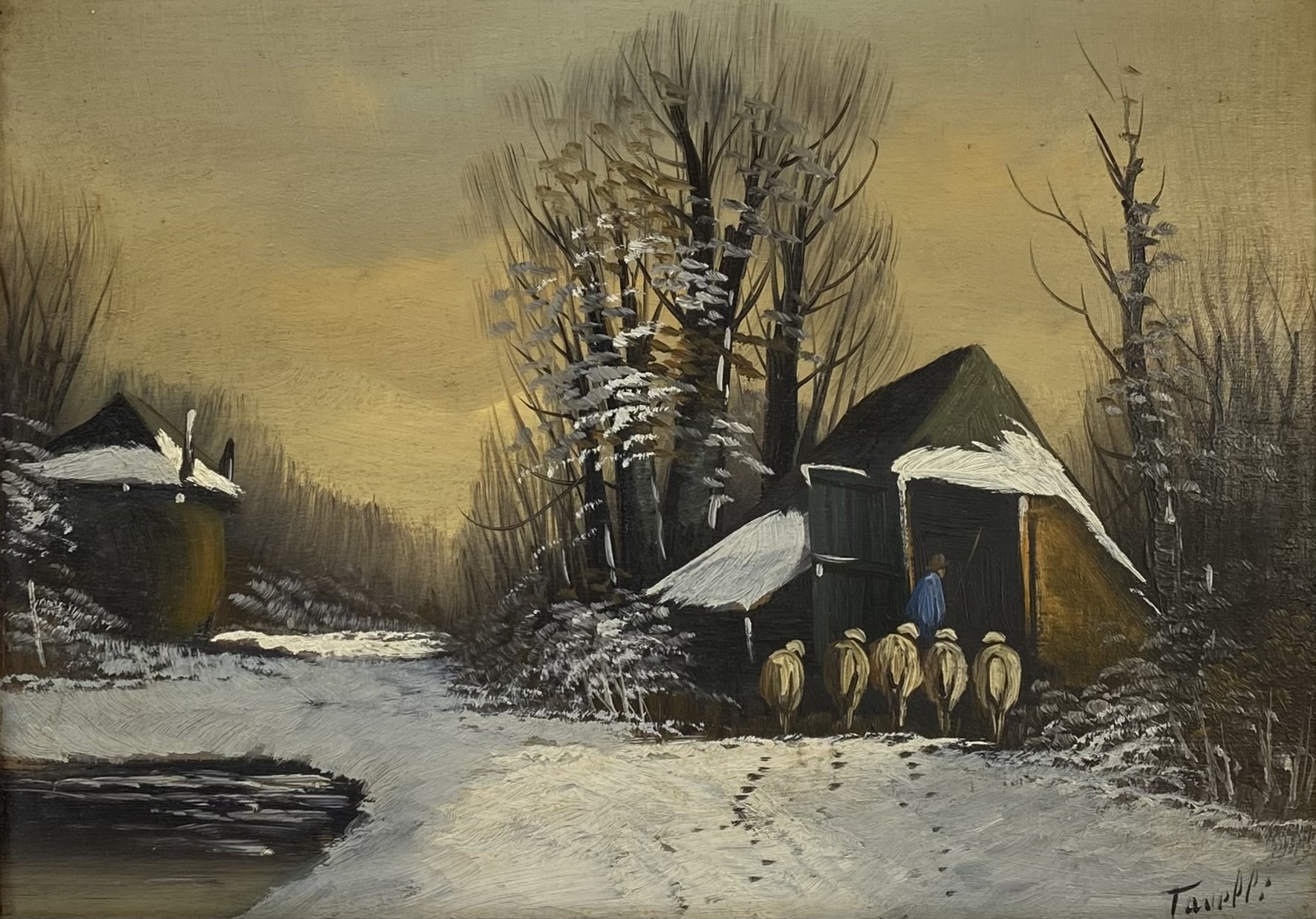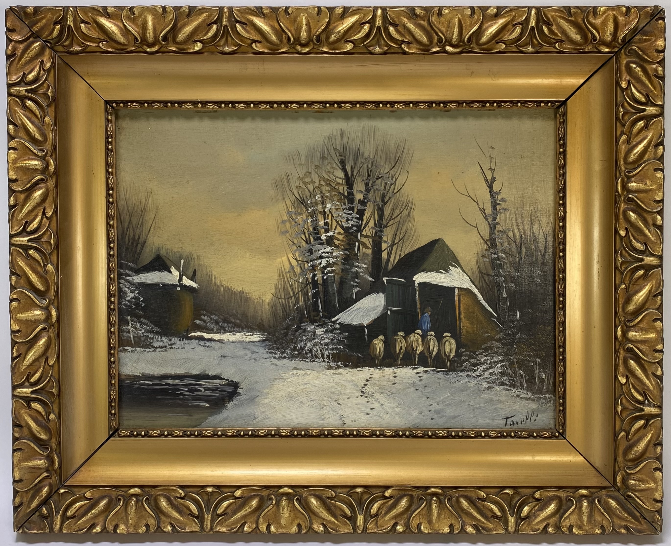 Schilderij Tavelli, winterlandschap met schapen, midden 20e eeuw