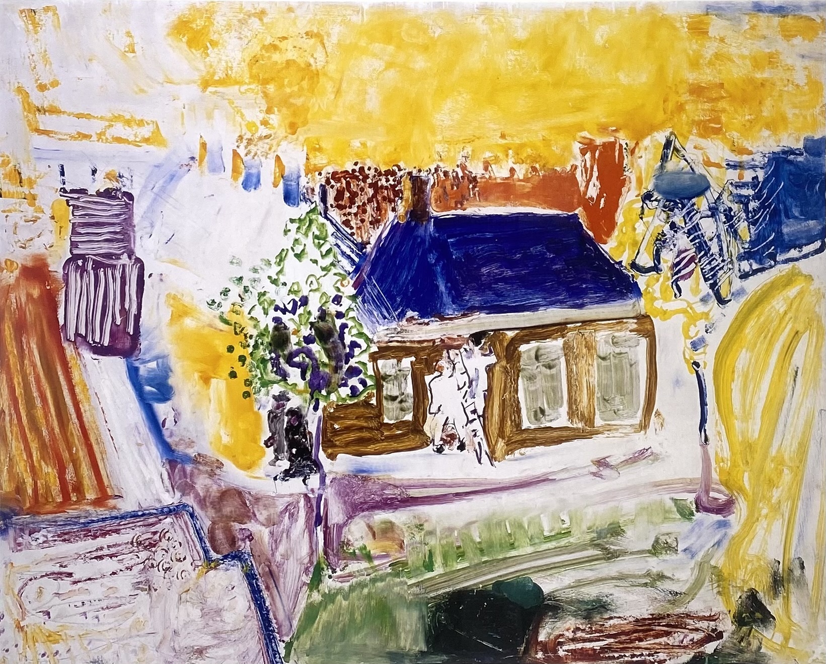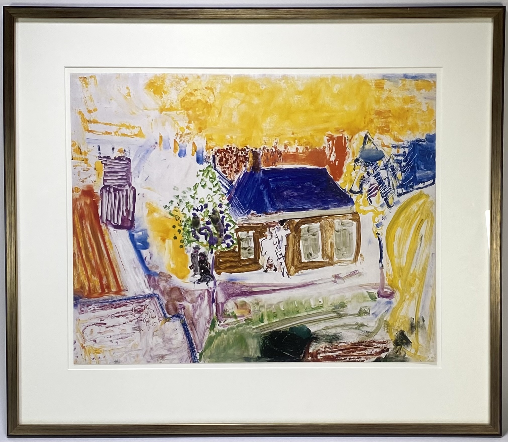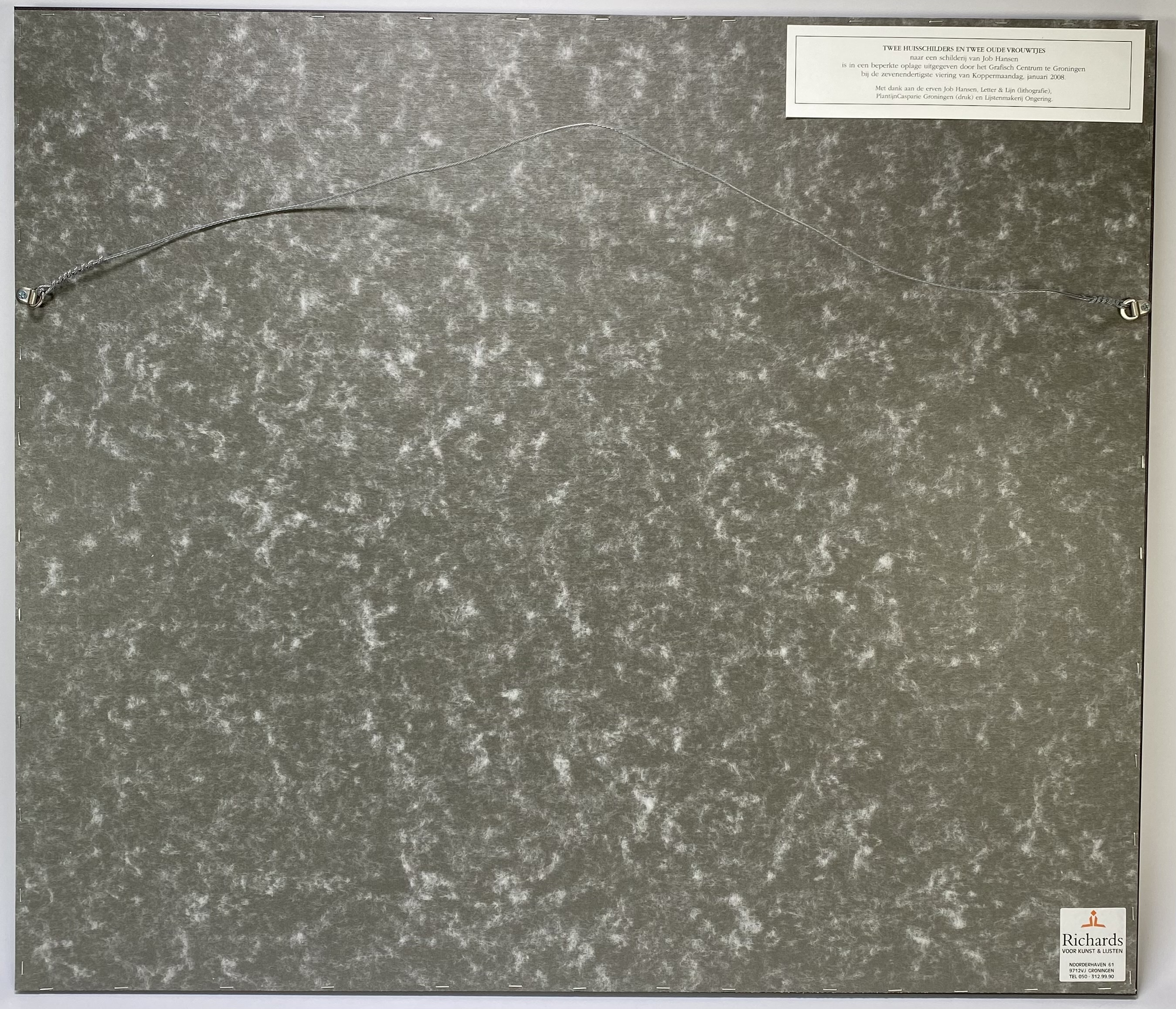 Kopperprent van Job Hensen (1965) uit 2008, in een expressionistische stijl. De prent is in een beperkte oplage uitgegeven door het Grafisch Centrum te Groningen ter gelegenheid van de Koppermaandagviering. Het werk heeft als titel "Twee huisschilders en twee oude vrouwtjes". De voorstelling toont een huis met een blauw dak en gele muren. De prent is ingelijst in een zwarte houten lijst. Geïnteresseerd? Bezoek onze kijkdagen op 29, 30 of 31 augustus van 11:00 tot 17:00 uur! |