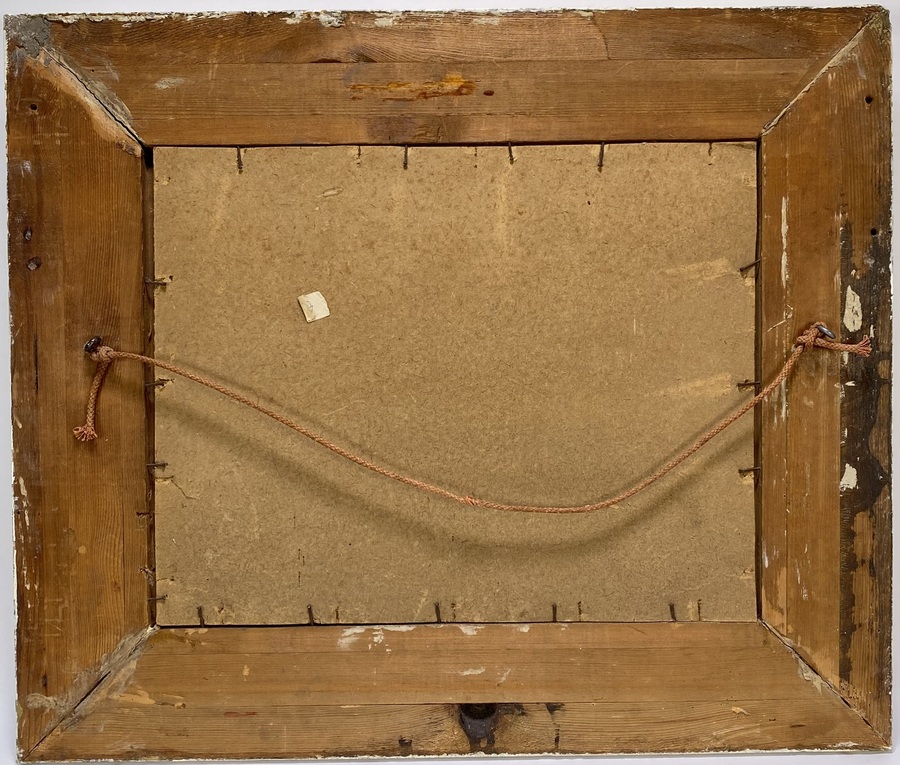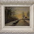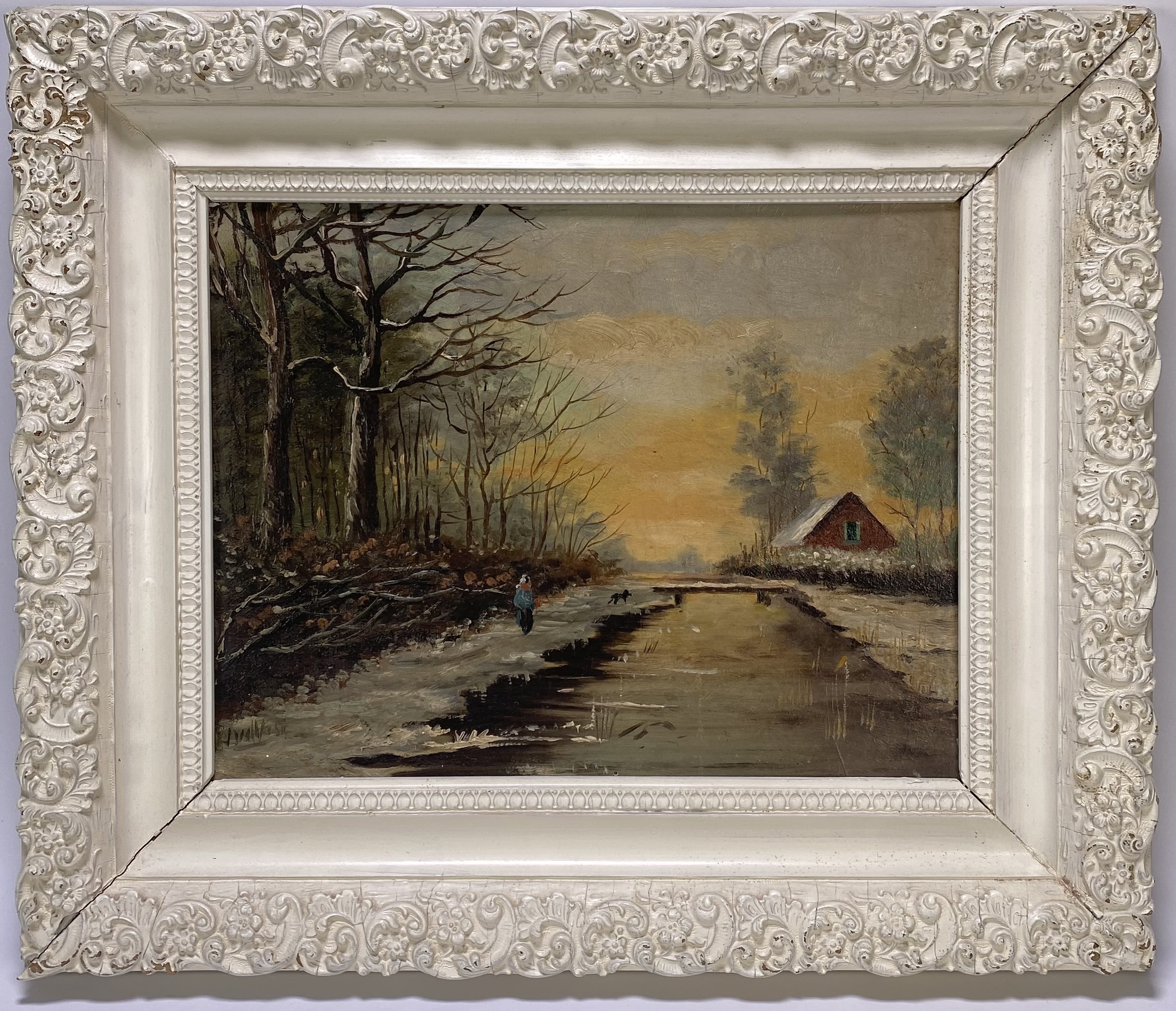 Schilderij in naturalistische stijl, olieverf op doek, eind 19e tot begin 20e eeuw, met voorstelling van een winters Nederlands landschap met kanaal, wandelaar en hond, en een bakstenen huis met besneeuwd dak. De avondlucht is warm oranjegeel geschilderd en contrasteert met de koude tonen van sneeuw en bomen. Het werk is gevat in een rijk geornamenteerde witgeschilderde houten lijst. Jouw kans op dit schilderij begint met registreren – bied live of online mee! |
