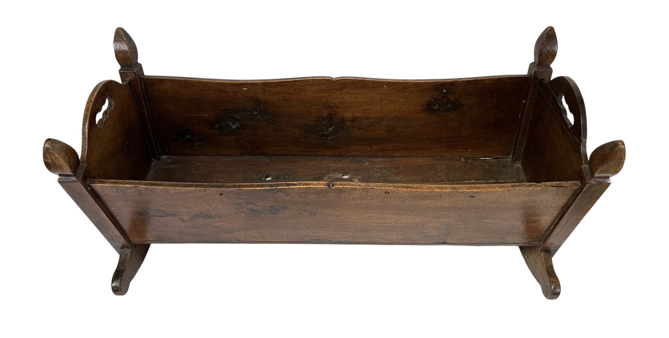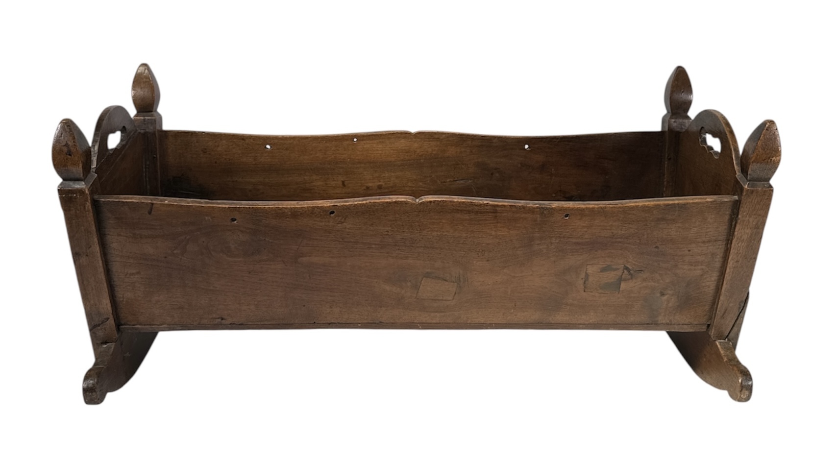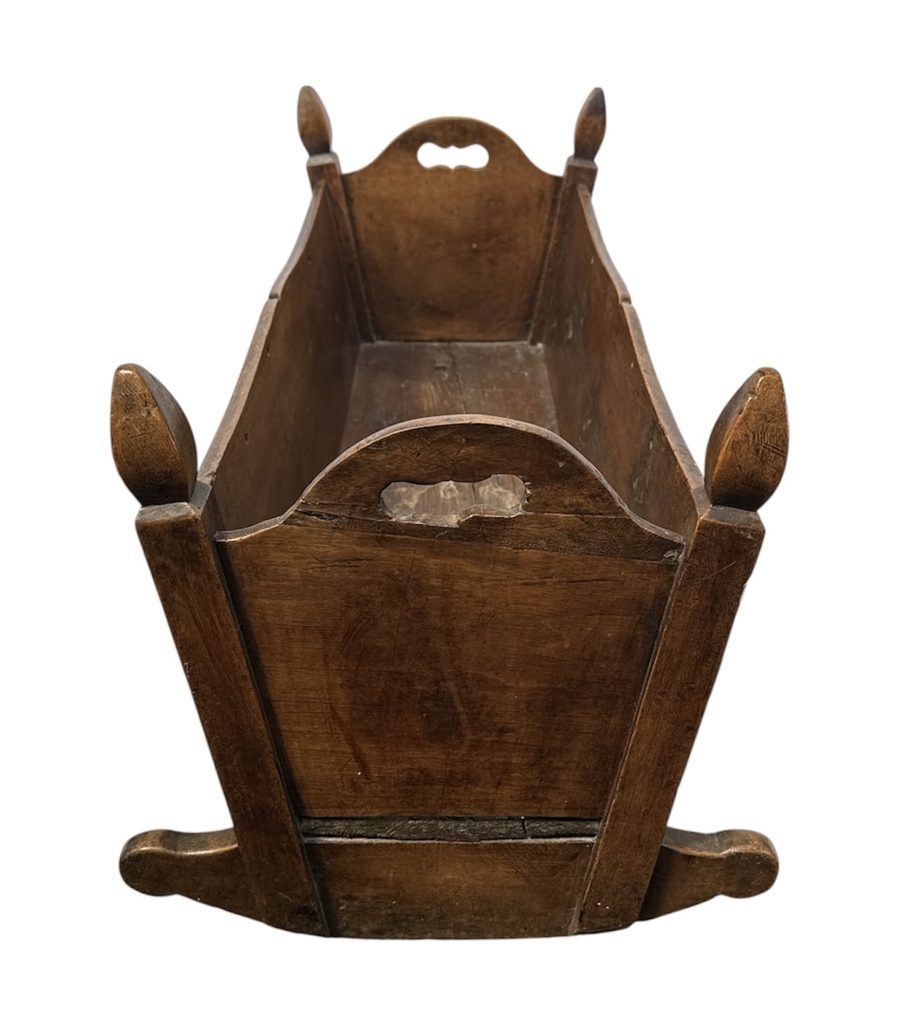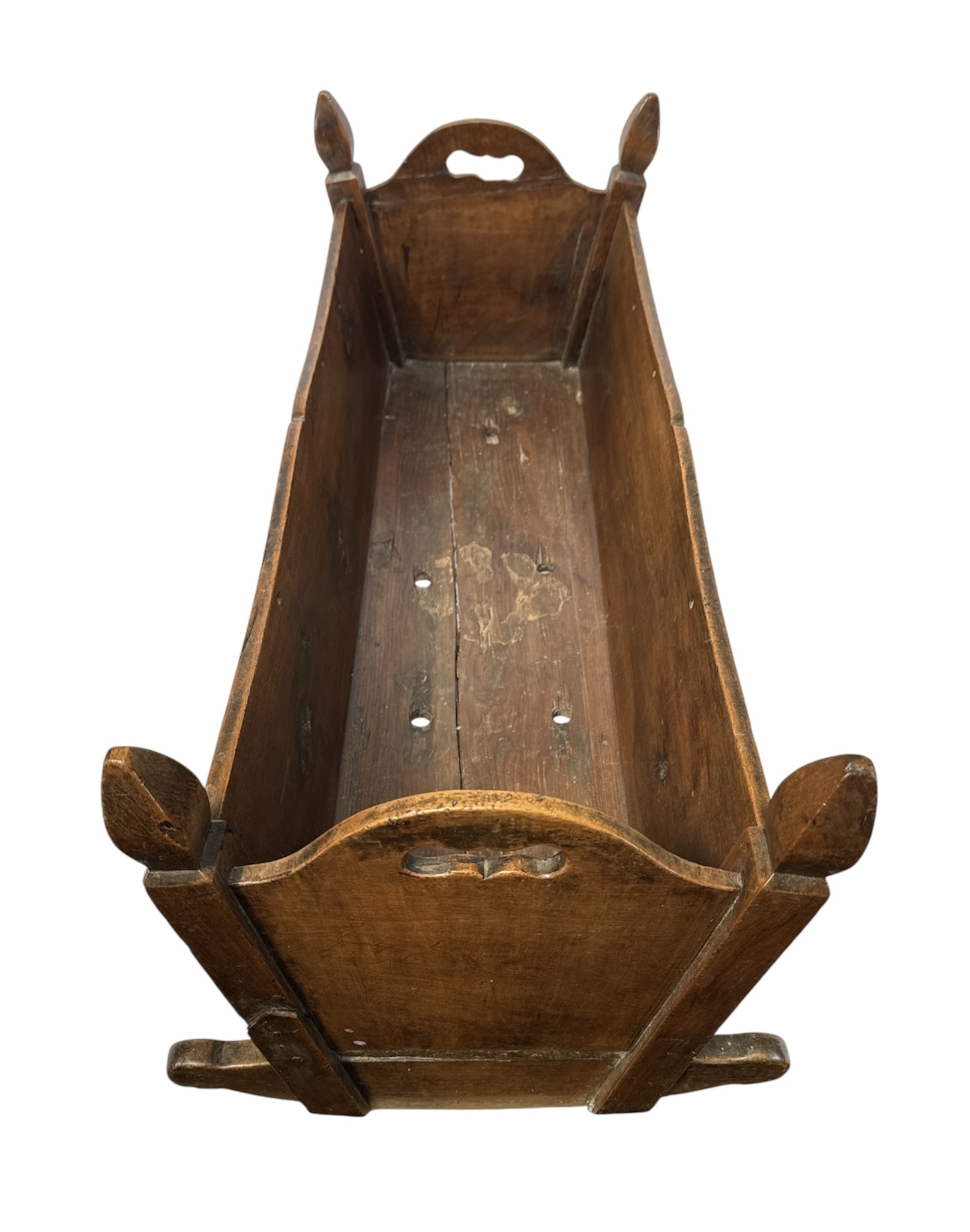 Een antieke houten schommelwieg uit de 19e eeuw, vervaardigd van donkerkleurig hout. De wieg heeft een rechthoekige vorm met hoge zijkanten en is aan de korte zijden voorzien van gedecoreerde handgrepen. Het object is gemonteerd op twee gebogen schommelpoten, waardoor het de schommelfunctie heeft. De schommelwieg is een voorbeeld van traditionele houtbewerking en volkskunst. Zien voordat u biedt? Bezoek onze kijkdagen op 29, 30 en 31 augustus van 11:00 tot 17:00 uur! |