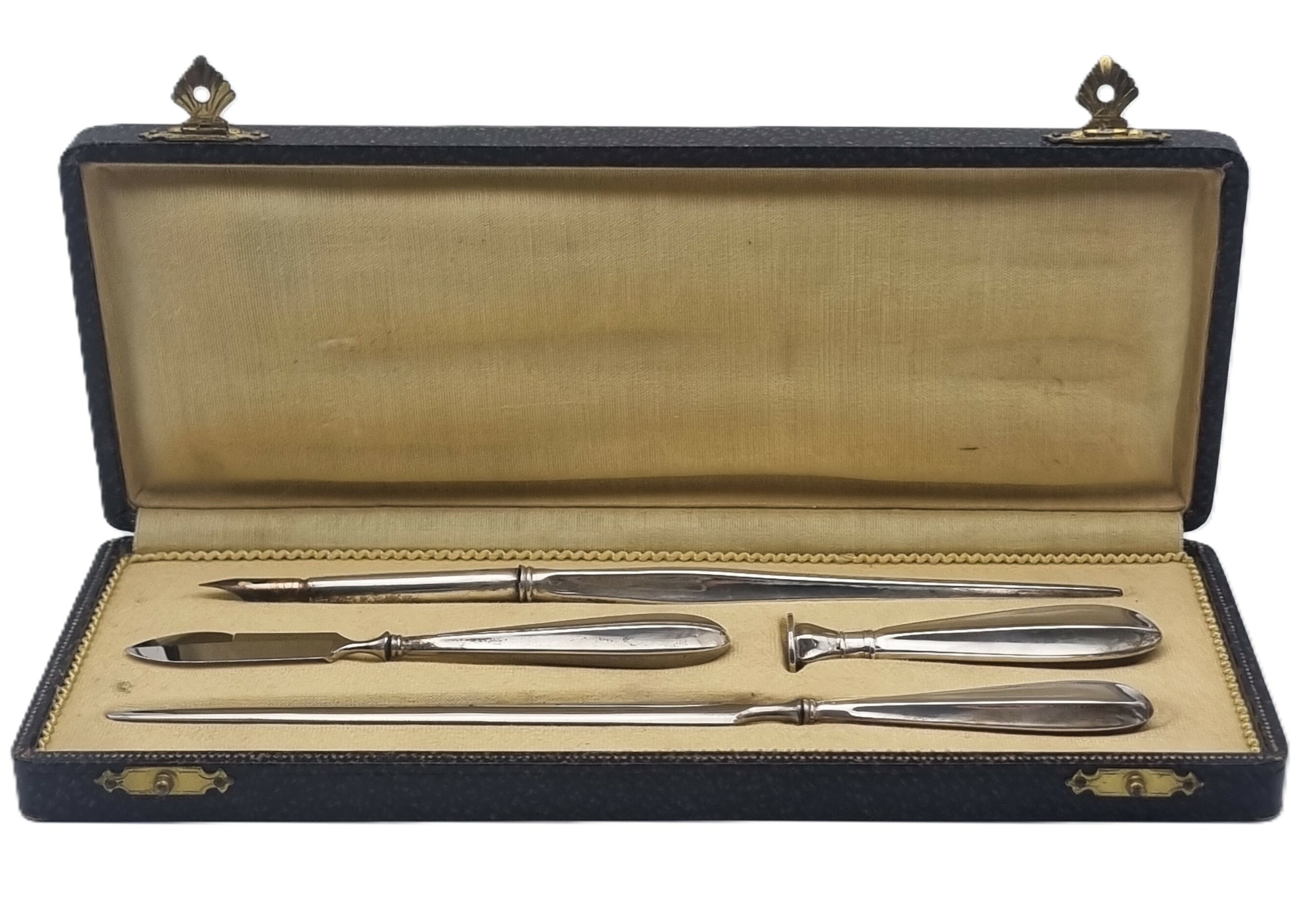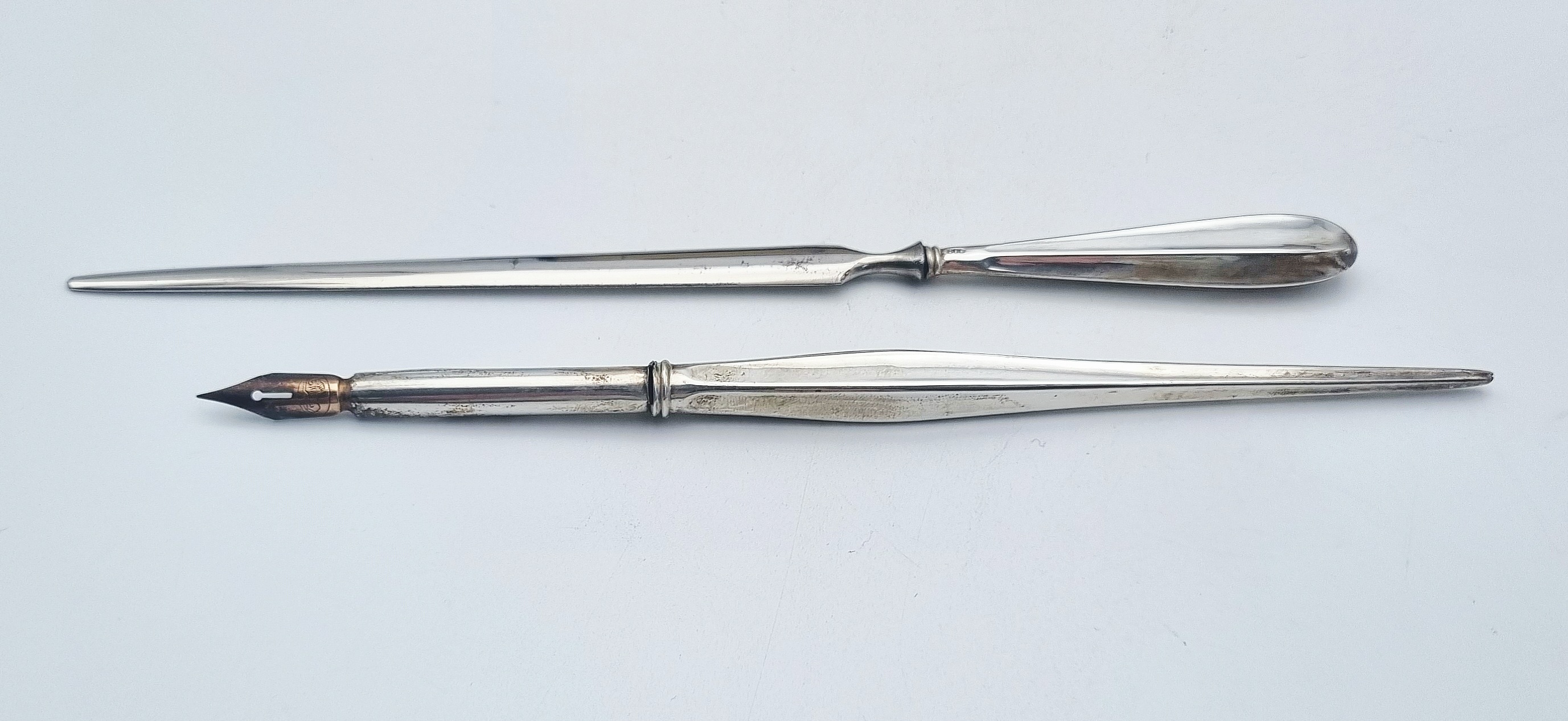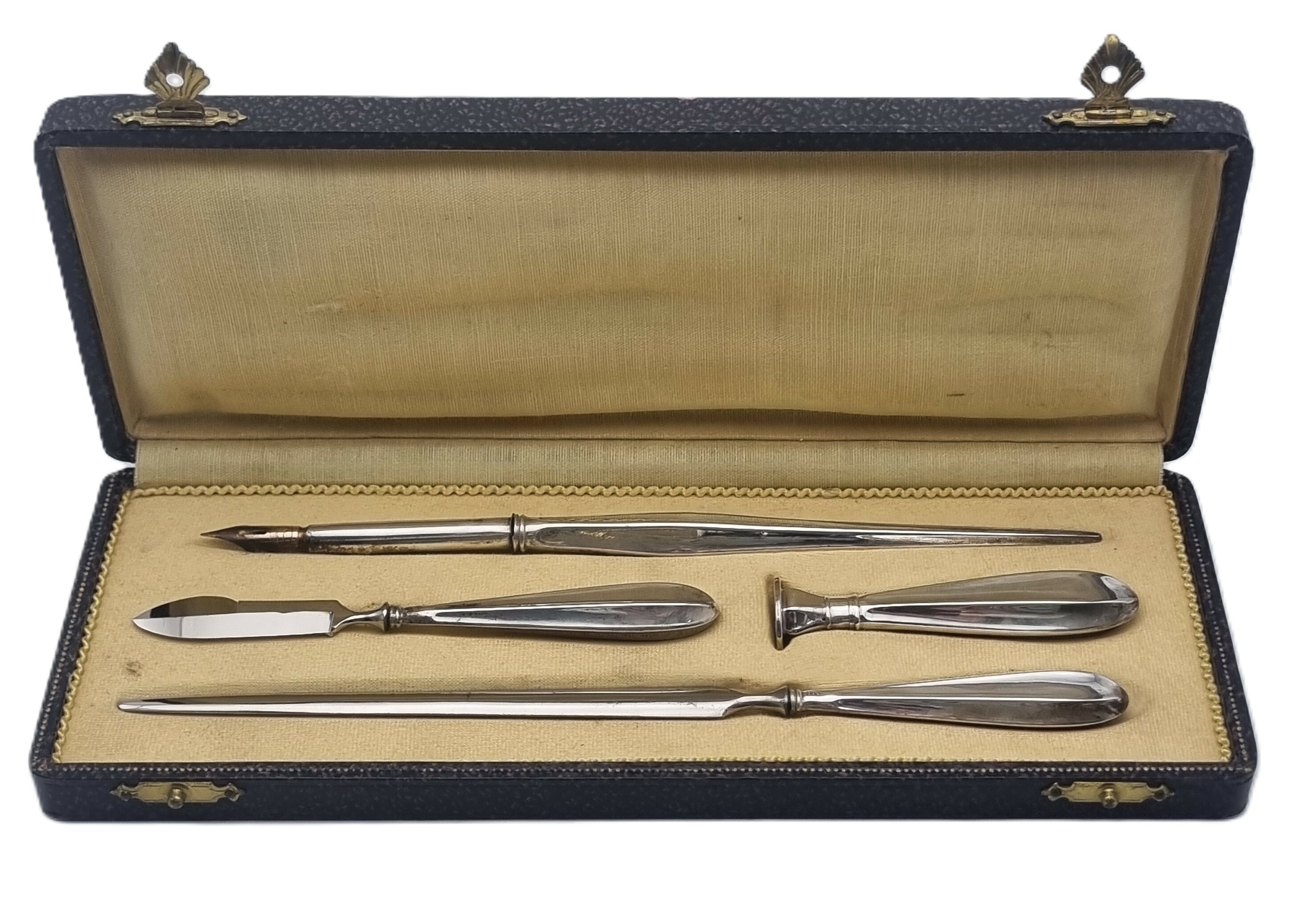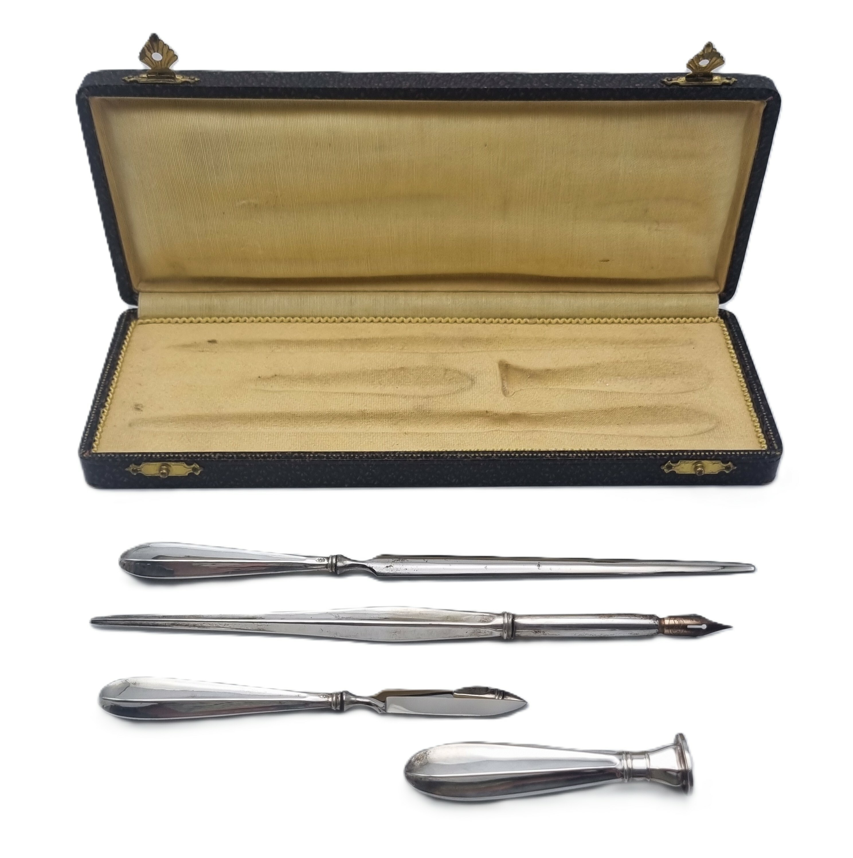 Zilveren schrijfset, eerste helft 20e eeuw, bestaande uit een kroontjespen met metalen penpunt, briefopener, lakstempel en lakmesje, alle met identieke peervormige zilveren handgrepen in neoklassieke stijl. Het geheel is uitgevoerd in zilver gemerkt halve maan met kroon en 800, gepresenteerd in het originele doosje. Wil je direct deelnemen? Plaats vanaf 22 augustus alvast een schriftelijk bod via onze website! |