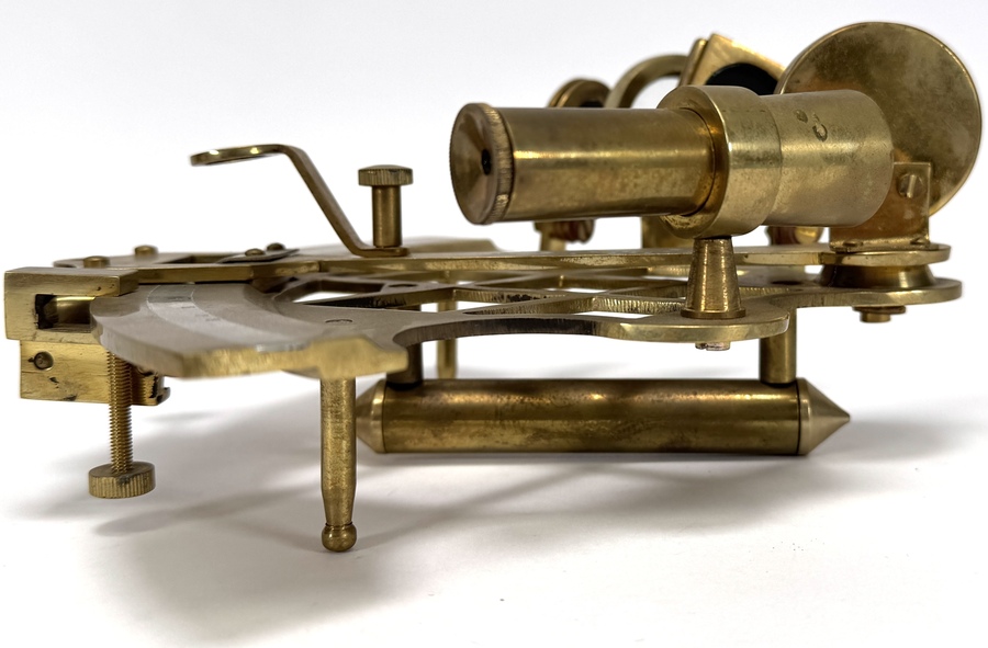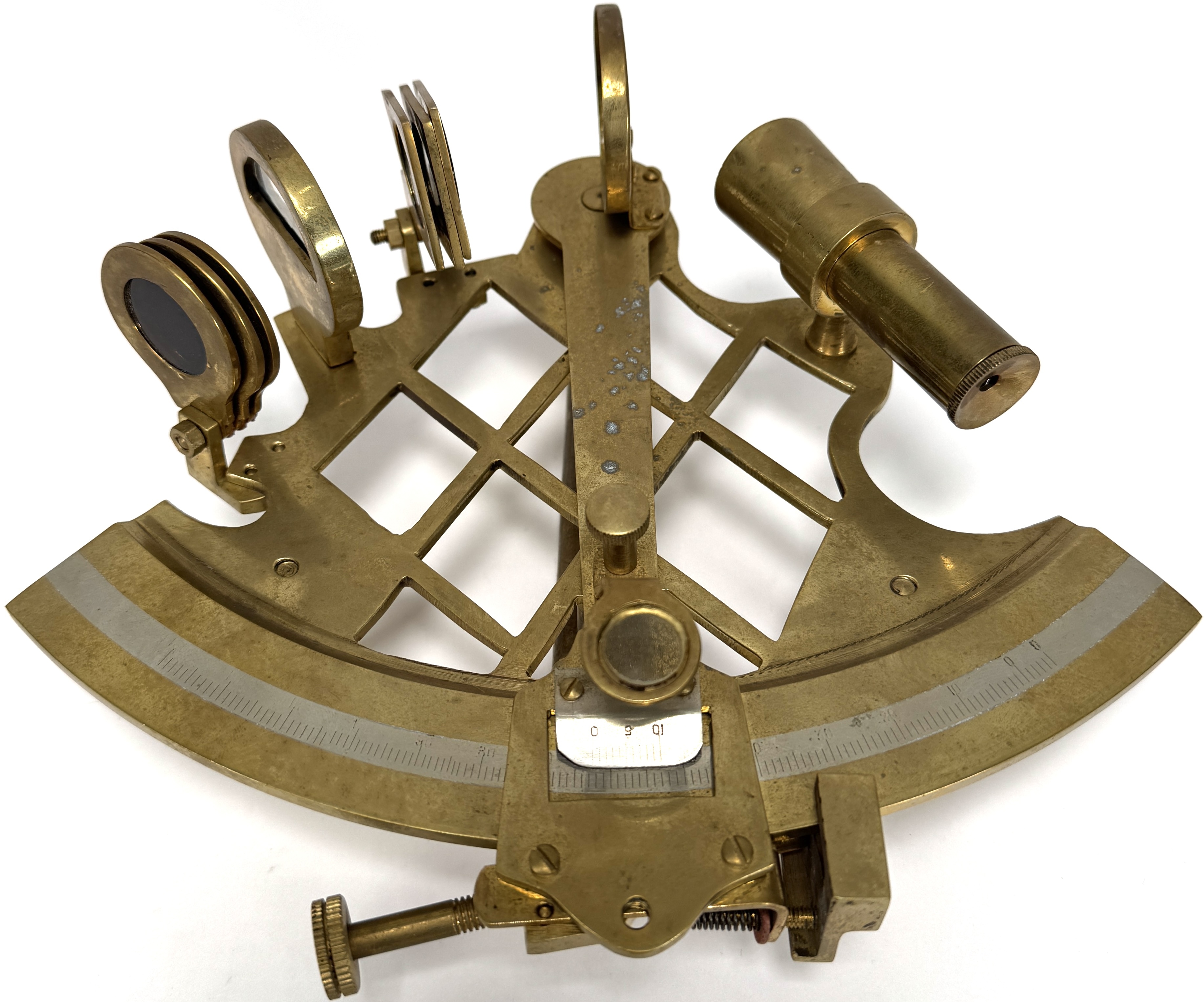 Messing sextant uit de eerste helft van de 20e eeuw, uitgevoerd met opengewerkt raamwerk, vernier schaalverdeling, spiegels en optische filters. Het navigatie instrument is voorzien van een kleine telescoop, meerdere draaibare filterglazen en fijnmechanische schroeven voor nauwkeurige afstelling. Geplaatst in een houten opbergkist met metalen sluitingen. Klaar om te bieden? Registreer je nu en doe mee aan de veiling! |