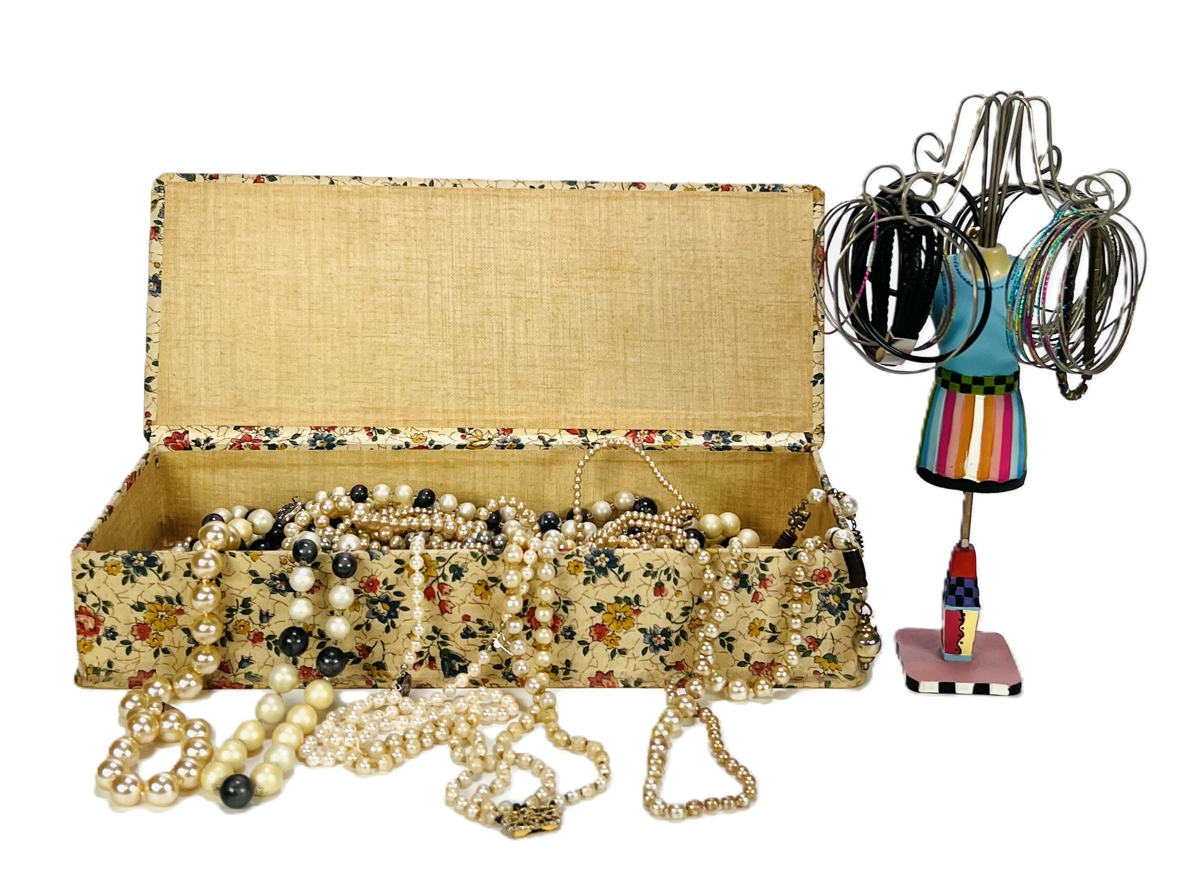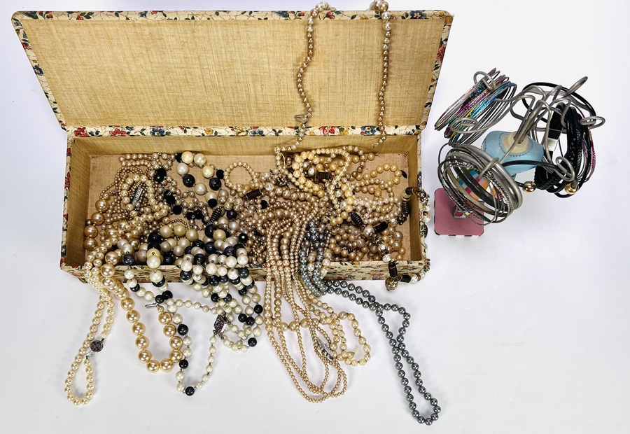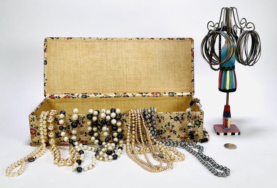 De collectie bestaat uit een met bloemen bedrukte doos met imitatieparelkettingen en een sieradenstandaard met armbanden, gedateerd tweede helft van de 20e eeuw. Deze kettingen en armbanden zelf beoordelen? Je bent welkom op onze kijkdagen op 29, 30 en 31 augustus! |