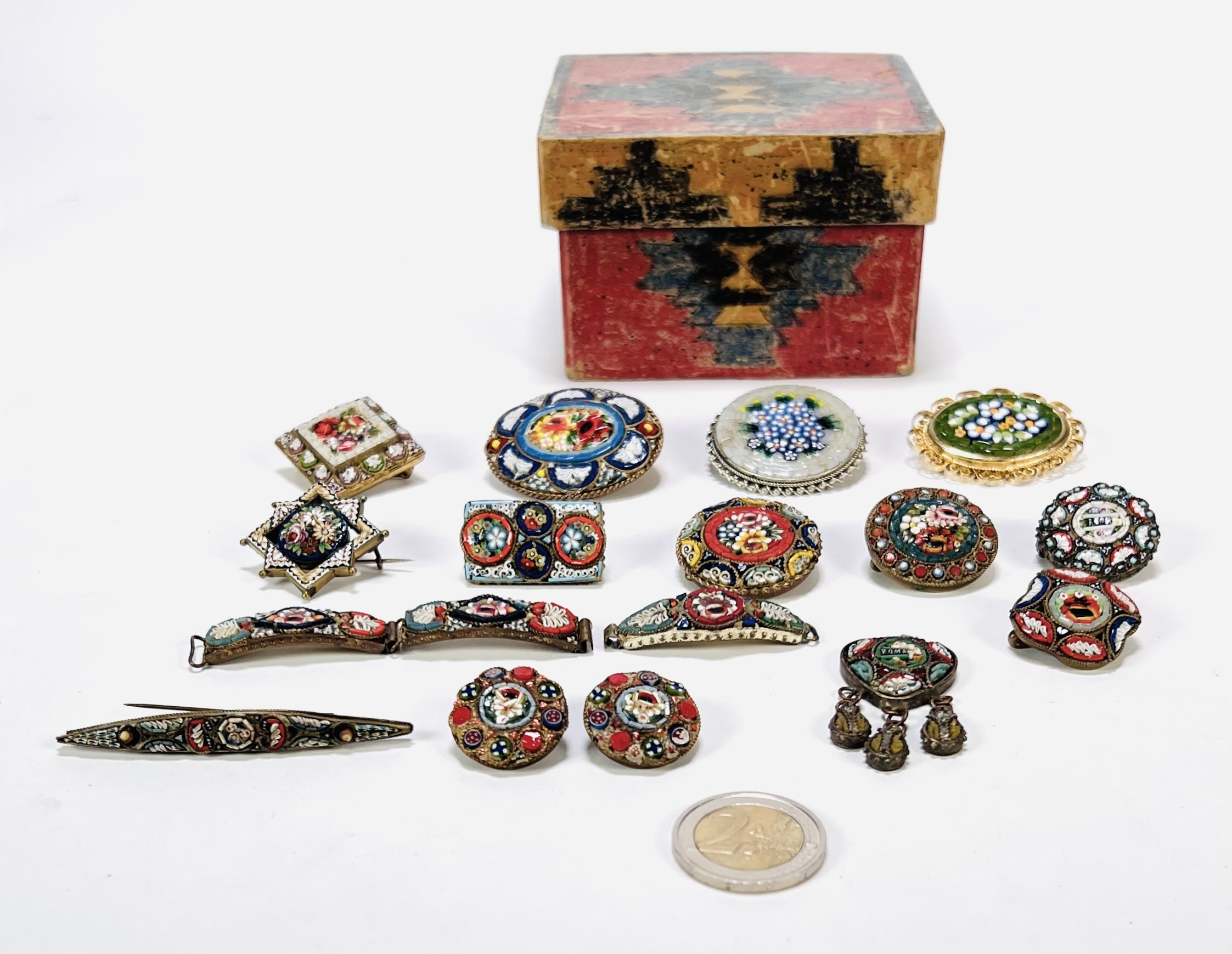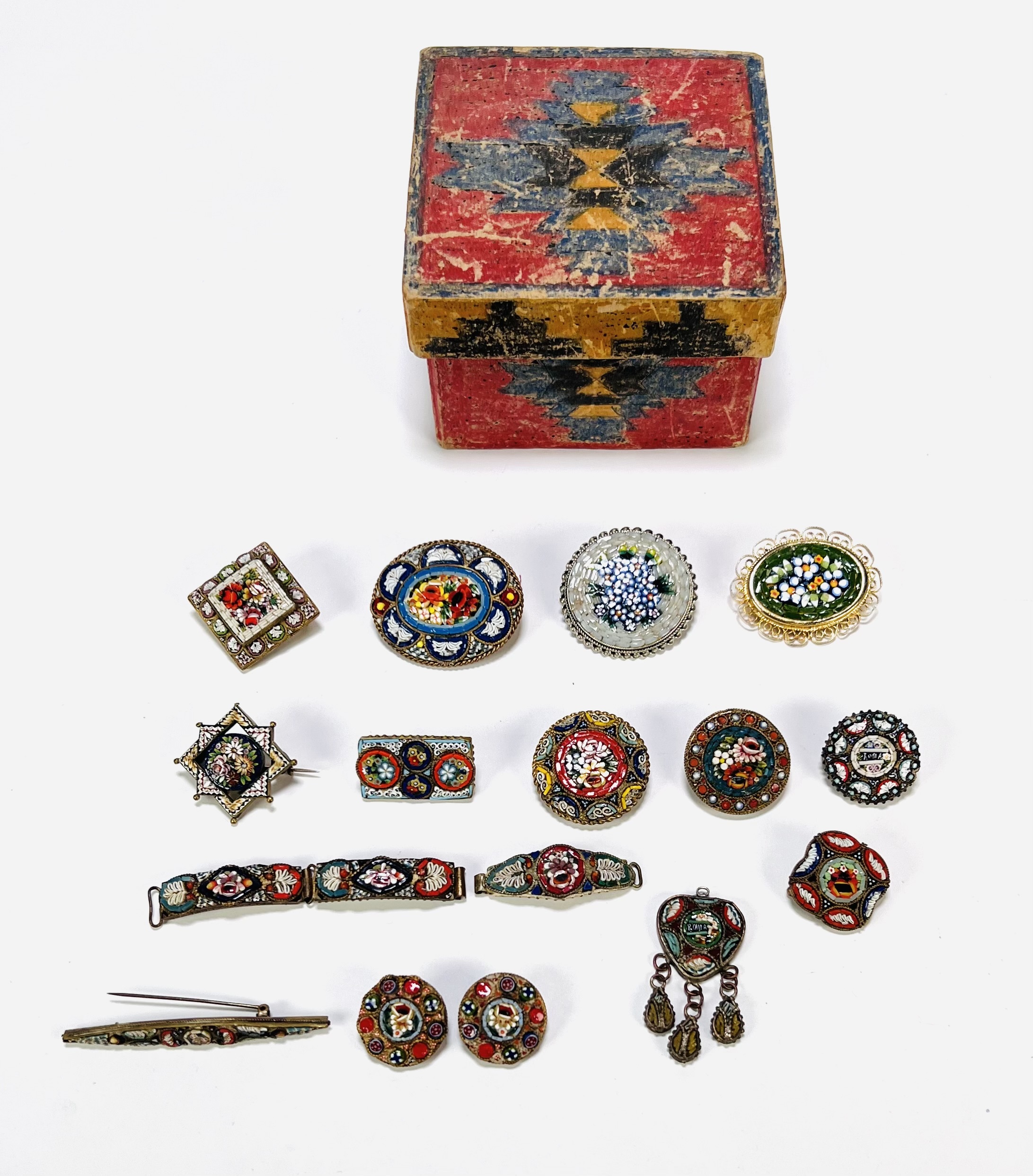 Verzameling van vijftien Italiaanse sieraden in een doosje, daterend van de eerste helft van de 20e eeuw. De sieraden zijn uitgevoerd in de micro mozaïektechniek en vertegenwoordigen de neoclassicistische en romantische stijl. De verzameling bestaat uit broches, oorhangers en een armband met verschillende bloemmotieven en abstracte patronen. Geïnteresseerd? Bezoek onze kijkdagen op 29, 30 of 31 augustus van 11:00 tot 17:00 uur! |