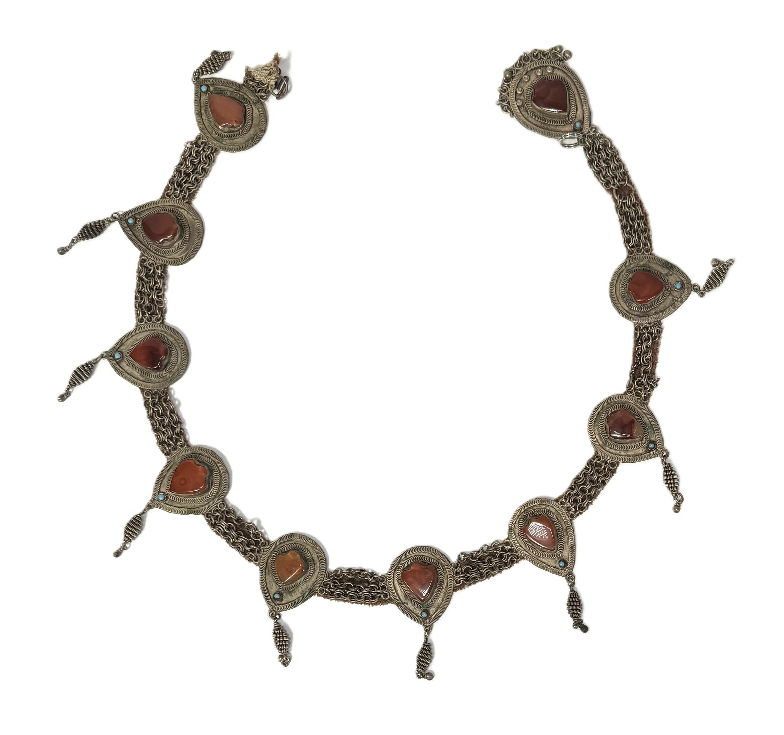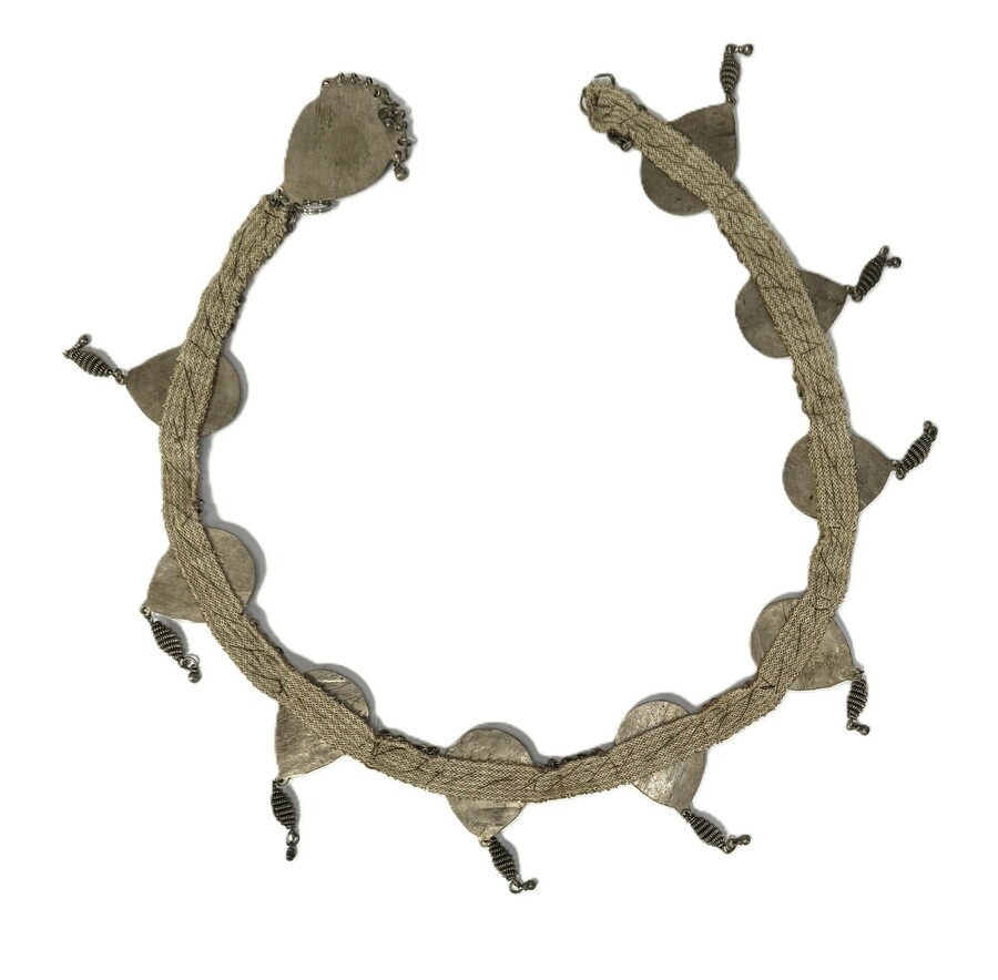 Sieradenriem uit de 20e eeuw, vervaardigd uit textiel, verzilverd metaal bezet met carneoolstenen in druppelvormige monturen. De riem toont gegraveerde decoratie, spiraalvormige hangers en een constructie van schakels en textiel. De riem is uitgevoerd in traditionele tribale stijl en diende als ceremoniële en decoratieve gordel. Geïnteresseerd? Bezoek onze kijkdagen op 29, 30 of 31 augustus van 11:00 tot 17:00 uur! |