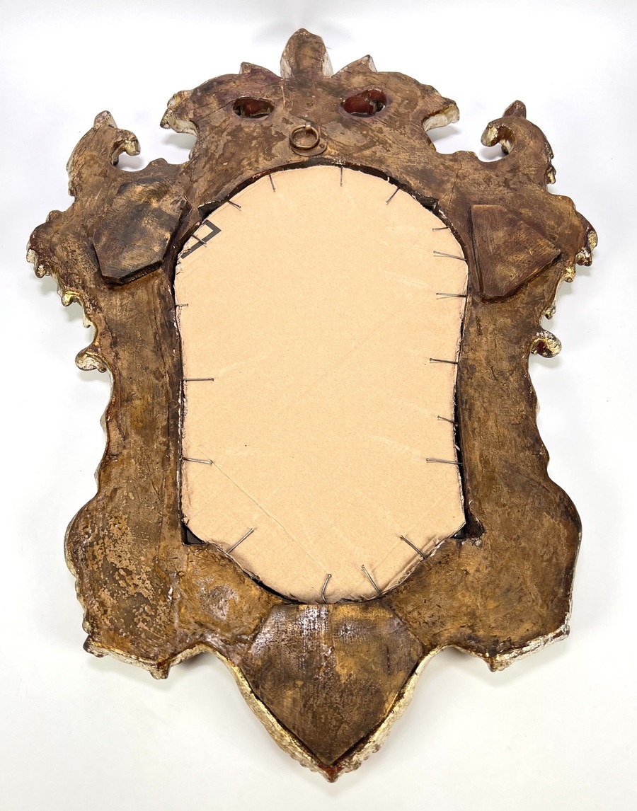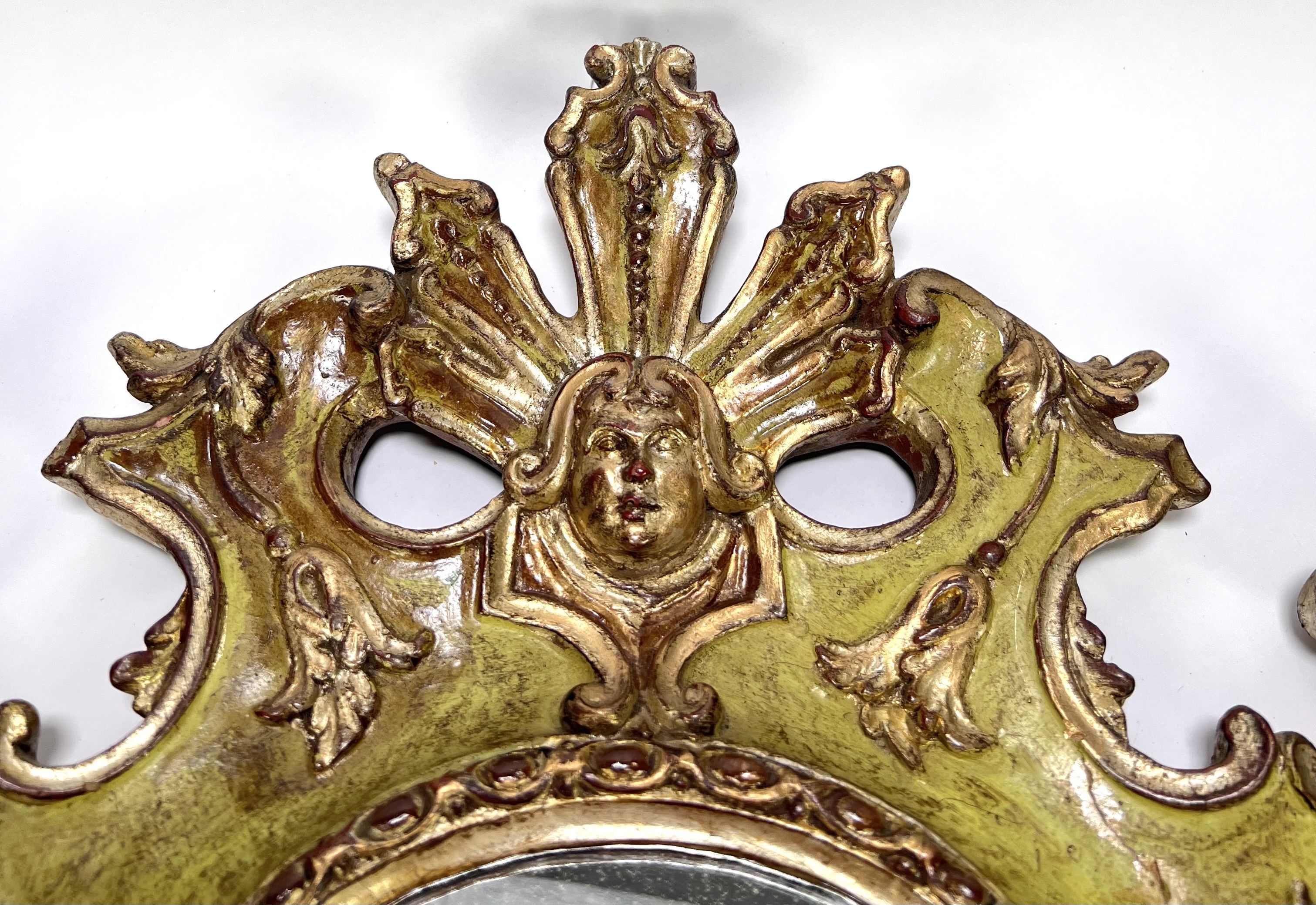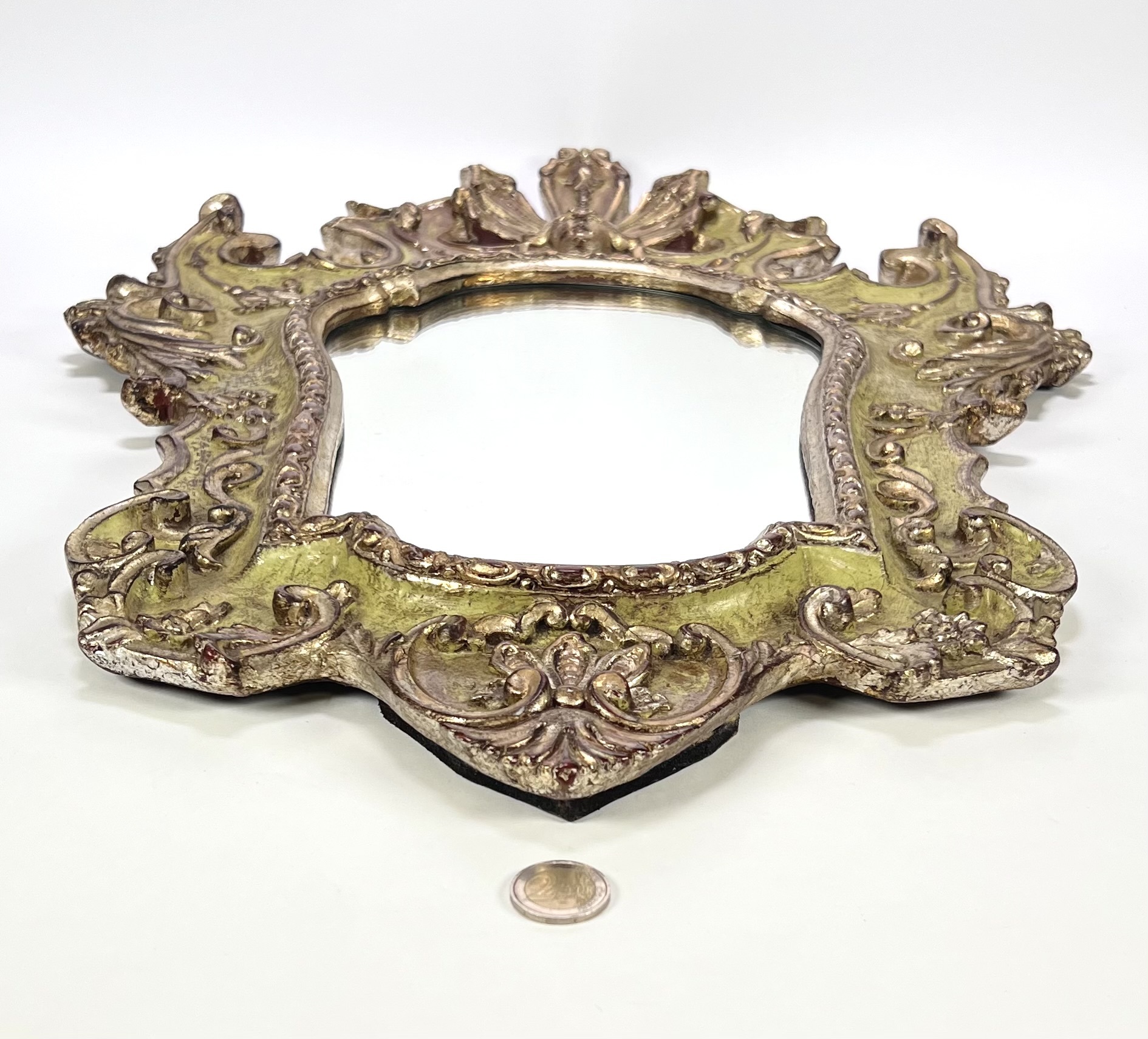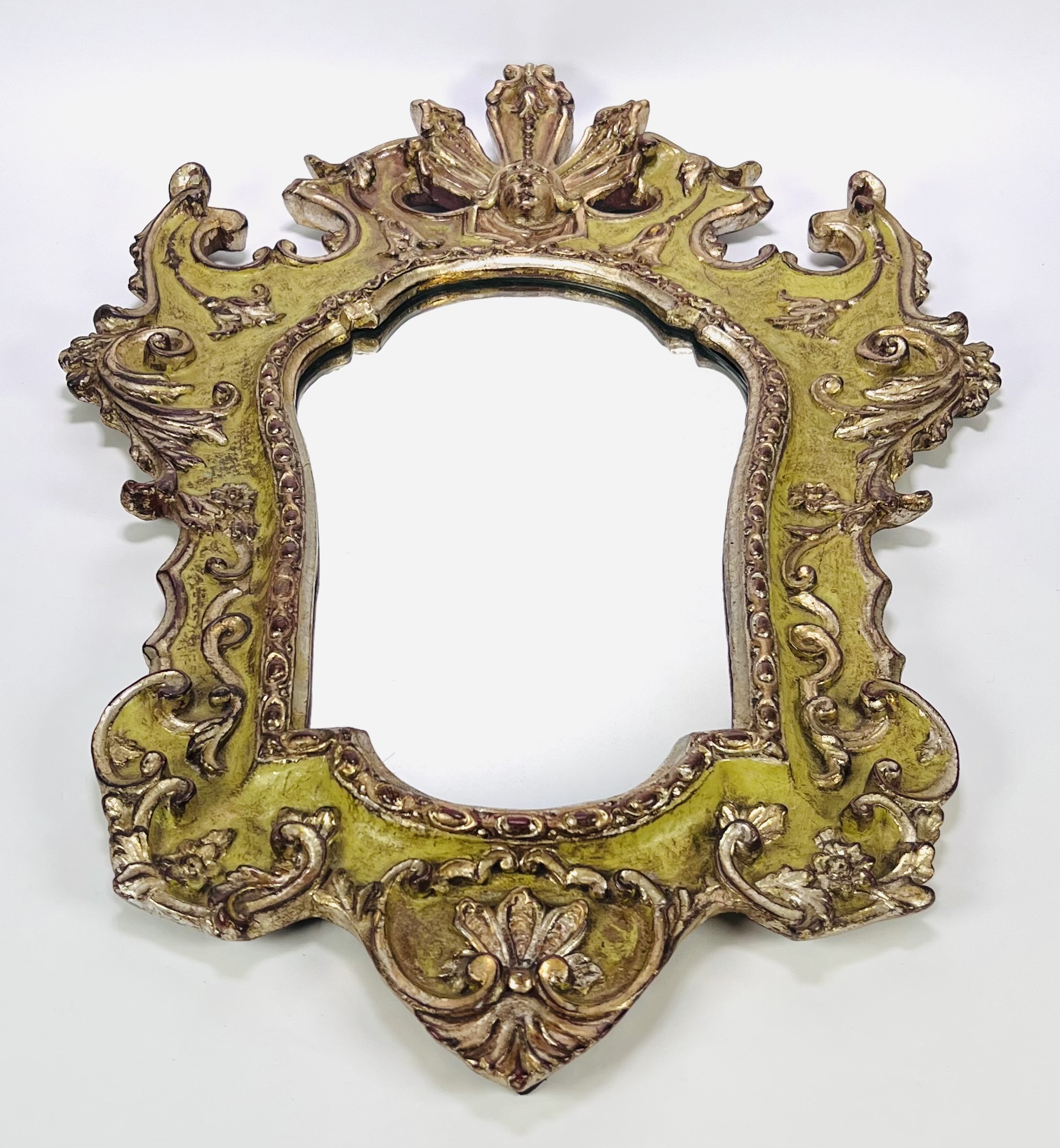 Barokstijl spiegel met goudkleurig en groen gepolychromeerd houten lijstwerk, midden 20e eeuw. De omlijsting bevat florale ornamenten en een cherubijnmasker aan de bovenzijde. Geïnteresseerd? Bezoek onze kijkdagen op 29, 30 of 31 augustus van 11:00 tot 17:00 uur. |