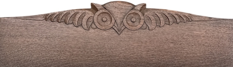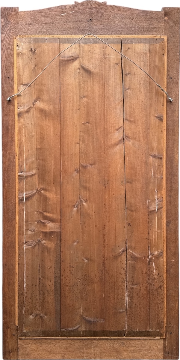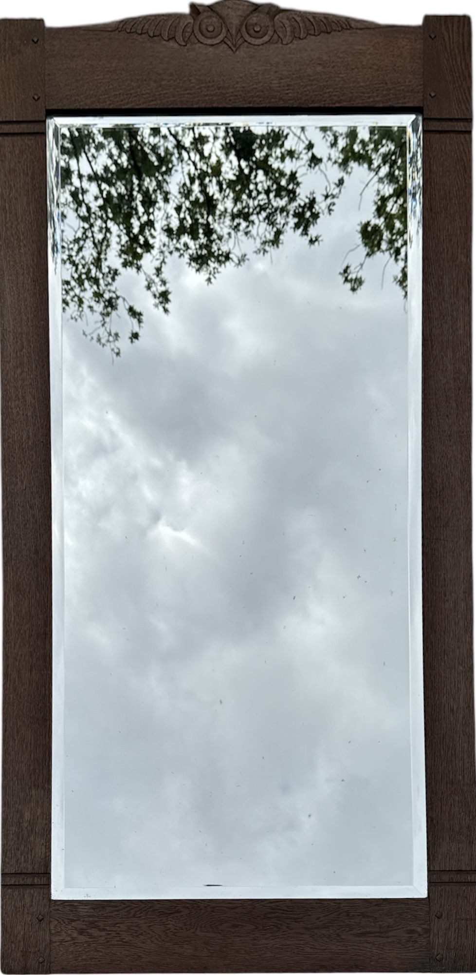 Eikenhouten Art Deco spiegel, jaren 1920–1930, uitgevoerd met rechthoekig houten frame en bovenaan een gestileerde houtsnede in de vorm van een uilenkop met vleugelmotieven. Het object is vervaardigd uit eikenhout en spiegelglas en toont strakke lijnen en symmetrische verhoudingen. Aan de achterzijde is een houten paneelconstructie met metalen ophangdraad aanwezig. Klaar om te bieden? Registreer je nu en doe mee aan de veiling! |