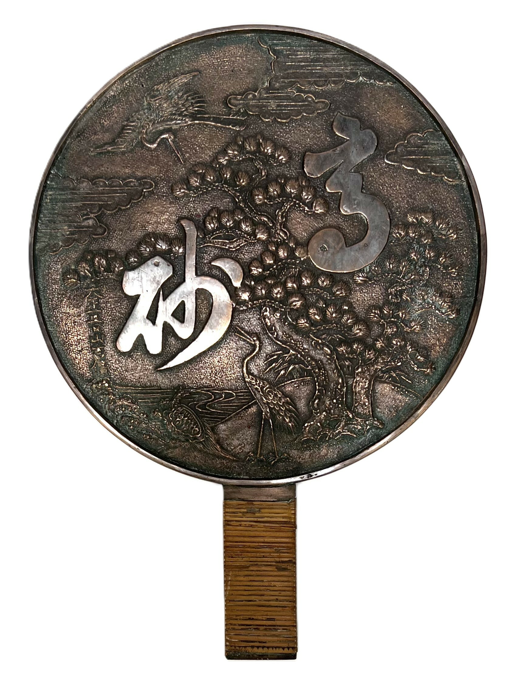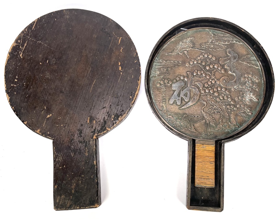 Japanse bronzen handspiegel in zwarte houten doos, Edo/Meiji-periode, tweede helft 19e eeuw. De spiegel heeft een gepolijste voorzijde en een rijk bewerkte achterzijde met reliëf van kraanvogels, pijnboom, wolken en Japanse karakters. Het handvat is omwikkeld met bambo Klaar om te bieden? Registreer je nu en doe mee aan de veiling! |