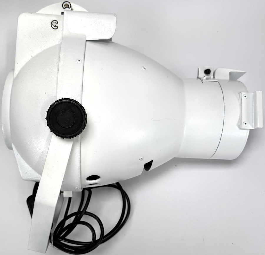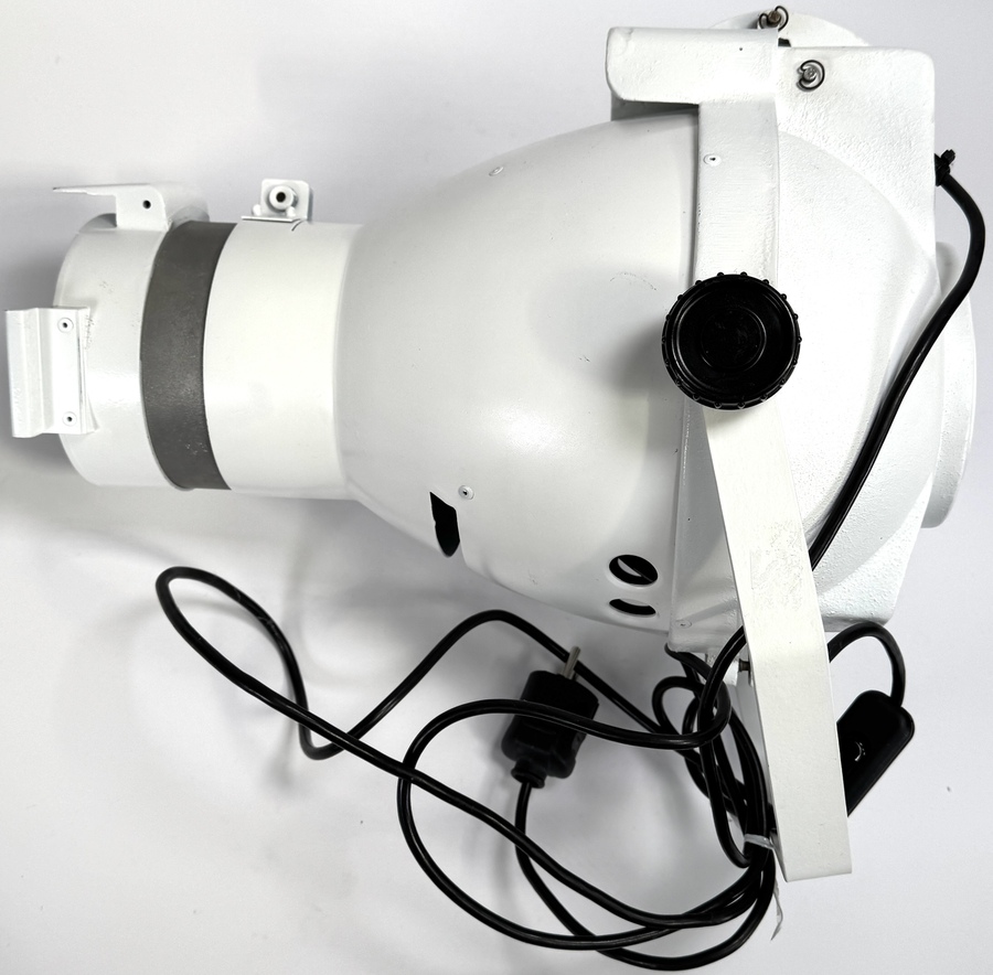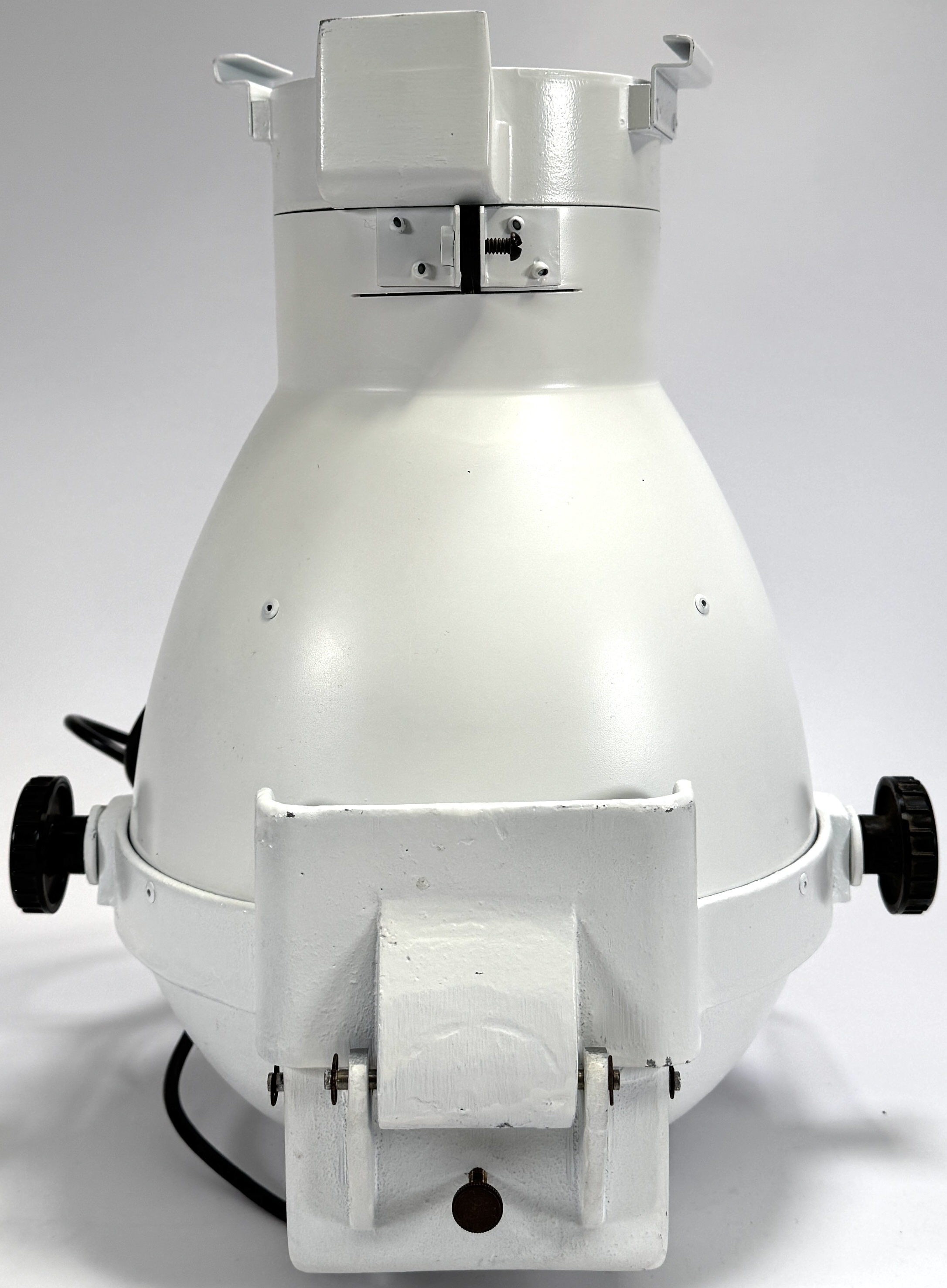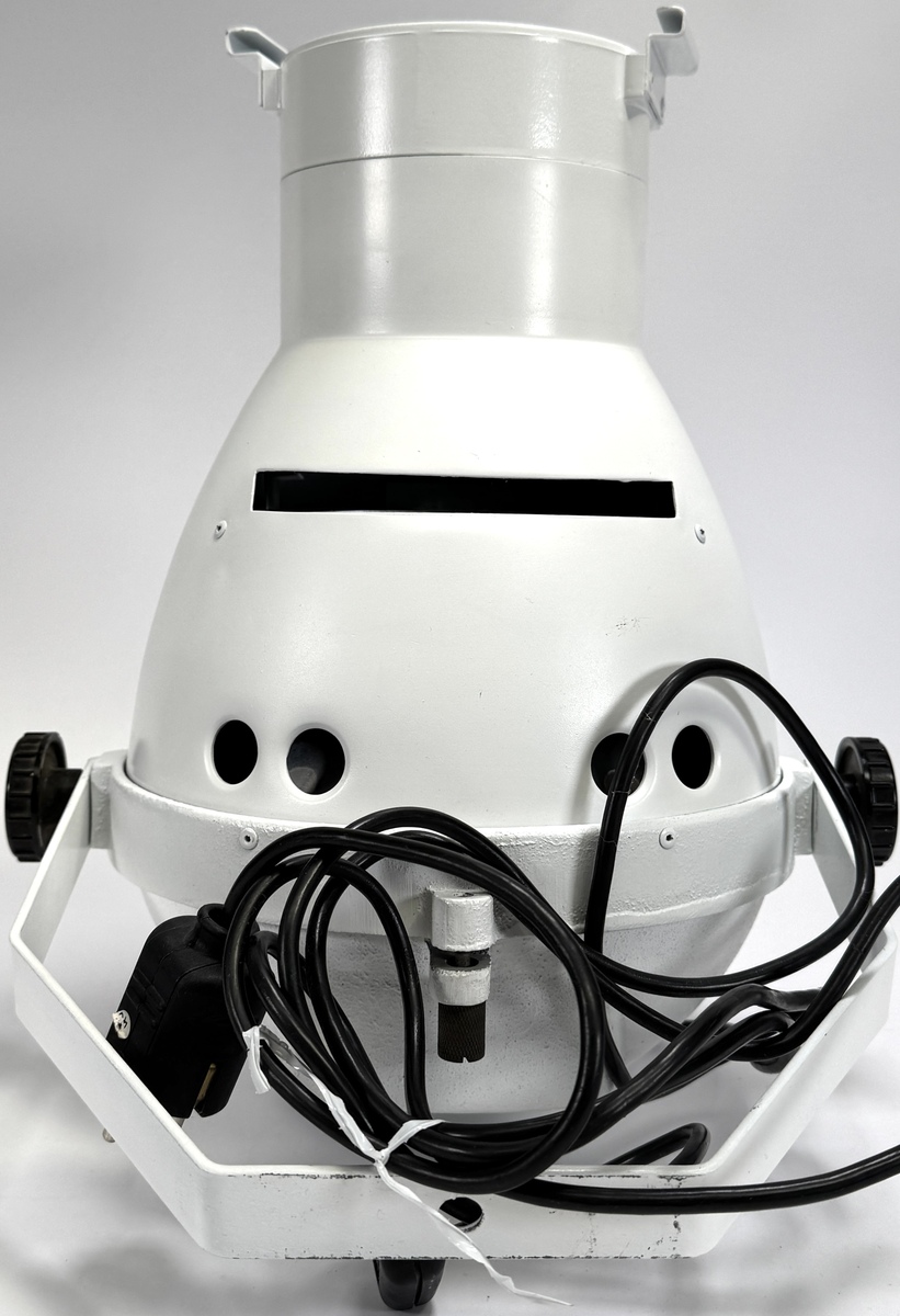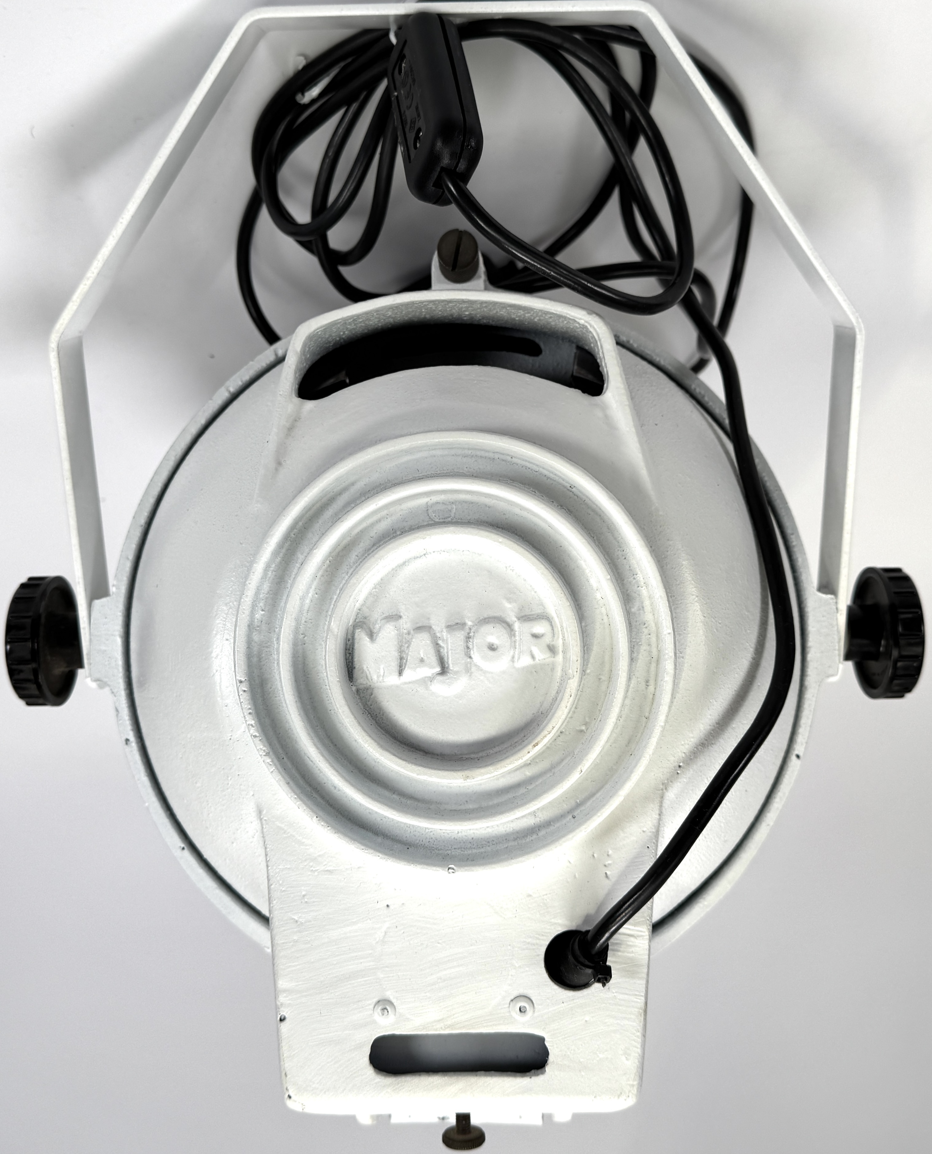 Studiolamp in industriële stijl, tweede helft 20e eeuw, vervaardigd door Major. De lamp is uitgevoerd in gietmetaal en plaatmetaal met witte lak, voorzien van een ronde behuizing met ventilatieopeningen, verstelbare metalen beugel, dikke glazen lens aan de voorzijde en vernieuwde elektrische bedrading met schakelaar. Aan de achterzijde is het merkteken “MAJOR” in reliëf aangebracht. Kom langs tijdens de kijkdagen (29 t/m 31 augustus) en ontdek deze studiolamp zelf! |