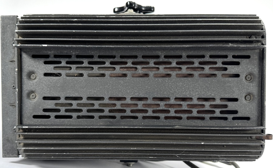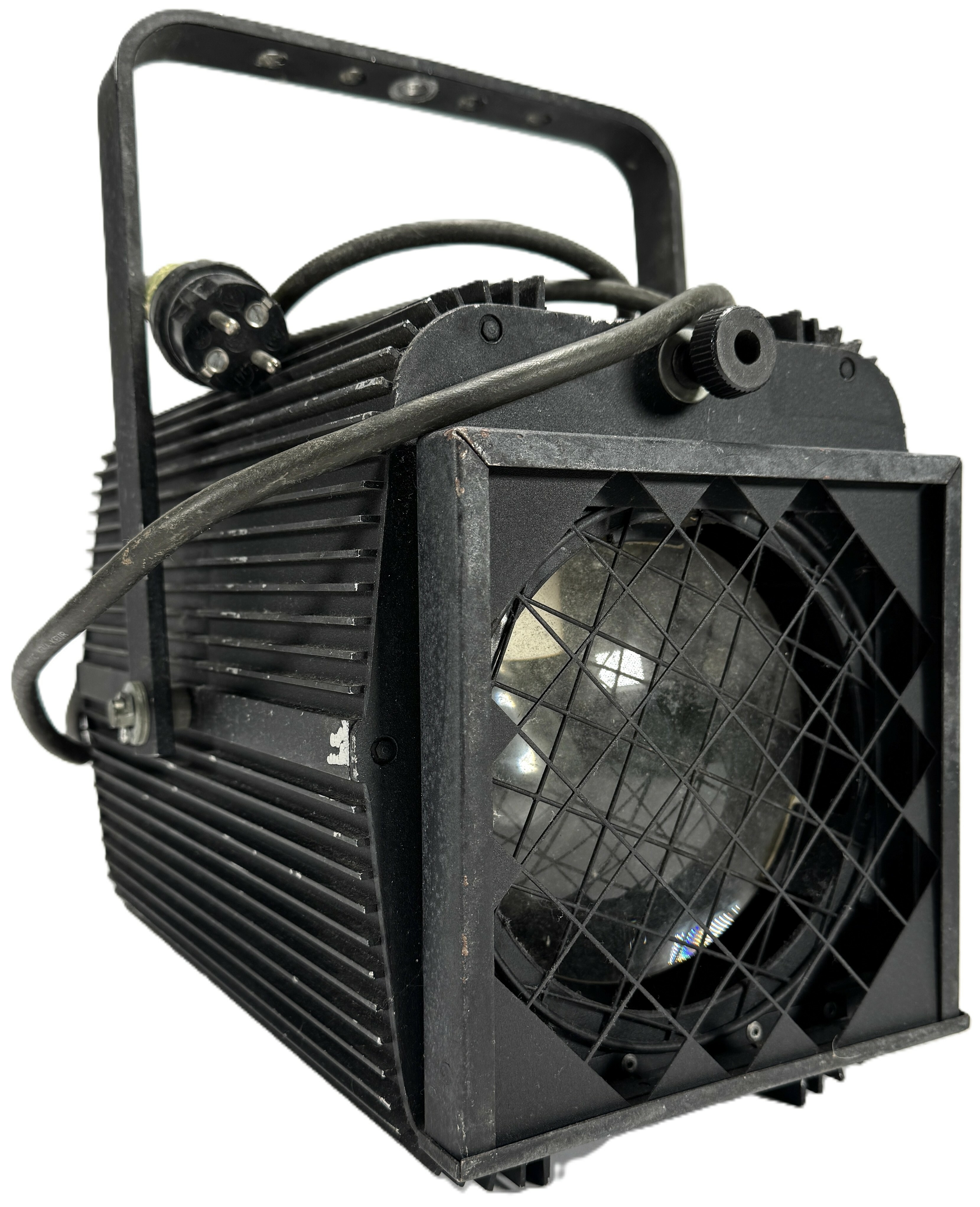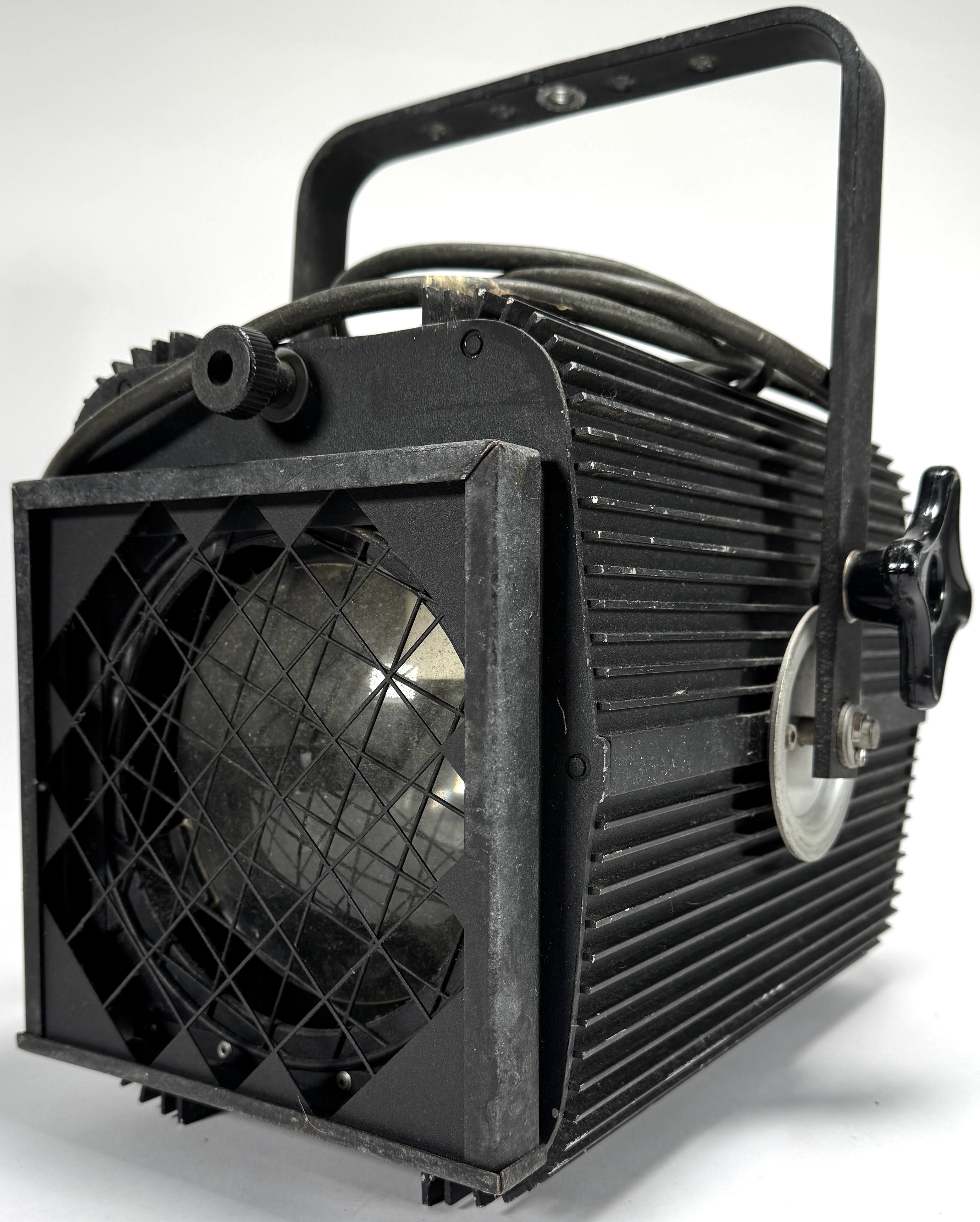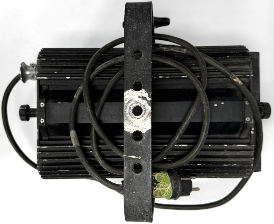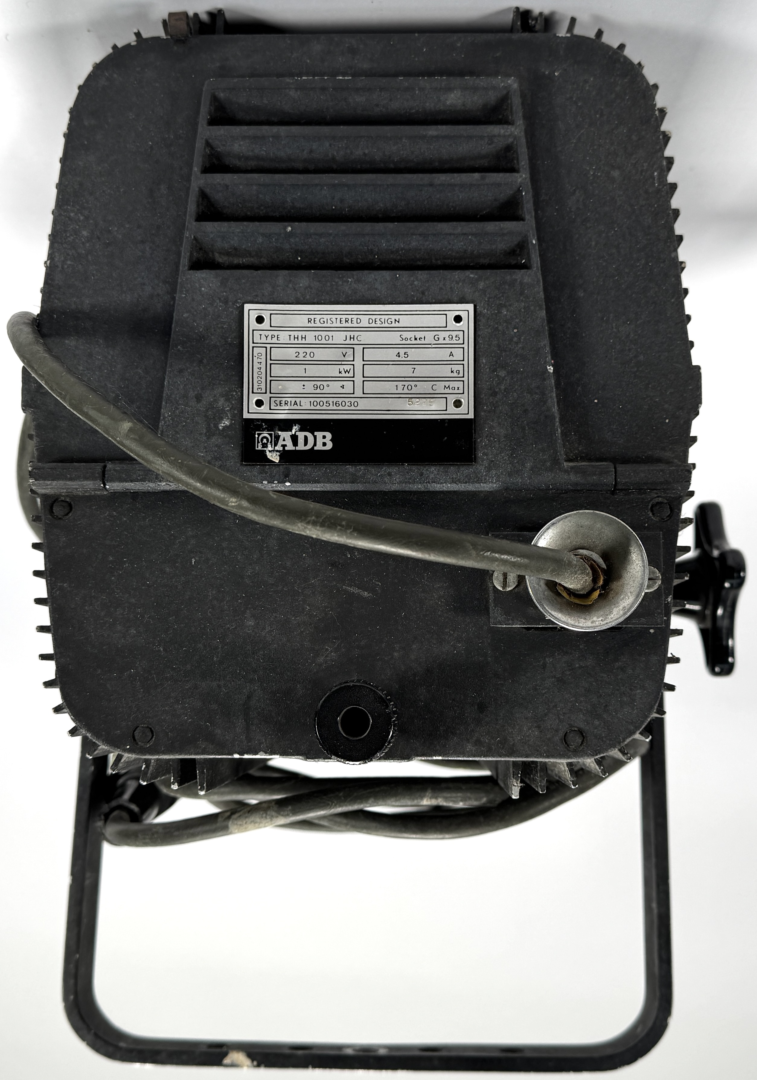 Studiolamp ADB, type THH 1001 JHC, tweede helft 20e eeuw, uitgevoerd in zwart gecoat metaal met glaslens en beschermrooster. Het typeplaatje vermeldt 220V, 4.5A, 1kW vermogen en serienummer 100516030. Kenmerkend zijn de koelribben, het beschermrooster en de verstelbare montagebeugel. De lamp is ontworpen voor professioneel gebruik in theater- en filmproducties. Kom langs tijdens de kijkdagen (29 t/m 31 augustus) en ontdek deze studiolamp zelf! |