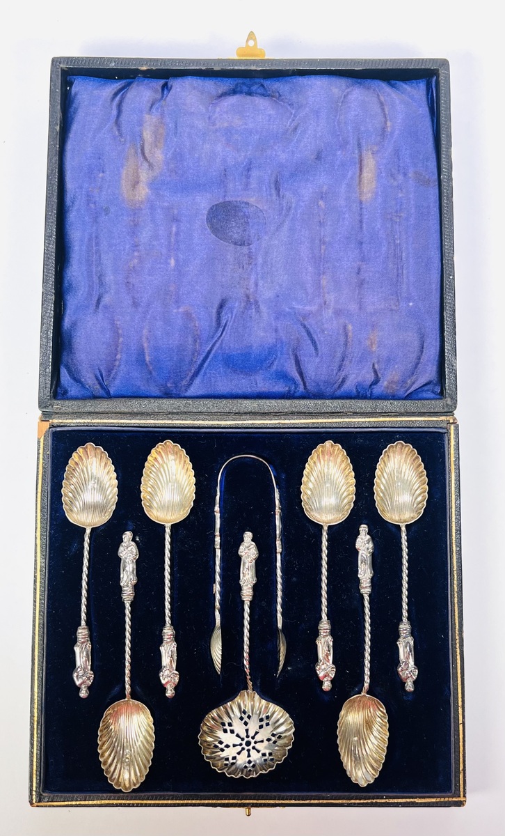 Zilveren theelepels en suikergerei in foedraal, zilver gemerkt M. Bros met jaarletter M 1871, samen met verzilverde gebaksvorkjes. De lepels en tang hebben schelpvormige bakken en gedraaide stelen, bekroond door figuren in reliëf. Klaar om te bieden? Registreer je nu en doe mee aan de veiling! |